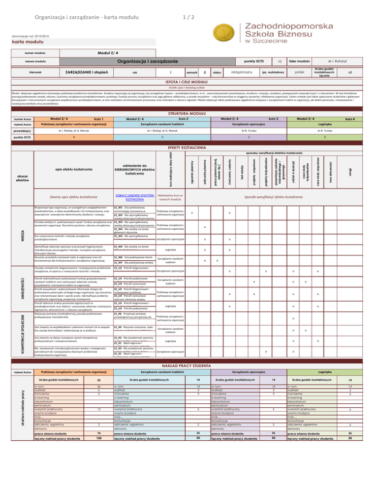 Organizacja i zarządzanie - karta modułu 1/2 obowiązuje od: 2015/2016 karta modułu Moduł Z/ 4 numer modułu Organizacja i zarządzanie nazwa modułu ZARZĄDZANIE I stopień kierunek punkty ECTS I rok 2 semestr obligatoryjny status 10 lider modułu liczba godzin kontaktowych łącznie polski jęz. wykładowy dr I. Rafaląt 68 ISTOTA I CELE MODUŁU Krótki opis i katalog celów Moduł obejmuje zagadnienia stanowiące podstawę kształcenia menedżerów. Studenci zapoznają się organizacją i jej szczególnym typem – przedsiębiorstwem, m.in. uwarunkowaniami powstawania, struktury i rozwoju, zasobami, powiązaniami wewnętrznymi i z otoczeniem. W tym kontekście poznają podstawowe zasady, obszary i poziomy zarządzania przedsiębiorstwem, przebieg i funkcje procesu zarządzania oraz jego główne zakłócenia, a przede wszystkim – rolę kierownictwa w osiąganiu sprawnej i efektywnej organizacji. Celem modułu jest także zapoznanie studentów z głównymi koncepcjami i instrumentami zarządzania współczesnym przedsiębiorstwem, w tym metodami zorientowanymi procesowo oraz metodami z obszaru logistyki. Moduł obejmuje także podstawowe zagadnienia związane z zarządzaniem ludźmi w organizacji, jak dobór personelu, motywowanie i rozwój pracowników oraz przywództwo. STRUKTURA MODUŁU Moduł Z/ 4 numer kursu kurs 1 kurs 2 Moduł Z/ 4 Moduł Z/ 4 kurs 3 Moduł Z/ 4 kurs 4 nazwa kursu Podstawy zarządzania i zachowania organizacji Zarządzanie zasobami ludzkimi Zarządzanie operacyjne Logistyka prowadzący dr I. Rafaląt, dr G. Maniak dr I. Rafaląt, dr G. Maniak dr B. Tundys dr B. Tundys punkty ECTS 4 2 2 2 WIEDZA Rozpoznaje typy organizacji, ze szczególnym uwzględnieniem przedsiebiorstw, a także prawidłowości ich funkcjonownia, oraz wewnętrzne i zewnętrzne determinanty działania i rozwoju. Z1_W1 Zna podstawową terminologię stosowaną w naukach Ma o zarządzaniu. Z1_W3 uporządkowaną wiedzę dotyczącą funkcjonowania organizacji ich roli w Posiada wiedzę nt. podstawowych zasad i funkcji zarządzania oraz Z1_W3 Maoraz uporządkowaną sprawności organizacji. Rozróżnia poziomy i obszary zarządzania. wiedzę dotyczącą funkcjonowania organizacji ich roli w Z1_W4 Maoraz wiedzę na temat głównych obszarów funkcjonalnych w organizacji, Zna nowoczesne techniki i metody zarządzania Z1_W3 Ma uporządkowaną przedsiębiorstwem. wiedzę dotyczącą funkcjonowania Identyfikuje własciwe operacje w procesach logistycznych, charakteryzuje poszczegolne metody i narzędzia zarządzania łańcucjem dostaw. Rozumie przesłanki zachowań ludzi w organizacji oraz ich konsekwencje dla funkcjonowania i zarządzania organizacją. KOMPETENCJE SPOŁECZNE UMIEJĘTNOŚCI Posiada umiejetność diagnozowania i rozwiązywania problemów zarządzania, w oparciu o nowoczesne techniki i metody. Z1_W6 Zna podstawowe teorie dotyczące kierowania i Z1_W7 Ma podstawową wiedzę dotyczącą procesów Z1_U2 Potrafi diagnozować i rozwiązywać problemy Z1_U3 Potrafi podejmować podstawowe decyzje dotyczące Z1_U4 Potrafi zastosować wybrane elementy wiedzy Z1_U2 Potrafi diagnozować i rozwiązywać problemy zarządzania, w tym dobrać Z1_U4 Potrafi zastosować wybrane elementy wiedzy teoretycznej w określonym Z1_U2 Potrafi diagnozować i rozwiązywać problemy Z1_U3 Potrafi podejmować podstawowe decyzje dotyczące Z1_K6 Przyjmuje postawę przedsiębiorczą; jest gotowy do podejmowania zawodowych Jest otwarty na współdziałanie i pełnienie róznych ról w zespole. Zna zasady komunikacji i wykorzystuje je w praktyce. Z1_K4 Rozumie znaczenie, stale rozwija i wykorzystuje zdolności Jest otwarty na dalsze rozwijanie swoich kompetencji profesjonalnych i interpersonalnych. Z1_K3 Ma świadomość poziomu swojej wiedzy i jest w stanie Z1_K1 Myśli logicznie i analitycznie, rozumie potrzebę Z1_K3 Ma świadomość poziomu swojej wiedzy i jest w stanie Z1_K1 Myśli logicznie i analitycznie, rozumie potrzebę uwagi inne aktywności case study zespołowo case study indywidualnie udział w dyskusji prezentacja zadania indywidualnego / grupowego projekty indywidualne projekty zespołowe Sposób weryfikacji efektu kształcenia x x Podstawy zarządzania i zachowania organizacji x Zarządzanie operacyjne x x Logistyka x x Zarządzanie zasobami ludzkimi x Z1_W4 Ma wiedzę na temat głównych obszarów Potrafi zidentyfikować podstawowe funkcje gospodarowania zasobami ludzkimi oraz zastosować właściwe metody pozyskiwania i kierowania ludźmi w organizacji. Potrafi pozyskiwać i wykorzystywać informacje służące do analizowania potencjału strategicznego organizacji i jej otoczenia, oraz interpretować dane i wyniki analiz. Identyfikuje problemy zarządzania organizacją, proponuje rozwiązania. Potrafi dokonać analizy procesów logistycznych w przedsiębiorstwie oraz dobrać i zastosowac właściwe rozwiazania logistyczne, ekonomiczne i z obszaru zarządzania. Wykazuje postawę przedsiębiorczą, posiada podstawowe predyspozycje menedżerskie. Ma świadomość interdyscyplinarności wiedzy i umiejętności potrzebnych do rozwiązywania złożonych problemów funkcjonowania organizacji. Podstawy zarządzania i zachowania organizacji test wiedzy Adekwatny kurs w ramach modułu ćwiczenia, zadania ZOBACZ LEGENDĘ EFEKTÓW KSZTAŁCENIA praca pisemna (esej, referat, itp.) Zwarty opis efektu kształcenia obszar efektów zaliczenie pisemne odniesienie do KIERUNKOWYCH efektów kształcenia sposoby weryfikacji efektów kształcenia egzamin pisemny opis efektu kształcenia kurs realizujący dany efekt EFEKTY KSZTAŁCENIA x x Zarządzanie operacyjne x Zarządzanie zasobami ludzkimi Podstawy zarządzania i zachowania organizacji x Logistyka x x x x x x x x x x Podstawy zarządzania i zachowania organizacji x Zarządzanie zasobami ludzkimi x Logistyka x x Zarządzanie operacyjne x x x x NAKŁAD PRACY STUDENTA nazwa kursu Podstawy zarządzania i zachowania organizacji struktura nakładu pracy liczba godzin kontakt