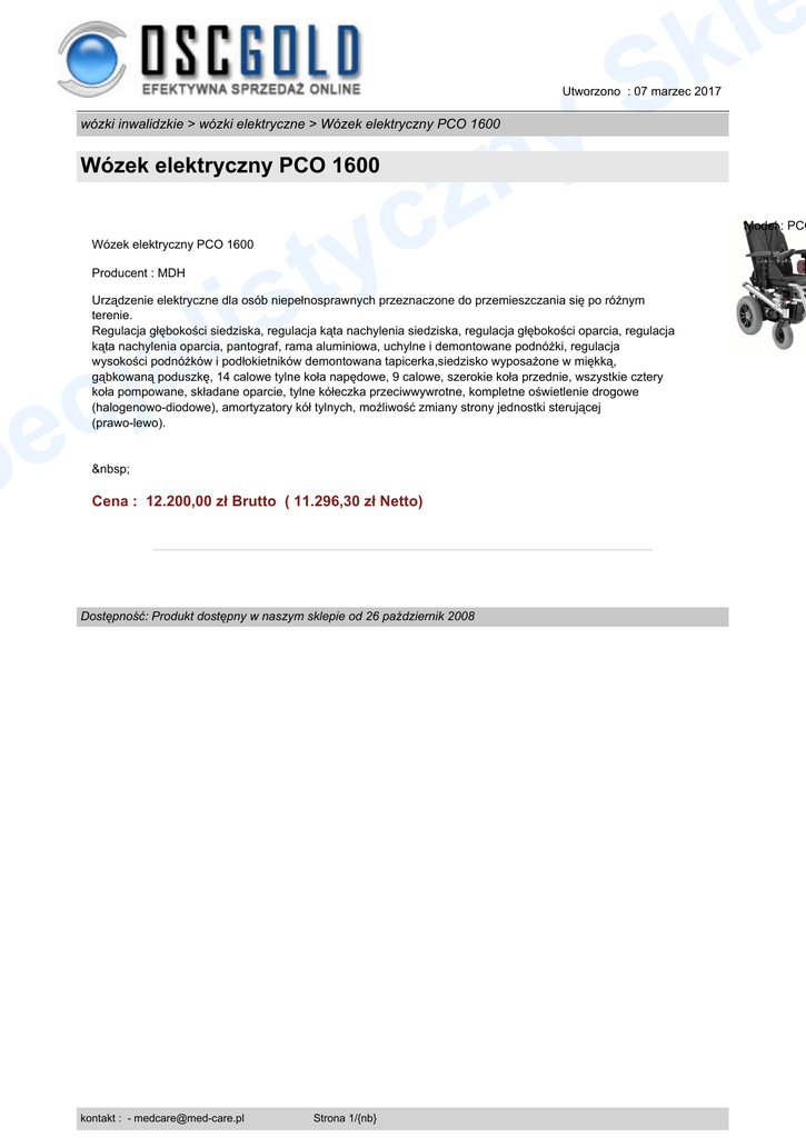 e p S y e l k Utworzono : 07 marzec 2017 n z wózki inwalidzkie > wózki elektryczne > Wózek elektryczny PCO 1600 Wózek elektryczny PCO 1600 Wózek elektryczny PCO 1600 c y t s i l a Producent : MDH Urządzenie elektryczne dla osób niepełnosprawnych przeznaczone do przemieszczania się po różnym terenie. Regulacja głębokości siedziska, regulacja kąta nachylenia siedziska, regulacja głębokości oparcia, regulacja kąta nachylenia oparcia, pantograf, rama aluminiowa, uchylne i demontowane podnóżki, regulacja wysokości podnóżków i podłokietników demontowana tapicerka,siedzisko wyposażone w miękką, gąbkowaną poduszkę, 14 calowe tylne koła napędowe, 9 calowe, szerokie koła przednie, wszystkie cztery koła pompowane, składane oparcie, tylne kółeczka przeciwwywrotne, kompletne oświetlenie drogowe (halogenowo-diodowe), amortyzatory kół tylnych, możliwość zmiany strony jednostki sterującej (prawo-lewo). j c Cena : 12.200,00 zł Brutto ( 11.296,30 zł Netto) Dostępność: Produkt dostępny w naszym sklepie od 26 październik 2008 kontakt : - [email protected] Strona 1/{nb} Model : PCO