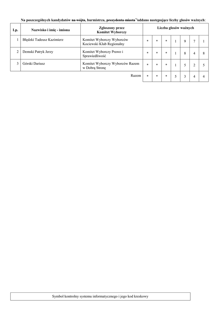 Na poszczególnych kandydatów na wójta, burmistrza, prezydenta miasta*)oddano następujące liczby głosów ważnych: Lp. Nazwisko i imię - imiona Zgłoszony przez Komitet Wyborczy Liczba głosów ważnych 1 Błędzki Tadeusz Kazimierz Komitet Wyborczy Wyborców Kociewski Klub Regionalny * * * 1 9 7 1 2 Demski Patryk Jerzy Komitet Wyborczy Prawo i Sprawiedliwość * * * 1 8 4 8 3 Górski Dariusz Komitet Wyborczy Wyborców Razem w Dobrą Stronę * * * 1 5 2 5 * * * 5 3 4 4 Razem Symbol kontrolny systemu informatycznego i jego kod kreskowy