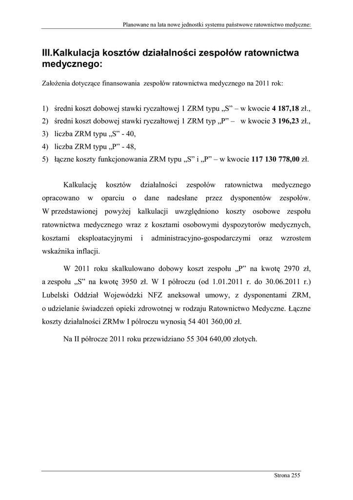III. Kalkulacja kosztów działalności zespołów ratownictwa medycznego