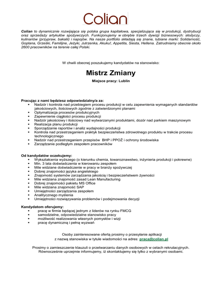 Colian to dynamicznie rozwijająca się polska grupa kapitałowa, specjalizująca się w produkcji, dystrybucji oraz sprzedaży artykułów spożywczych. Funkcjonujemy w obrębie trzech dywizji biznesowych: słodyczy, kulinariów (przypraw, bakalii) i napojów. Na nasze portfolio składają się znane, lubiane marki: Solidarność, Goplana, Grześki, Familijne, Jeżyki, Jutrzenka, Akuku!, Appetita, Siesta, Hellena. Zatrudniamy obecnie około 2600 pracowników na terenie całej Polski. W chwili obecnej poszukujemy kandydatów na stanowisko: Mistrz Zmiany Miejsce pracy: Lublin Pracując z nami będziesz odpowiedzialny/a za: Nadzór i kontrola nad przebiegiem procesu produkcji w celu zapewnienia wymaganych standardów jakościowych, ilościowych zgodnie z zatwierdzonymi planami Optymalizacja procesów produkcyjnych Zapewnienie ciągłości procesu produkcji Nadzór jakościowy i ilościowy nad wytwarzanymi produktami, dozór nad parkiem maszynowym Realizacja planu produkcji Sporządzanie raportów i analiz wydajności produkcji Kontrola nad przestrzeganiem praktyk bezpieczeństwa zdrowotnego produktu w trakcie procesu technologicznego Nadzór nad przestrzeganiem przepisów BHP i PPOŻ i ochrony środowiska Zarządzanie podległym zespołem pracowników Od kandydatów oczekujemy: Wykształcenia wyższego (o kierunku chemia, towaroznawstwo, inżynieria produkcji i pokrewne) Min. 3 lata doświadczenia w kierowaniu zespołem Mile widziane doświadczenie w pracy w branży spożywczej Dobrej znajomości języka angielskiego Znajomość systemów zarządzania jakością i bezpieczeństwem żywności Mile widziana znajomość zasad Lean Manufacturing Dobrej znajomości pakietu MS Office Mile widziana znajomość SAP Umiejętności zarządzania zespołem Analitycznego myślenia Umiejętności rozwiązywania problemów i podejmowania decyzji Kandydatom oferujemy: pracę w firmie będącej jednym z liderów na rynku FMCG samodzielne, odpowiedzialne stanowisko pracy możliwość realizowania własnych pomysłów i wizji pracę dynamiczną i pełną wyzwań Osoby zainteresowane ofertą prosimy o przesyłanie aplikacji z nazwą stanowiska w tytule wiadomości na adres: [email protected] Prosimy o zamieszczenie klauzuli o przetwarzaniu danych osobowych w celach rekrutacyjnych. Równocześnie uprzejmie informujemy, iż skontaktujemy się tylko z wybranymi osobami.