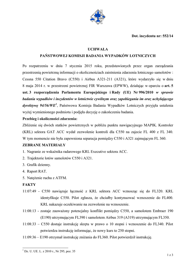 Dot. incydentu nr: 552/14 UCHWAŁA PAŃSTWOWEJ KOMISJI BADANIA WYPADKÓW LOTNICZYCH Po rozpatrzeniu w dniu 7 stycznia 2015 roku, przedstawionych przez organ zarządzania przestrzenią powietrzną informacji o okolicznościach zaistnienia zdarzenia lotniczego samolotów : Cessna 550 Citation Bravo (C550) i Airbus A321-211 (A321), które wydarzyło się w dniu 8 maja 2014 r. w przestrzeni powietrznej FIR Warszawa (EPWW), działając w oparciu o art. 5 ust. 3 rozporządzenia Parlamentu Europejskiego i Rady (UE) Nr 996/2010 w sprawie badania wypadków i incydentów w lotnictwie cywilnym oraz zapobiegania im oraz uchylającego dyrektywę 94/56/WE1, Państwowa Komisja Badania Wypadków Lotniczych przyjęła ustalenia wyżej wymienionego podmiotu i podjęła decyzję o zakończeniu badania. Przebieg i okoliczności zdarzenia: Zbliżenie się dwóch statków powietrznych w pobliżu punktu nawigacyjnego MAPIK. Kontroler (KRL) sektora GAT ACC wydał zezwolenie kontroli dla C550 na zajecie FL 400 z FL 340. W tym momencie nie była zapewniona separacja pomiędzy C550 i A321 zajmującym FL 360. ZEBRANE MATERIAŁY 1. Nagranie ze wskaźnika radarowego KRL Executive sektora ACC. 2. Trajektorie lotów samolotów C550 i A321. 3. Grafik dzienny. 4. Raport RAT. 5. Natężenie ruchu z ATFM. FAKTY 11:07:49 - C550 nawiązuje łączność z KRL sektora ACC wznosząc się do FL320. KRL identyfikuje C550. Pilot zgłasza, że chciałby kontynuować wznoszenie do FL400. KRL nakazuje oczekiwanie na zezwolenie na wznoszenie. 11:08:13 - zostaje zauważony potencjalny konflikt pomiędzy C550, a samolotem Embraer 190 (E190) utrzymującym FL390 i samolotem Airbus 319 (A319) utrzymującym FL350. 11:08:33 – C550 dostaje instrukcję skrętu w prawo o 10 stopni i wznoszenie do FL340. Pilot potwierdza instrukcję informując, że nowy kurs to 250 stopni. 11:09:36 – E190 otrzymał instrukcję zniżania do FL360. Pilot potwierdził instrukcję. 1 Dz. U. UE. L. z 2010 r., Nr 295, poz. 35 1z3 11:10:18 – KRL sprawdził dystans pomiędzy C550 i NJE490P a A319, który wynosił ponad 12 mil morskich (NM). 11:10:59 – E190 otrzymał instrukcję zniżania do FL330 z nakazaną prędkością zniżania 1500 stóp/min. 11:11:22 – C550 otrzymała instrukcję wznoszenia do FL400, przecina w tym momencie FL330, A321 jest za nim około 1minutę lotu na kursie rozbieżnym utrzymując FL 360. 11:11:30- KRL zmierzył dystans pomiędzy C550 i A321, który wynosił 7 NM (przewidywany minimalny dystans 6,22NM za jedną minutę). C550 przecina FL332. 11:11:35 – A319 prosi o zniżanie. KRL nakazuje czekać. 11:12:03 - Włącza się na żółto Short Term Conflict Alarm (STCA). C550 przecina FL340, dystans podłużny od A321 wynosi 6,4NM. W tym samym momencie A319 dostaje instrukcję zniżania do FL270. 11:12:24 – Planning KRL wskazuje Executive KRL konflikt pomiędzy C550 a A321 11:12:46- C550 dostaje instrukcję zatrzymania wznoszenia na FL350. W tym momencie C550 przecina FL350. Pilot prosi o potwierdzenie czy ma wykonać zniżanie do FL350. KRL potwierdza i C550 rozpoczyna zniżanie z FL354do FL350. Dystans podłużny do A321 wynosił 6,5 NM. 11:13:01 - Włącza się czerwony alarm STCA dystans poziomy 6,5NM, pionowy 600 stóp. 11:13:26 – Zostaje przywrócona separacja pozioma pomiędzy C550 i A321 USTALENIA 1. Zdarzenie miało miejsce 12 min. po rozpoczęciu pracy KRL, którą poprzedzała godzinna przerwa. 2. Ilość otwartych sektorów była odpowiednia, natężenie ruchu było w granicach dopuszczalnych wartości. Zdarzenie miało miejsce w okresie przejściowego ograniczenia ruchu lotniczego spowodowanego implementacją nowego systemu PEGASSUS 21. 3. KRL miał do rozwiązania, praktycznie równocześnie, pięć konfliktów. 4. Po nawiązaniu łączności C550 dostał początkowe wznoszenie do FL340 oraz równoczesne polecenie wykonania zakręt o 10 stopni w prawo, ponieważ KRL planował minąć go z E190, który to zgodnie z zapisami porozumienia z FIR Praga (LoA) musiał otrzymać zniżanie do FL330. 5. E190 mijał się w bliskiej odległości z A319 i KRL musiał to monitorować. Dodatkowo, A319, mijał się blisko z C550, a także był w potencjalnym konflikcie z ruchem na FL260, ponieważ musiał otrzymać zniżanie do FL210 ze względu na lotnisko docelowe EPKK. 6. Po całej analizie ruchu C550 dostał wznoszenie do FL400, KRL sprawdził odległość z A321 i ocenił, że oba samolotu były na rozbieżnych kursach i wystarczy monitorować wznoszenie C550 oraz, że separacja będzie zachowana. 2z3 7. W momencie gdy włączył się alarm STCA instruktor nadzorujący praktykanta (OJT) na stanowisku Planning KRL, zasugerował Executive KRL zatrzymanie wznoszenia C550, gdyż było duże prawdopodobieństwo, że separacja nie będzie zachowana. 8. Executive KRL podjął decyzję zatrzymania C550 za późno i w tym momencie, separacja już nie mogła być zachowana. WNIOSKI WYNIKAJĄCE ZE ZDARZENIA 1. KRL tuż po rozpoczęciu pracy po przerwie miał do rozwiązania skomplikowaną sytuację ruchową. Dodatkowym utrudnieniem było to, że KRL pracował na nowym systemie operacyjnym, a z racji wypełnianych również innych obowiązków służbowych jego doświadczenie było zdecydowanie mniejsze niż innych KRL. Dodatkowym utrudnieniem mogło być też to, że na stanowisku Planning KRL odbywała się praktyka OJT. 2. KRL miał cały czas włączone Medium Term Conflict Detection (MTCD), ostrzeżenie o potencjalnym konflikcie nie zostało wygenerowane, co mogło zasugerować kontrolerowi, że samoloty można monitorować i powinny się minąć w odpowiedniej odległości. Takie przypuszczenie potwierdza zapis rozmów z tła na stanowisku. 3. W momencie sprawdzenia odległości pomiędzy C550 i A321 należało nakazać C550 zatrzymanie wznoszenia na FL350, niestety w tym momencie nałożyło się kilka transmisji do samolotów, które zgodnie z zapisami LoA, powinny otrzymać polecenie zniżania. 4. Możliwe było zapewnienie właś