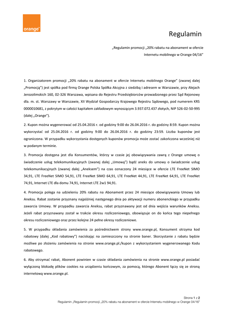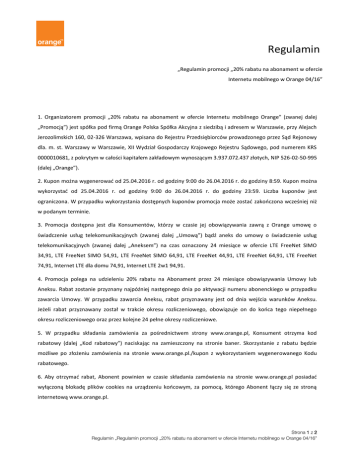 Regulamin „Regulamin promocji „20% rabatu na abonament w ofercie Internetu mobilnego w Orange 04/16” 1. Organizatorem promocji „20% rabatu na abonament w ofercie Internetu mobilnego Orange” (zwanej dalej „Promocją”) jest spółka pod firmą Orange Polska Spółka Akcyjna z siedzibą i adresem w Warszawie, przy Alejach Jerozolimskich 160, 02-326 Warszawa, wpisana do Rejestru Przedsiębiorców prowadzonego przez Sąd Rejonowy dla. m. st. Warszawy w Warszawie, XII Wydział Gospodarczy Krajowego Rejestru Sądowego, pod numerem KRS 0000010681, z pokrytym w całości kapitałem zakładowym wynoszącym 3.937.072.437 złotych, NIP 526-02-50-995 (dalej „Orange”). 2. Kupon można wygenerować od 25.04.2016 r. od godziny 9:00 do 26.04.2016 r. do godziny 8:59. Kupon można wykorzystać od 25.04.2016 r. od godziny 9:00 do 26.04.2016 r. do godziny 23:59. Liczba kuponów jest ograniczona. W przypadku wykorzystania dostępnych kuponów promocja może zostać zakończona wcześniej niż w podanym terminie. 3. Promocja dostępna jest dla Konsumentów, którzy w czasie jej obowiązywania zawrą z Orange umowę o świadczenie usług telekomunikacyjnych (zwanej dalej „Umową”) bądź aneks do umowy o świadczenie usług telekomunikacyjnych (zwanej dalej „Aneksem”) na czas oznaczony 24 miesiące w ofercie LTE FreeNet SIMO 34,91, LTE FreeNet SIMO 54,91, LTE FreeNet SIMO 64,91, LTE FreeNet 44,91, LTE FreeNet 64,91, LTE FreeNet 74,91, Internet LTE dla domu 74,91, Internet LTE 2w1 94,91. 4. Promocja polega na udzieleniu 20% rabatu na Abonament przez 24 miesiące obowiązywania Umowy lub Aneksu. Rabat zostanie przyznany najpóźniej następnego dnia po aktywacji numeru abonenckiego w przypadku zawarcia Umowy. W przypadku zawarcia Aneksu, rabat przyznawany jest od dnia wejścia warunków Aneksu. Jeżeli rabat przyznawany został w trakcie okresu rozliczeniowego, obowiązuje on do końca tego niepełnego okresu rozliczeniowego oraz przez kolejne 24 pełne okresy rozliczeniowe. 5. W przypadku składania zamówienia za pośrednictwem strony www.orange.pl, Konsument otrzyma kod rabatowy (dalej „Kod rabatowy”) naciskając na zamieszczony na stronie baner. Skorzystanie z rabatu będzie możliwe po złożeniu zamówienia na stronie www.orange.pl./kupon z wykorzystaniem wygenerowanego Kodu rabatowego. 6. Aby otrzymać rabat, Abonent powinien w czasie składania zamówienia na stronie www.orange.pl posiadać wyłączoną blokadę plików cookies na urządzeniu końcowym, za pomocą, którego Abonent łączy się ze stroną internetową www.orange.pl. Strona 1 z 2 Regulamin „Regulamin promocji „20% rabatu na abonament w ofercie Internetu mobilnego w Orange 04/16” 7. W następstwie przesłania poprawnego Kodu rabatowego w urządzeniu końcowym Abonenta zostanie umieszczony plik cookie służący do rozpoznawania przez Orange w trakcie trwania danej sesji Abonenta w sklepie internetowym Orange potwierdzający, że Abonent jest uprawniony do rabatu. 8. Abonent korzystający z urządzenia końcowego, na którym umieszczono plik cookie podczas połączenia ze stroną sklepu internetowego Orange będzie mógł dokonać zamówienia dotyczącego zawarcia Umowy bądź Aneksu wraz z wykorzystaniem przyznanego rabatu. 9. Plik cookie pozostaje ważny do czasu złożenia pierwszego zamówienia dotyczącego zawarcia Umowy, ale nie dłużej niż do 26.04.2016 r. Orange informuje, że w przypadku korzystania z urządzeń końcowych, do których dostęp ma więcej niż jeden użytkownik, Abonent w razie zakończenia połączenia ze sklepem internetowym Orange bez złożenia zamówienia, może usunąć pliki cookie umieszczone wskutek przesłania Kodu rabatowego i następnie ponownie wpisać ten sam Kod rabatowy przy ponownym połączeniu się ze stroną www.orange.pl/kupon. W przeciwnym wypadku rabat może wykorzystać inny użytkownik urządzenia końcowego, na którym umieszczony jest plik cookie. Orange nie odpowiada wobec Abonenta za skorzystanie z Kodu rabatowego przez innego użytkownika urządzenia końcowego. 10. Orange nie odpowiada za rozporządzanie Kodem rabatowym przez Abonenta. 11. Wysokość rabatu zmienia wysokość ulgi udzielonej przez Orange Abonentowi i wpływa na wysokość odszkodowania w przypadku rozwiązania umowy przed upływem okresu, na który została zawarta. 12. W pozostałym zakresie zastosowanie mają postanowienia regulaminów i cenników usług obowiązujących w ofercie, którą Konsument wybrał. 13. Promocja nie łączy się z ofertami LTE FreeNet i Internet LTE dla domu opartymi o funkcjonalność kodów zniżkowych, prowadzonych w tym samym czasie przez Orange. Strona 2 z 2 Regulamin „Regulamin promocji „20% rabatu na abonament w ofercie Internetu mobilnego w Orange 04/16”