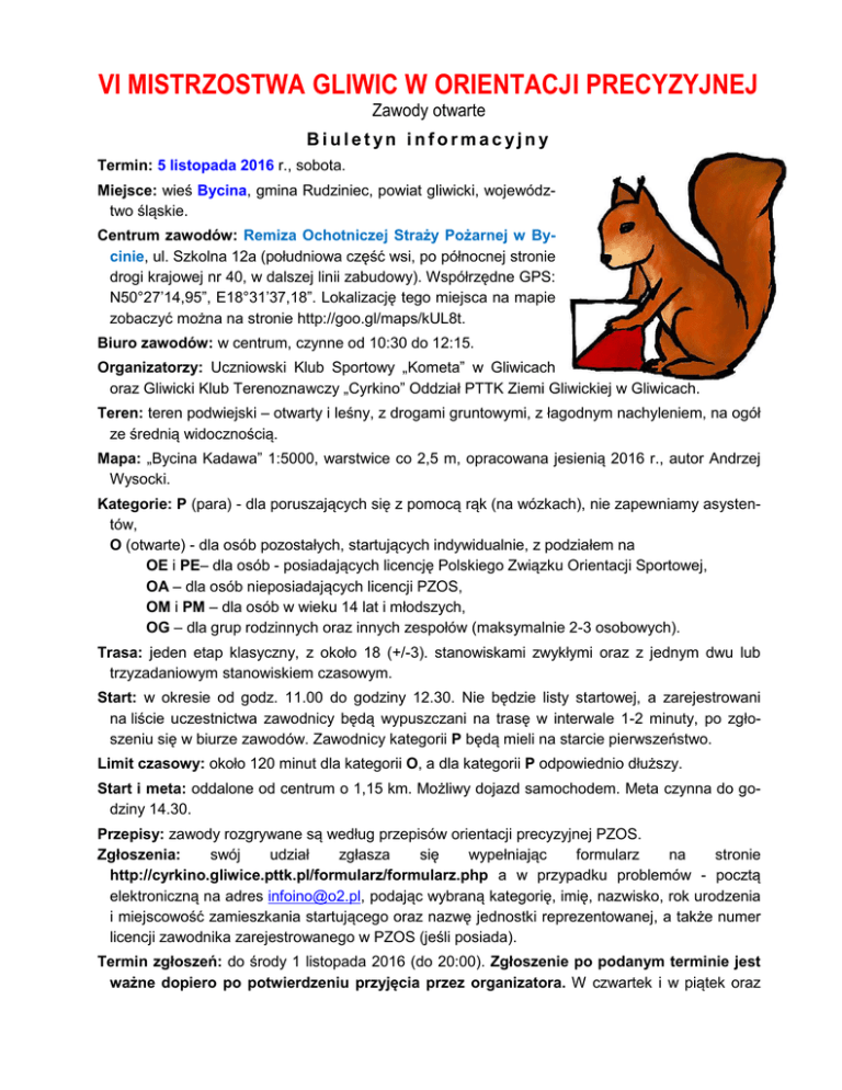 VI MISTRZOSTWA GLIWIC W ORIENTACJI PRECYZYJNEJ Zawody otwarte Biuletyn i nformacyjny Termin: 5 listopada 2016 r., sobota. Miejsce: wieś Bycina, gmina Rudziniec, powiat gliwicki, województwo śląskie. Centrum zawodów: Remiza Ochotniczej Straży Pożarnej w Bycinie, ul. Szkolna 12a (południowa część wsi, po północnej stronie drogi krajowej nr 40, w dalszej linii zabudowy). Współrzędne GPS: N50°27’14,95”, E18°31’37,18”. Lokalizację tego miejsca na mapie zobaczyć można na stronie http://goo.gl/maps/kUL8t. Biuro zawodów: w centrum, czynne od 10:30 do 12:15. Organizatorzy: Uczniowski Klub Sportowy „Kometa” w Gliwicach oraz Gliwicki Klub Terenoznawczy „Cyrkino” Oddział PTTK Ziemi Gliwickiej w Gliwicach. Teren: teren podwiejski – otwarty i leśny, z drogami gruntowymi, z łagodnym nachyleniem, na ogół ze średnią widocznością. Mapa: „Bycina Kadawa” 1:5000, warstwice co 2,5 m, opracowana jesienią 2016 r., autor Andrzej Wysocki. Kategorie: P (para) - dla poruszających się z pomocą rąk (na wózkach), nie zapewniamy asystentów, O (otwarte) - dla osób pozostałych, startujących indywidualnie, z podziałem na OE i PE– dla osób - posiadających licencję Polskiego Związku Orientacji Sportowej, OA – dla osób nieposiadających licencji PZOS, OM i PM – dla osób w wieku 14 lat i młodszych, OG – dla grup rodzinnych oraz innych zespołów (maksymalnie 2-3 osobowych). Trasa: jeden etap klasyczny, z około 18 (+/-3). stanowiskami zwykłymi oraz z jednym dwu lub trzyzadaniowym stanowiskiem czasowym. Start: w okresie od godz. 11.00 do godziny 12.30. Nie będzie listy startowej, a zarejestrowani na liście uczestnictwa zawodnicy będą wypuszczani na trasę w interwale 1-2 minuty, po zgłoszeniu się w biurze zawodów. Zawodnicy kategorii P będą mieli na starcie pierwszeństwo. Limit czasowy: około 120 minut dla kategorii O, a dla kategorii P odpowiednio dłuższy. Start i meta: oddalone od centrum o 1,15 km. Możliwy dojazd samochodem. Meta czynna do godziny 14.30. Przepisy: zawody rozgrywane są według przepisów orientacji precyzyjnej PZOS. Zgłoszenia: swój udział zgłasza się wypełniając formularz na stronie http://cyrkino.gliwice.pttk.pl/formularz/formularz.php a w przypadku problemów - pocztą elektroniczną na adres [email protected], podając wybraną kategorię, imię, nazwisko, rok urodzenia i miejscowość zamieszkania startującego oraz nazwę jednostki reprezentowanej, a także numer licencji zawodnika zarejestrowanego w PZOS (jeśli posiada). Termin zgłoszeń: do środy 1 listopada 2016 (do 20:00). Zgłoszenie po podanym terminie jest ważne dopiero po potwierdzeniu przyjęcia przez organizatora. W czwartek i w piątek oraz w dniu imprezy do godziny 11.00 możemy przyjąć zgłoszenia tylko pojedynczych osób, w ramach drobnej rezerwy materiałów startowych. Opłaty startowe (od osoby albo grupy w kategorii OG): kategoria P - 5 zł, kategorie pozostałe 10 zł. Opłaty uiszcza się bezpośrednio w biurze Oddziału PTTK (Gliwice, Rynek 11, 1 piętro, godz. 9÷12 i 14÷17, od poniedziałku do czwartku) lub na konto „PTTK – Oddział Ziemi Gliwickiej (koniecznie z podaniem nazwy imprezy) – nr konta 23 1240 1343 1111 0010 5003 6658 albo w dniu zawodów w biurze zawodów. Uczestnicy równolegle odbywających się XLVII Jesiennych Marszów na Orientację korzystają z obniżonej opłaty: 4 zł. Parkowanie samochodów: koło remizy i na ulicach w rejonie centrum zawodów, a także koło startu i mety, ok. 1,15 km od centrum. Dojazd: do Byciny w soboty nie ma komunikacji publicznej. Do bazy można dotrzeć pojazdami własnymi albo pociągami do stacji Taciszów (od południa, linia Gliwice – Kędzierzyn-Koźle) i Paczyna (od północy, linia Gliwice – Strzelce Opolskie), a także autobusami MZKP do przystanku Paczyna skrzyżowanie (linia 207 Pyskowice – Toszek), a następnie pieszo lub rowerem, według poniższych opisów. Podróżując do nas i od nas należy zachować ostrożność na drogach! Ze stacji kolejowej Taciszów (4,53 km): z peronu zejść na asfaltowa szosę przy wschodnim końcu i podążać nią, początkowo w lewo (na północ), 2,165 km do centrum wsi Taciszów. Tam na rozwidleniu szos wybrać odchodzącą na północ do Byciny i przebyć do tej wsi 2,3 km aż do skrzyżowania z drogą krajową nr 40, za którą ulicą Szkolną pokonać jeszcze 65 m do placu przed remizą (z prawej strony). Ze stacji kolejowej Paczyna (3,99 km): z peronu zejść na szosę przy zachodnim końcu, a następnie podążać w lewo (na południowy zachód). Droga prowadzi do Byciny przez Paczynę, pola i lasek. Na początku Byciny, przed pałacem, wybrać ulicę Szkolną lub Rolniczą i jedna z nich przedostać na drugi koniec wsi. Remiza strażacka znajduje się między wymienionymi ulicami, ok. 65 metrów przed skrzyżowaniem z drogą krajową nr 40. Dojście z przystanku autobusowego Paczyna skrzyżowanie do stacji kolejowej Paczyna (0,52 km): na skrzyżowaniu szos wybrać kierunek na południe, do Paczyny i dojść do przejazdu kolejowego, a dalej maszerować według wcześniejszego opisu. Szczegółowe rozkłady jazd oraz mapy ulic i przystanków są na stronach – dla autobusów http://rozklady.kzkgop.pl i http://www.mzkp.pl, dla kolei http://rozklad.plk-sa.pl/Tablice. Ogłoszenie ostatecznych wyników: w centrum zawodów - w kategorii P niezwłocznie po ustaleniu wyników i wypisaniu dyplomów, pozostałe kategorie o godz. 15.45. Najlepsi trzej zawodnicy i zespoły w każdej kategorii otrzymają tytuły mistrzów i wicemistrzów oraz drobne nagrody i dyplomy. WC: w centrum zawodów oraz na starcie i mecie nie ma możliwości korzystania z bezbarierowych toalet. Porada praktyczna: jesienią w dni pochmurne światło dzienne bywa słabe - zalecamy posiadanie drobnego oświetlenia do podświetlenia mapy. Osoby funkcyjne: kierownik zawodów – Magdalena Ceglarska, zastępca kierownika i sędzia główny – Andrzej Wy