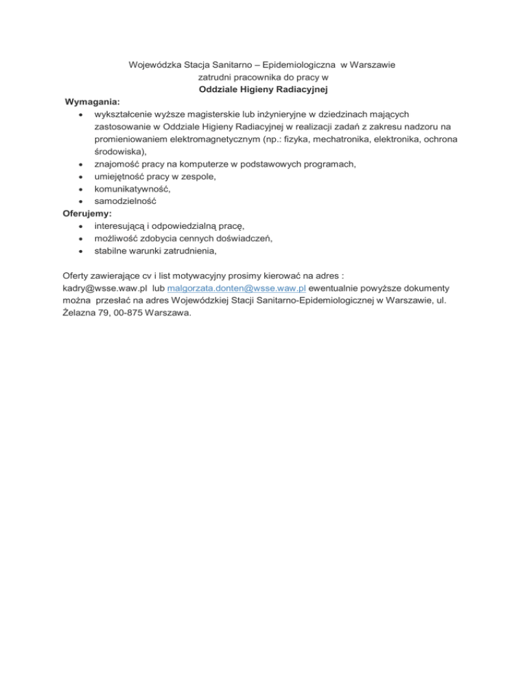 Wojewódzka Stacja Sanitarno – Epidemiologiczna w Warszawie zatrudni pracownika do pracy w Oddziale Higieny Radiacyjnej Wymagania: wykształcenie wyższe magisterskie lub inżynieryjne w dziedzinach mających zastosowanie w Oddziale Higieny Radiacyjnej w realizacji zadań z zakresu nadzoru na promieniowaniem elektromagnetycznym (np.: fizyka, mechatronika, elektronika, ochrona środowiska), znajomość pracy na komputerze w podstawowych programach, umiejętność pracy w zespole, komunikatywność, samodzielność Oferujemy: interesującą i odpowiedzialną pracę, możliwość zdobycia cennych doświadczeń, stabilne warunki zatrudnienia, Oferty zawierające cv i list motywacyjny prosimy kierować na adres : [email protected] lub [email protected] ewentualnie powyższe dokumenty można przesłać na adres Wojewódzkiej Stacji Sanitarno-Epidemiologicznej w Warszawie, ul. Żelazna 79, 00-875 Warszawa.