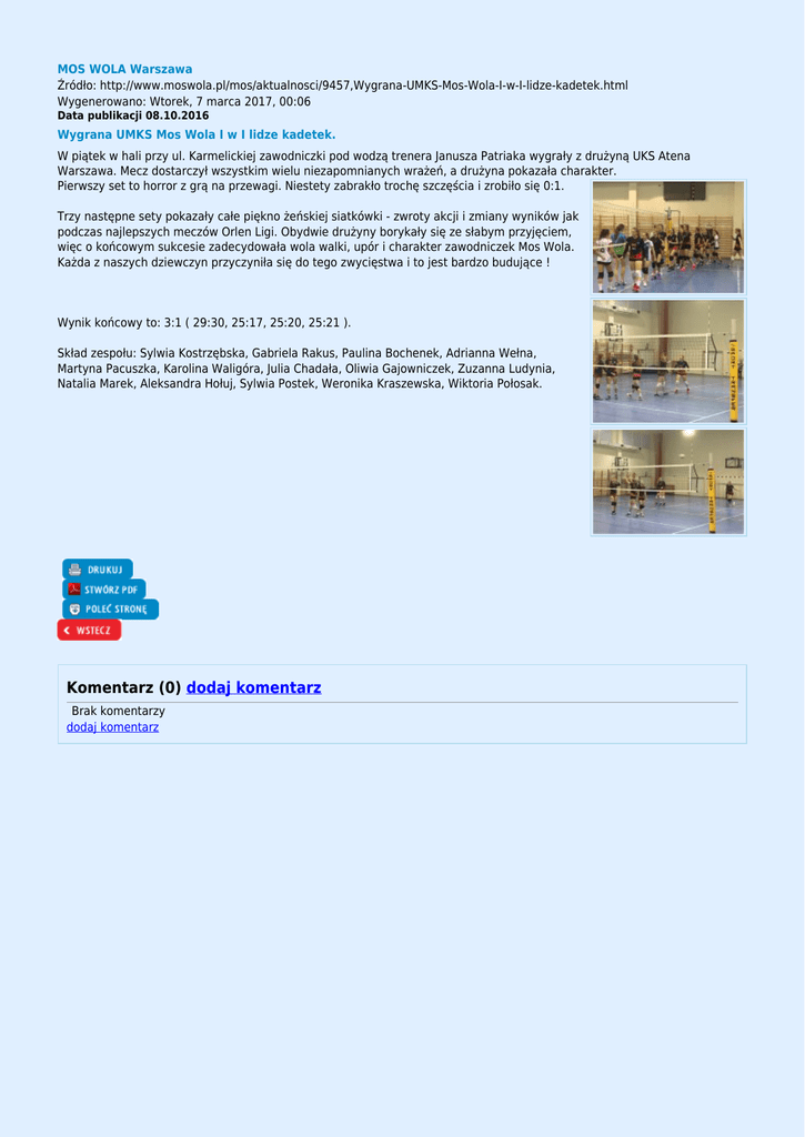 MOS WOLA Warszawa Źródło: http://www.moswola.pl/mos/aktualnosci/9457,Wygrana-UMKS-Mos-Wola-I-w-I-lidze-kadetek.html Wygenerowano: Wtorek, 7 marca 2017, 00:06 Data publikacji 08.10.2016 Wygrana UMKS Mos Wola I w I lidze kadetek. W piątek w hali przy ul. Karmelickiej zawodniczki pod wodzą trenera Janusza Patriaka wygrały z drużyną UKS Atena Warszawa. Mecz dostarczył wszystkim wielu niezapomnianych wrażeń, a drużyna pokazała charakter. Pierwszy set to horror z grą na przewagi. Niestety zabrakło trochę szczęścia i zrobiło się 0:1. Trzy następne sety pokazały całe piękno żeńskiej siatkówki - zwroty akcji i zmiany wyników jak podczas najlepszych meczów Orlen Ligi. Obydwie drużyny borykały się ze słabym przyjęciem, więc o końcowym sukcesie zadecydowała wola walki, upór i charakter zawodniczek Mos Wola. Każda z naszych dziewczyn przyczyniła się do tego zwycięstwa i to jest bardzo budujące ! Wynik końcowy to: 3:1 ( 29:30, 25:17, 25:20, 25:21 ). Skład zespołu: Sylwia Kostrzębska, Gabriela Rakus, Paulina Bochenek, Adrianna Wełna, Martyna Pacuszka, Karolina Waligóra, Julia Chadała, Oliwia Gajowniczek, Zuzanna Ludynia, Natalia Marek, Aleksandra Hołuj, Sylwia Postek, Weronika Kraszewska, Wiktoria Połosak. Komentarz (0) dodaj komentarz Brak komentarzy dodaj komentarz