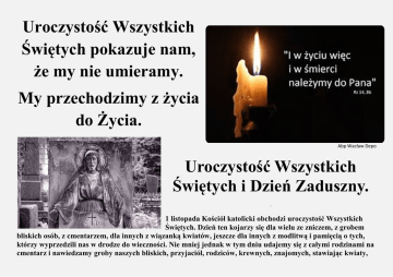 Uroczystość Wszystkich Świętych pokazuje nam, że my nie umieramy. My przechodzimy z życia do Życia. Abp Wacław Depo Uroczystość Wszystkich Świętych i Dzień Zaduszny. . 1 listopada Kościół katolicki obchodzi uroczystość Wszystkich Świętych. Dzień ten kojarzy się dla wielu ze zniczem, z grobem bliskich osób, z cmentarzem, dla innych z wiązanką kwiatów, jeszcze dla innych z modlitwą i pamięcią o tych, którzy wyprzedzili nas w drodze do wieczności. Nie mniej jednak w tym dniu udajemy się z całymi rodzinami na cmentarz i nawiedzamy groby naszych bliskich, przyjaciół, rodziców, krewnych, znajomych, stawiając kwiaty, zapalając ten "płomyk nadziei", wierząc, że już cieszą się oni chwałą w domu Ojca Niebieskiego. Kościół w tym dniu oddaje cześć tym wszystkim, którzy już weszli do chwały niebieskiej, a wiernym pielgrzymującym jeszcze na ziemi wskazuje drogę, która ma zaprowadzić ich do świętości. Przypomina nam również prawdę o naszej wspólnocie ze Świętymi, którzy otaczają nas opieką. KSZTAŁTOWANIE SIĘ UROCZYSTOŚCI W początkach chrześcijaństwa, w obawie przed bałwochwalstwem, nie oddawano czci nikomu ze stworzeń, ani ludziom, ani aniołom. Oddawano cześć jedynie Bogu w Trójcy Świętej Jedynemu. W Nowym Testamencie zauważamy pochwałę jaką sam Pan Jezus daje św. Janowi Chrzcicielowi, cześć z jaką wyraża się św. Paweł w listach do Rzymian i Hebrajczyków o Abrahamie i Melchizedeku. Najpierw przedmiotem kultu stała się Najświętsza Maryja Panna, jako Matka Syna Bożego. Zaczęto wznosić kościoły ku Jej czci, Kościół zaczął ustanawiać święta i układał modlitwy oraz pieśni o Matce Bożej. W tym samym czasie zauważamy też kult św. Michała Archanioła. Krwawe prześladowania Kościoła w I w. rozbudziły także kult męczenników. Dzień ich zgonu uważano za dzień ich narodzin dla nieba. Dlatego już od V w. kult prywatny przerodził się w urzędowy, powszechny. 13 maja 608 r. papież Bonifacy IV, rzymską świątynie pogańską, ku czci zwłaszcza nieznanych bóstw (Panteon), poświęcił Matce Bożej i świętym męczennikom. W VIII w. papież Grzegorz III w kościele św. Piotra otworzył kaplicę poświęconą Wszystkim Świętym, nie tylko męczennikom. W Anglii pojawiło się święto Wszystkich Świętych w połowie VIII w. obchodzone 1 listopada. Święto poprzedzone było wigilią, a od XV w. otrzymało także oktawę. Reforma z 1955 r. usunęła wigilię i oktawę. Natomiast papież Jan XI w 935 r. ustanowił osobne święto ku czci Wszystkich Świętych, wyznaczając je na dzień 1 listopada. Tak więc uroczystość Wszystkich Świętych ma już ponad tysiącletnią tradycję i przypomina nam przede wszystkim tych Świętych Pańskich "z każdego narodu i wszystkich pokoleń, ludów i języków" (por. Ap 7, 9), którzy nie mają swoich osobnych wspomnień w roku liturgicznym. W ciągu wieków Kościół ubogacił kult świętych. Stawiał im posągi, malował ich obrazy, budował ku ich czci świątynie (np. kościół Sióstr Benedyktynek pod wezwaniem Wszystkich Świętych w Drohiczynie) i ołtarze, ułożył szereg modlitw i pieśni religijnych ku ich czci, jak też ułożył teksty liturgiczne do Mszy św. i kapłańskich pacierzy - Liturgii Godzin. Kult Świętych pomnaża cześć Pana Boga. Świętych Pańskich czcimy ze względu na Pana Boga, którego oni "reprezentują". Tak więc nie bezpośrednio, lecz pośrednio przez nich kierujemy kult ku Panu Bogu. Kościół oddaje cześć świętym w różnym stopniu. I tak na pierwszym miejscu stawia Najświętszą Maryję Pannę, następnie świętych: Józefa i Jana Chrzciciela, dalej Apostołów, wśród których Święci Piotr i Paweł mają uprzywilejowane miejsce. Najwięcej jest świętych lokalnych, którzy odbierają szczególną cześć: w zakonie, w narodzie, w państwie czy w diecezji, gdzie się wsławili męczeństwem za wiarę lub niezwykłą cnotą. WSPOMNIENIE WSZYSTKICH WIERNYCH ZMARŁYCH Wspomnienie Wszystkich Wiernych Zmarłych Kościół obchodzi 2 listopada i w tradycji polskiej dzień ten jest nazywany Dniem Zadusznym lub inaczej "zaduszkami". To wspomnienie wprowadził opat benedyktynów w Cluny we Francji, św. Odilon (Odylon). On to w 998 r. zarządził modlitwy za dusze wszystkich zmarłych w dniu 2 listopada. Termin ten i sama idea szybko rozprzestrzeniły się we Francji, Anglii, Niemczech, Italii. W XIII w. zwyczaj ten w Kościele rzymskim stał się powszechny. W XV w. wytworzył się u dominikanów w Wanencji zwyczaj ofiarowania w dniu 2 listopada trzech Mszy św. przez jednego kapłana. Papież Benedykt XIV w 1748 r. rozszerzył ten zwyczaj na całą Hiszpanię. W 1915 r., podczas I wojny światowej, papież Benedykt XV na prośbę opata - prymasa benedyktynów pozwolił kapłanom całego Kościoła odprawić w tym dniu trzy Msze św. Jedną w intencji przyjętej od wiernych, drugą w intencji wszystkich wiernych zmarłych, a trzecią w intencji papieża. Zwyczaj ten nie jest traktowany jako obowiązek. Kościół w tym dniu wspomina zmarłych pokutujących za grzechy w czyśćcu. Chodzi więc o których nie mogą wejść do nieba, gdyż mają pewne długi do spłacenia Bożej sprawiedliwości. Prawdę o istnieniu czyśćca Kościół ogłosił jako dogmat na soborze w Lyonie w 1274 r. i na XXV sesji Soboru Trydenckiego (1545-1563), w osobnym dekrecie o czyśćcu. Sobór Trydencki orzekł prawdę, że duszom w czyśćcu możemy pomagać. Cała wspólnota Kościoła przychodzi z pomocą duszom czyśćcowym zanosząc w tym dniu prośby przed tron Boży. Aby przyjść z pomocą zmarłym pokutującym w czyśćcu, żyjący mogą w tych dniach uzyskać i ofiarować odpusty zupełne. Nabożeństwo do dusz czyśćcowych było i jest bardzo żywe. Świadczą o tym uroczyście urządzane pogrzeby, często zamawiane Msze św. w intencji zmarłych, w Kościele rzymskim powszechne są Msze św. gregoriański
