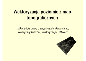 Wektoryzacja poziomic z map topograficznych kilkanaście uwag o zagadnieniu skanowaniu, binaryzacji kolorów, wektoryzacji i DTM-ach Pytania o wektoryzację... Czy da się całkowicie zautmatyzować proces wektoryzacji poziomic? Czy trzeba wektoryzować wszystkie poziomice? Czy najszybszym sposobem wektoryzacji jest jej manualne wykonanie? Jaki jest najlepszy program do wektoryzacji? Etapy tworzenia cyfrowego modelu terenu Dokładność sporządzania drukowanych map topograficznych Określa dobranie maksymalnej rozdzielczości DTM Dla map drukowanych 1:10000, będzie to wartość ok. 1 m; Skanowanie map topograficznych Binaryzacja kolorów Wektoryzacja rysunku poziomicowego Przypisanie rzędnych wysokości poziomicom Interpolacja do formatu rastrowego (DTM), siatkowego (GRID) lub TIN Zakładana rozdzielczość DTM ma wpływ na dokładność wektoryzacji rysunku poziomicowego, zarówno w strefach jego nieciągłości jak i w aspekcie wektoryzacji wybranych poziomic. Zasadnicza różnica pomiędzy rysunkiem poziomic w postaci drukowanej a w postaci wektorowej, z której ma być wykonany DTM Rozdzielczość DTM na tle rysunku poziomicowego mapy 1:10000 50 m 10 m 5m 1 cm 1 mm 0,5 Wyjściowa postać map topograficznych (przykład map 1:10000) – przed skanowaniem • PUWG’65: – postać dwukolorowych, jednokolorowych, – jednokolorowych z rzeźbą w oddzielnym arkuszu • PUWG’92 – kolorowe drukowane, kolorowe w postaci rastrowej(!), Część arkuszy map dostępna jest w postaci wektorowej Skanowanie barwnych map topograficznych Przed wektoryzacją poziomic map kolorowych należy wyodrębnić rysunek rzeźby przekształcając go poprzez proces binaryzacji kolorów do postaci pojedynczej dwubarwnej (B/W) warstwy rastrowej. Można zastosować dwa podejścia: - binaryzację za pomocą oprogramowania skanera, - wykorzystując specjalne oprogramowanie przeznaczone do binaryzacji kolorów (lub ogólniej do klasyfikacji obrazów), często zawarte w systemach informacji geograficznej W przypadku drugiego podejścia nie można stosować zbyt wysokich współczynników kompresji stratnej w starszych typach algorytmów np. jpg. Spowoduje to bowiem dodatkowe zakłócenia w obrazie, utrudniające wektoryzację. Efekt druku Mapa zeskanowane i zapisane w 16 kolorach Indeksowanych w formacie TIF z kompresją bezstratną Mapa zapisana z kompresją stratną, wprowadzone zakłócenia utrudniają wektoryzację Mapa zeskanowane i zapisane w 16 kolorach Indeksowanych w formacie TIF z kompresją bezstratną Mapa zapisana z kompresją stratną jp2 z takim samym stopniem kompresji, brak widocznych różnic w stosunku do oryginału Nieciągłość poziomic wynika z faktu ich zakrycia przez inne elementy treści map topograficznych oraz z nieciągłości samej rzeźby (nasypy, wykopy, wyrobiska, odkrywki) Wyodrębnienie linii poziomic do rastra binarnego • • proces binaryzacji kolorów filtracja usuwająca szumy Stosowanie różnych filtrów usuwających szumy (linie nie reprezentujące poziomic) mogą powodować nie pożądane efekty Czyszczenie rastra po wektoryzacji automatycznej • Pierwszą czynnością jest usunięcie linii których długość jest mniejsza od około jednego mm. Stosując proste zapytanie, którego celem jest selekcja wszystkich linii, spełniających poniższy warunek: LINESTATS.Length < 8 Może to być nawet do 12 m, Usuniętych może być nawet około 50% wszystkich linii. Łącznie linii poziomic ćwiartkowych i połówkowych 1) 2) Wybór linii reprezentujących poziomice wg odpowiednio dobranego kryterium długości linii, Dla poziomic połówkowych może być następujące: LINESTATS.Length >30 and LINESTATS.Length <60 3) 4) 5) 6) (1) Aby uniknąć łączenia nieodpowiednich linii, wybrane linie przenosimy do nowej warstwy i następnie dokonujemy łączenia linii przerywanych w oparciu o kryterium odległości pomiędzy węzłami i kąta poszukiwania punktu łączenia, możemy ograniczyć łączenie tylko pomiędzy węzłami Następnie dokonujemy selekcji (w nowej warstwie) tylko tych linii, których długość jest większa od sumy długości dwóch linii połówkowych i odległości pomiędzy nimi czyli: LINESTATS.Length >150, (2) I kopiujemy je do schowka W warstwie podstawowej usuwamy wszystkie linie spełniające kryterium (1) I WSTAWIAMY LINIE ZE SWCHOWKA SPELNIAJACE KRYTERIUM (2) Podobne działania wykonujemy dla linii oznaczających poziomice ćwiartkowe Podsumowanie opisanych operacji wykonanych na arkuszu 1:10000 Trzebaw • Arkusz Trzebaw jest trudnym arkuszem ze względu obszar morenowy porozcinany rynnami polodowcowymi, ten obraz rzeźby dość mocno zmodyfikowany jest działania antropogeniczne (nasypy, wyrobiska) • Wyniki automatycznej wektoryzacji porównano z manualną wykonaną dla całego arkusza • Porównano sumę długości wszystkich linii w obu warstwach wektorowych i stwierdzono, że długość linii automatycznie stanowiła około 38 % długości linii wektoryzowanych manualnie