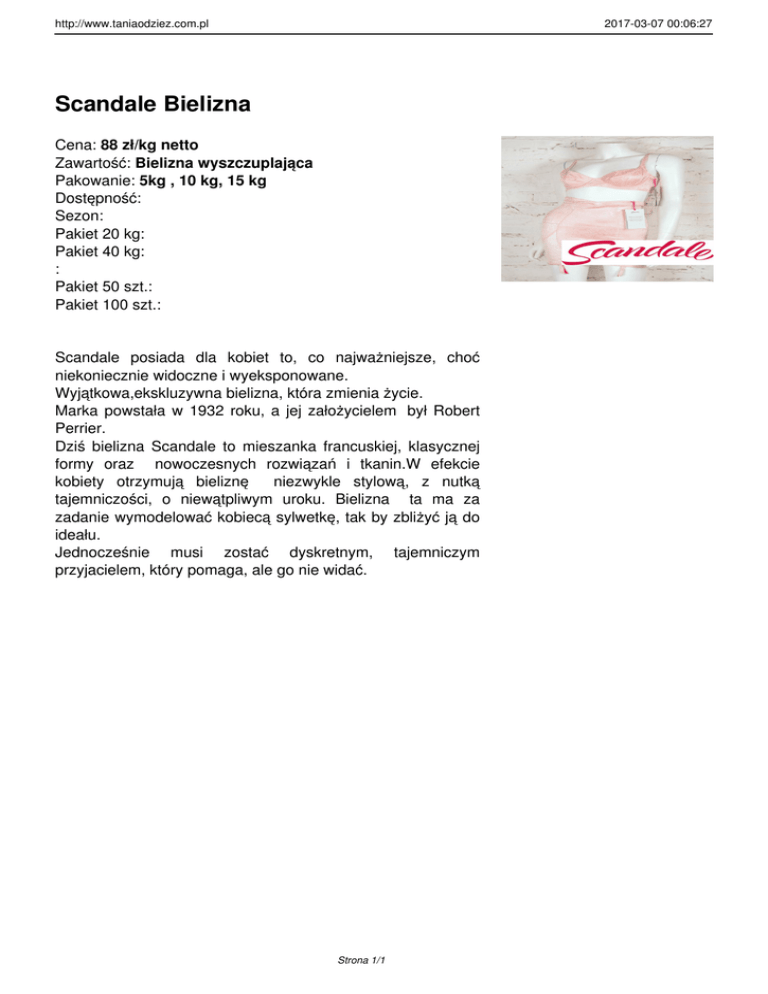http://www.taniaodziez.com.pl 2017-03-07 00:06:27 Scandale Bielizna Cena: 88 zł/kg netto Zawartość: Bielizna wyszczuplająca Pakowanie: 5kg , 10 kg, 15 kg Dostępność: Sezon: Pakiet 20 kg: Pakiet 40 kg: : Pakiet 50 szt.: Pakiet 100 szt.: Scandale posiada dla kobiet to, co najważniejsze, choć niekoniecznie widoczne i wyeksponowane. Wyjątkowa,ekskluzywna bielizna, która zmienia życie. Marka powstała w 1932 roku, a jej założycielem był Robert Perrier. Dziś bielizna Scandale to mieszanka francuskiej, klasycznej formy oraz nowoczesnych rozwiązań i tkanin.W efekcie kobiety otrzymują bieliznę niezwykle stylową, z nutką tajemniczości, o niewątpliwym uroku. Bielizna ta ma za zadanie wymodelować kobiecą sylwetkę, tak by zbliżyć ją do ideału. Jednocześnie musi zostać dyskretnym, tajemniczym przyjacielem, który pomaga, ale go nie widać. Strona 1/1