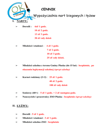 CENNIK Wypożyczalnia nart biegowych i łyżew I. NARTY: ➢ Dorośli : 6zł/ 1 godz. 10 zł/ 2 godz. 13 zł/ 3 godz. 30 zł/ cały dzień ➢ Młodzież i studenci : 4 zł/ 1 godz. 7 zł/ 2 godz. 10 zł/ 3 godz. 25 zł/ cały dzień. ➢ Młodzież szkolna z terenu Gminy Płaska (do 15 lat) : bezpłatnie, po okazaniu legitymacji szkolnej (sprzęt szkolny) ➢ Karnet rodzinny (2+2) : 25 zł/ 1 godz. 40 zł/ 2 godz. 100 zł/ cały dzień ➢ Seniorzy (60+) : 5 zł/ 1 godz. + 2 zł/ następna godz. ➢ Nauczyciele i pracownicy ZSO Płaska : bezpłatnie (sprzęt szkolny) II. ŁYŻWY: ➢ Dorośli : 5 zł/ 1 godz. ➢ Młodzież i studenci : 3 zł/ 1 godz. ➢ Młodzież szkolna ZSO : bezpłatnie