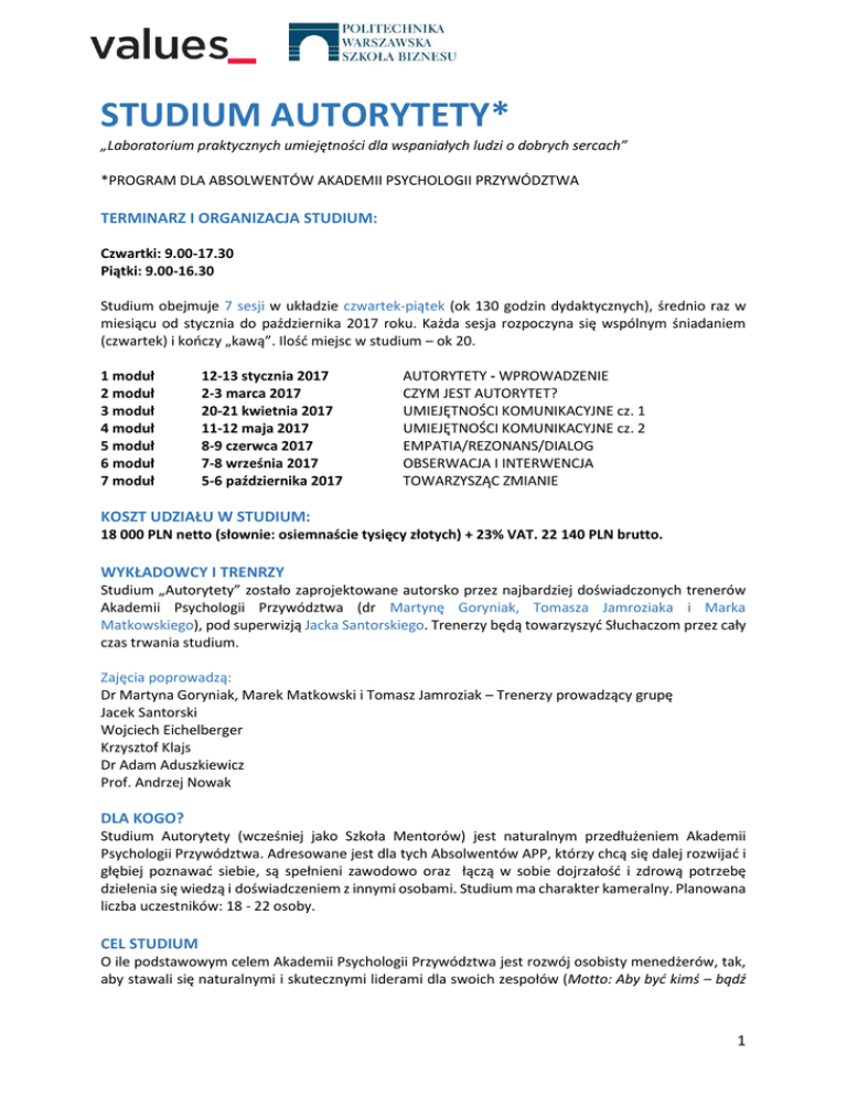 STUDIUM AUTORYTETY* „Laboratorium praktycznych umiejętności dla wspaniałych ludzi o dobrych sercach” *PROGRAM DLA ABSOLWENTÓW AKADEMII PSYCHOLOGII PRZYWÓDZTWA TERMINARZ I ORGANIZACJA STUDIUM: Czwartki: 9.00-17.30 Piątki: 9.00-16.30 Studium obejmuje 7 sesji w układzie czwartek-piątek (ok 130 godzin dydaktycznych), średnio raz w miesiącu od stycznia do października 2017 roku. Każda sesja rozpoczyna się wspólnym śniadaniem (czwartek) i kończy „kawą”. Ilość miejsc w studium – ok 20. 1 moduł 2 moduł 3 moduł 4 moduł 5 moduł 6 moduł 7 moduł 12-13 stycznia 2017 2-3 marca 2017 20-21 kwietnia 2017 11-12 maja 2017 8-9 czerwca 2017 7-8 września 2017 5-6 października 2017 AUTORYTETY - WPROWADZENIE CZYM JEST AUTORYTET? UMIEJĘTNOŚCI KOMUNIKACYJNE cz. 1 UMIEJĘTNOŚCI KOMUNIKACYJNE cz. 2 EMPATIA/REZONANS/DIALOG OBSERWACJA I INTERWENCJA TOWARZYSZĄC ZMIANIE KOSZT UDZIAŁU W STUDIUM: 18 000 PLN netto (słownie: osiemnaście tysięcy złotych) + 23% VAT. 22 140 PLN brutto. WYKŁADOWCY I TRENRZY Studium „Autorytety” zostało zaprojektowane autorsko przez najbardziej doświadczonych trenerów Akademii Psychologii Przywództwa (dr Martynę Goryniak, Tomasza Jamroziaka i Marka Matkowskiego), pod superwizją Jacka Santorskiego. Trenerzy będą towarzyszyć Słuchaczom przez cały czas trwania studium. Zajęcia poprowadzą: Dr Martyna Goryniak, Marek Matkowski i Tomasz Jamroziak – Trenerzy prowadzący grupę Jacek Santorski Wojciech Eichelberger Krzysztof Klajs Dr Adam Aduszkiewicz Prof. Andrzej Nowak DLA KOGO? Studium Autorytety (wcześniej jako Szkoła Mentorów) jest naturalnym przedłużeniem Akademii Psychologii Przywództwa. Adresowane jest dla tych Absolwentów APP, którzy chcą się dalej rozwijać i głębiej poznawać siebie, są spełnieni zawodowo oraz łączą w sobie dojrzałość i zdrową potrzebę dzielenia się wiedzą i doświadczeniem z innymi osobami. Studium ma charakter kameralny. Planowana liczba uczestników: 18 - 22 osoby. CEL STUDIUM O ile podstawowym celem Akademii Psychologii Przywództwa jest rozwój osobisty menedżerów, tak, aby stawali się naturalnymi i skutecznymi liderami dla swoich zespołów (Motto: Aby być kimś – bądź 1 sobą), o tyle celem Studium Autorytety jest rozwój umiejętności wspierania w rozwoju innych (Motto: Jesteś kimś - pomóż innym stawać się sobą, pomóż im odkryć, kim mogą być). LABORATORIUM – wiedza i trening Studium ma charakter praktycznego laboratorium warsztatowo-treningowego. Chcemy wspólnie z uczestnikami zbudować środowisko sprzyjające doświadczaniu i uczeniu się, miejsce, gdzie każdy z nich będzie miał wiele okazji do rozwijania i testowania umiejętności sprzyjających budowaniu rozwijających, pomocnych relacji, gdzie będzie można zebrać wiele doświadczeń pozwalających odkryć i zrozumieć własne motywacje, swoje zasoby psychologiczne i ich wpływ na relacje. Równolegle, damy uczestnikom solidną porcję nowoczesnej, praktycznej wiedzy psychologicznej, której przydatność będą mogli testować na bieżąco. Jesteśmy przekonani, że suma wiedzy, doświadczeń a także pogłębiona samoświadomość i uważność na innych pozwolą naszym absolwentom stawać się dla swego otoczenia ważnymi, znaczącymi osobami stymulującymi i wspierającymi rozwój, wywierającymi konstruktywny wpływ na życie ludzi. „Jesteś kimś? Pomóż innym stawać się sobą, pomóż im odkryć, kim mogą być…” OBSZARY PRACY POGŁĘBIENIE SAMOŚWIADOMOŚCI świadomość własnych zasobów i ograniczeń w kontakcie; własnego wpływu w kontakcie z innymi osobami: świadomość tego, jak kontakt przebiega i co odgrywa w nim kluczową rolę; świadomość własnej odpowiedzialności za tworzenie środowiska sprzyjającego rozwojowi. DOJRZAŁOŚĆ EMOCJONALNA oddzielanie własnych emocji od cudzych, oddzielanie ocen od faktów i umiejętność koncentrowania się na faktach, świadomość własnych nastawień i emocji jakie związane są z procesem kontaktu, świadomość własnych mechanizmów obronnych oraz tego w jakich sytuacjach one są uruchamiane. Umiejętność odróżniania interwencji o charakterze kontroli od interwencji o charakterze prawdziwego wsparcia. POSZERZENIE WIEDZY modele rozwoju człowieka, wiedza o rozwoju człowieka dorosłego, modele i sposoby budowania relacji, rola i znaczenie autorytetu, rozumienie dynamiki kontaktu „nauczyciel- uczeń”, wiedza na temat zjawisk i procesów świadomych i nieświadomych, które w tym kontakcie się dzieją, rozumienie mechanizmów inicjowania i wprowadzania trwałych zmian, zarówno na poziomie zachowania jak i postaw. ROZWINIĘCIE KOMPETENCJI i UMIEJĘTNOŚCI umiejętności komunikacyjne (słuchanie na głębokim poziomie), dociekanie czyli zdawanie pytań, posługiwanie się ciszą, udzielanie informacji zwrotnych, narzędzia zarządzania rozmową, oddzielanie faktów od ocen, spójność komunikacyjna, diagnozowanie różnych adaptacji osobowości i dobór efektywnych strategii relacyjnych. O PROGRAMIE Na program studium składa się siedem, połączonych ze sobą merytorycznie, dwudniowych modułów. Każdy kolejny moduł jest kontynuacją poprzedniego, odwołuje się do wiedzy, zdobytych doświadczeń i umiejętności nabytych w poprzednich modułach. Stąd, decyzja o uczestnictwie w studium powinna wiązać się z decyzją o uczestnictwie we wszystkich modułach. 2 Zajęcia będą odbywały się nie częściej niż raz w miesiącu, w czwartek i piątek w okresie od stycznia do października 2017r. Poza pierwszym, każdy kolejny moduł rozpocznie się wykładem wprowadzającym, wyposażającym uczestnikom w wiedzę niezbędną do pracy warsztatowej. Po wykładzie odbywa się warsztat praktyczny nastawiony na pogłębianie samoświadomości, uczenie się nowych umiejętności pod okiem trenerów i grupy i testowanie ich w praktyce. Dzień drugi każdego modułu otworzy wykład poświęcony różnym adaptacjom oso