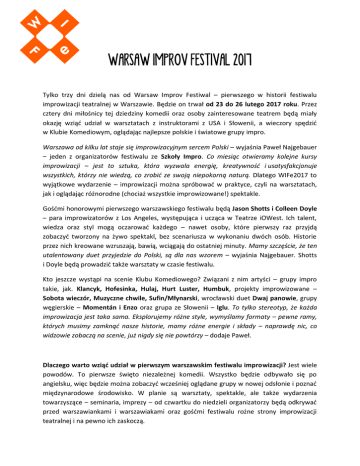 WARSAW IMPROV FESTIVAL 2017 Tylko trzy dni dzielą nas od Warsaw Improv Festiwal – pierwszego w historii festiwalu improwizacji teatralnej w Warszawie. Będzie on trwał od 23 do 26 lutego 2017 roku. Przez cztery dni miłośnicy tej dziedziny komedii oraz osoby zainteresowane teatrem będą miały okazję wziąć udział w warsztatach z instruktorami z USA i Słowenii, a wieczory spędzić w Klubie Komediowym, oglądając najlepsze polskie i światowe grupy impro. Warszawa od kilku lat staje się improwizacyjnym sercem Polski – wyjaśnia Paweł Najgebauer – jeden z organizatorów festiwalu ze Szkoły Impro. Co miesiąc otwieramy kolejne kursy improwizacji – jest to sztuka, która wyzwala energię, kreatywność i usatysfakcjonuje wszystkich, którzy nie wiedzą, co zrobić ze swoją niepokorną naturą. Dlatego WIFe2017 to wyjątkowe wydarzenie – improwizacji można spróbować w praktyce, czyli na warsztatach, jak i oglądając różnorodne (chociaż wszystkie improwizowane!) spektakle. Gośćmi honorowymi pierwszego warszawskiego festiwalu będą Jason Shotts i Colleen Doyle – para improwizatorów z Los Angeles, występująca i ucząca w Teatrze iOWest. Ich talent, wiedza oraz styl mogą oczarować każdego – nawet osoby, które pierwszy raz przyjdą zobaczyć tworzony na żywo spektakl, bez scenariusza w wykonaniu dwóch osób. Historie przez nich kreowane wzruszają, bawią, wciągają do ostatniej minuty. Mamy szczęście, że ten utalentowany duet przyjedzie do Polski, są dla nas wzorem – wyjaśnia Najgebauer. Shotts i Doyle będą prowadzić także warsztaty w czasie festiwalu. Kto jeszcze wystąpi na scenie Klubu Komediowego? Związani z nim artyści – grupy impro takie, jak. Klancyk, Hofesinka, Hulaj, Hurt Luster, Humbuk, projekty improwizowane – Sobota wieczór, Muzyczne chwile, Sufin/Młynarski, wrocławski duet Dwaj panowie, grupy węgierskie – Momentán i Enzo oraz grupa ze Słowenii – Iglu. To tylko stereotyp, że każda improwizacja jest taka sama. Eksplorujemy różne style, wymyślamy formaty – pewne ramy, których musimy zamknąć nasze historie, mamy różne energie i składy – naprawdę nic, co widzowie zobaczą na scenie, już nigdy się nie powtórzy – dodaje Paweł. Dlaczego warto wziąć udział w pierwszym warszawskim festiwalu improwizacji? Jest wiele powodów. To pierwsze święto niezależnej komedii. Wszystko będzie odbywało się po angielsku, więc będzie można zobaczyć wcześniej oglądane grupy w nowej odsłonie i poznać międzynarodowe środowisko. W planie są warsztaty, spektakle, ale także wydarzenia towarzyszące – seminaria, imprezy – od czwartku do niedzieli organizatorzy będą odkrywać przed warszawiankami i warszawiakami oraz gośćmi festiwalu rożne strony improwizacji teatralnej i na pewno ich zaskoczą. Wydarzenia festiwalowe: Czwartek, 23 lutego, godz. 19:00, bezpłatny spektakl grupy IGLU – improwizatorów ze Słowenii, www.facebook.com/events/396356710698207 Czwartek, 23 lutego, godz. 20:00, oficjalne rozpoczęcie Festiwalu, grupy polskie: Hulaj / Humbuk / Musical Improwizowany / Hurt Luster/ Sufin/Młynarski, www.facebook.com/events/1708894436068823 Piątek, 24 lutego, godz. 20:00, Klancyk / Hofesinka / Dwaj panowie / Sobota Wieczór / Muzyczne chwile, www.facebook.com/events/1737321049919510 Sobota, 25 lutego, występ gości Festiwalu: Dummy (US) / Iglu (SL) / Enzo (HU) / Momentán (HU) + impreza na zakończenie: www.facebook.com/events/1475258212542097 *** Warsaw Improv Festival 2017, 23-26 lutego Organizator Główny: Szkoła Impro Współorganizator: Klub Komediowy Patroni: Radio RDC Radio KAMPUS Cojestgrane24 Ambasada Węgier Ambasada Słowenii Teatralny.pl Teatrdlawas.pl Warszawski Program Edukacji Kulturalnej Warsawholic Węgierski Instytut Kultury Program: http://festival.warsawimprov.pl/, www.facebook.com/WarsawImprovFestival Kontakt: Agnieszka Matan, 606743302, [email protected]