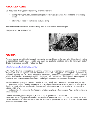 POMOC DLA AZYLU Od dziś przez dwa tygodnie będziemy zbierać w szkole:  karmę mokrą (=puszki, saszetki) dla psów i kotów (ta pierwsza mile widziana w większej ilości)  stare/nowe koce do wyłożenia budy na zimę Rzeczy należy kierować do uczniów klasy 3e i 1c oraz Pani Katarzyny Zych. DZIĘKUJEMY ZA WSPARCIE ADOPCJA Przypominamy o możliwości adopcji zwierząt z tarnowskiego azylu przy ulicy Cmentarnej – zima to szczególnie ciężki czas – może uda nam się znaleźć wspólnie dom dla kolejnych psów? Chętnych proszę o kontakt – Katarzyna Zych https://www.facebook.com/azyl.tarnow „Do Azylu trafiają najczęściej zwierzęta porzucone, niechciane, zagubione, z wypadków drogowych lub w wyniku innych zdarzeń losowych. Przyjętym zwierzętom zapewnia się staranną opiekę, m. in. przez właściwe karmienie, codzienne czyszczenie boksów, ochronę przed warunkami atmosferycznymi. Jedynym, co doskwiera zwierzętom zamkniętym w klatkach, jest brak bliskości człowieka. Szansą na poprawę ich losu jest adopcja.” Każda osoba zabierająca zwierzę z Azylu, w tym i właściciel zwierzęcia, obowiązana jest do: · uiszczenia opłaty (opłatę pobieraną przy wydawaniu zwierząt z Azylu ustalono jako wolny datek, w zależności od możliwości finansowych odbiorcy, przy czym kwota ta nie może być niższa od 20 zł), · podpisania zobowiązania do otoczenia właściwą opieką odebranego z Azylu zwierzęcia, wg oświadczenia. Telefon informacyjny do Azylu 14/625-82-34, w godzinach 7.00-15.00. Zwierzęta można oglądać od wtorku do piątku w godzinach 9:00 - 17:00, w soboty od 7:00 15:00. Wydawanie zwierząt od wtorku do soboty w godzinach od 9:00 - 14.00. Poniedziałek jest dniem wewnętrznym.