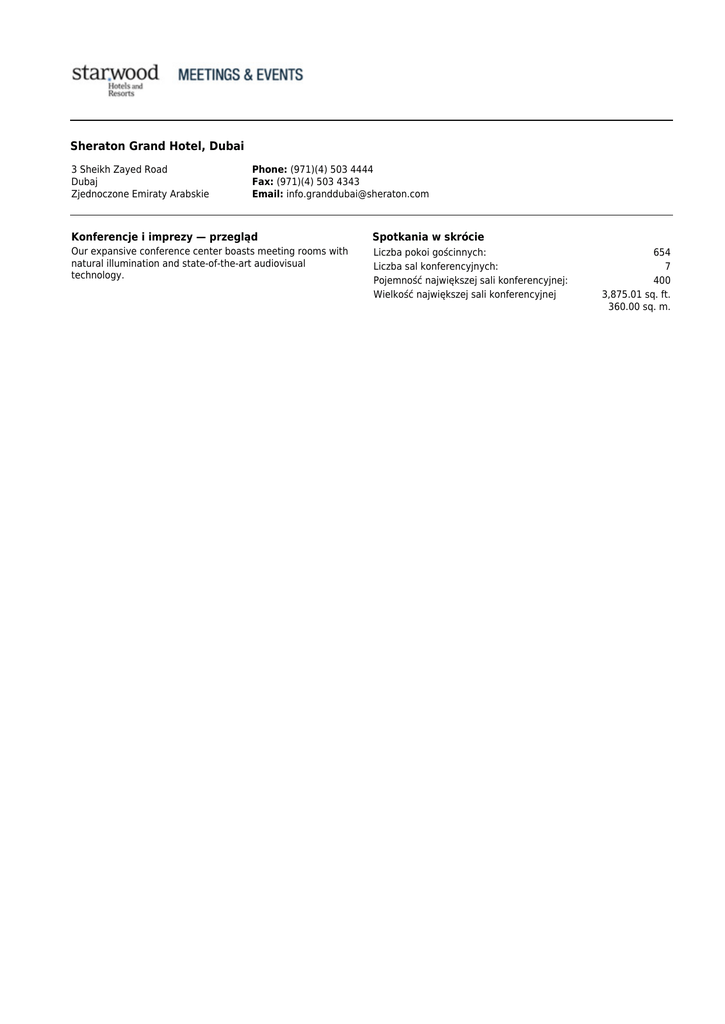Sheraton Grand Hotel, Dubai 3 Sheikh Zayed Road Dubaj Zjednoczone Emiraty Arabskie Phone: (971)(4) 503 4444 Fax: (971)(4) 503 4343 Email: [email protected] Konferencje i imprezy — przegląd Spotkania w skrócie Our expansive conference center boasts meeting rooms with natural illumination and state-of-the-art audiovisual technology. Liczba pokoi gościnnych: Liczba sal konferencyjnych: Pojemność największej sali konferencyjnej: Wielkość największej sali konferencyjnej 654 7 400 3,875.01 sq. ft. 360.00 sq. m. Sheraton Grand Hotel, Dubai 3 Sheikh Zayed Road Dubaj Zjednoczone Emiraty Arabskie Phone: (971)(4) 503 4444 Fax: (971)(4) 503 4343 Email: [email protected] Specyfikacja szczegółowa Nieruchomości Typ obiektu Urban Liczba sal konferencyjnych 7 Rok budowy 2014 Całkowita wielkość sal konferencyjnych 800.00 sq. m. 8,611.13 sq. ft. Liczba budynków 1 Wielkość największej sali konferencyjnej 360.00 sq. m. 3,875.01 sq. ft. Liczba pięter 54 Pojemność największej sali konferencyjnej 400 Pojemność najmniejszej sali konferencyjnej 48.00 sq. m. 516.67 sq. ft. Pojemność najmniejszej sali konferencyjnej 16 Pokoje gościnne Data zameldowania 3:00 PM Internet w pokoju Wireless High Speed Internet Access Data wymeldowania 12:00 PM Liczba pokoi gościnnych 654 Udogodnienia Basen Yes Nazwa basenu Outdoor Rooftop Pool Lokalne & atrakcje Strefa czasowa G Pobliskie lotniska Dubai Airport Kod lotniska DXB Odległość od lotniska 8.23 Kilometers 5.11 Miles Obszar lokalny Located at the forefront of Dubai’s most prominent thoroughfare, the Sheraton Grand Hotel, Dubai seamlessly connects to the heart of the booming business district. Our hotel is just across from the Dubai World Trade Centre and within walking distance of the Dubai Convention Centre. A short drive will take you to DIFC, Dubai Mall, or downtown, and Dubai International Airport (DXB) is 10 kilometers away. Opłaty & podatki Waluta lokalna United Arab Emirates Dirhams Kod waluty AED : $0.00 : $0.00 Lista opłat i podatków : $0.00 : $0.00 : $0.00 Metody płatności • AMEX / OPTIMA • JAPAN CREDIT BUREAU • MASTER CARD • VISA • DINERS/SUNDIN/AMOCO Sheraton Grand Hotel, Dubai 3 Sheikh Zayed Road Dubaj Zjednoczone Emiraty Arabskie Phone: (971)(4) 503 4444 Fax: (971)(4) 503 4343 Email: [email protected] Capacity Charts Room Name Key Dim. (l x w) Area Height Banq. Thtr. Nexus 1 - 7.18 m. x 5.69 m.23.56 ft. x 18.67 ft. 44.00 sq. m. 473.61 sq. ft. 2.70 m. 8.86 ft. 20 40 Nexus 2 - 7.18 m. x 5.53 m.23.56 ft. x 18.14 ft. 44.00 sq. m. 473.61 sq. ft. - 20 40 Nexus 3 - 8.38 m. x 6.85 m.27.49 ft. x 22.47 ft. 51.00 sq. m. 548.96 sq. ft. - 40 40 Nexus 3 + 4 - 16.90 m. x 6.85 m.55.45 ft. x 22.47 ft. 107.00 sq. m. 1,151.74 sq. ft. - 80 100 Nexus 4 - 8.35 m. x 6.85 m.27.40 ft. x 22.47 ft. 56.00 sq. m. 602.78 sq. ft. - 40 40 Nexus 5 - 8.59 m. x 8.25 m.28.18 ft. x 27.07 ft. 90.00 sq. m. 968.75 sq. ft. - 50 60 Nexus 6 - 9.39 m. x 7.80 m.30.81 ft. x 25.59 ft. 48.00 sq. m. 516.67 sq. ft. - - - Starlight 1 - 11.20 m. x 17.00 m.36.75 ft. x 55.77 ft. 180.00 sq. m. 1,937.50 sq. ft. - 80 160 Starlight 2 - 10.32 m. x 17.00 m.33.86 ft. x 55.77 ft. 180.00 sq. m. 1,937.50 sq. ft. - 80 200 Starlight Ballroom - 21.60 m. x 17.00 m.70.87 ft. x 55.77 ft. 360.00 sq. m. 3,875.01 sq. ft. 6.10 m. 20.01 ft. 180 400 Room Name Conf. Rec. Class U-Shp. H. Sq. Dinner Dance Starlight Ballroom - 30 24 15 18 - Starlight Ballroom - 30 24 15 18 - Starlight Ballroom - 60 27 18 21 - Starlight Ballroom - 120 60 42 45 - Starlight Ballroom - 60 27 18 21 - Starlight Ballroom - 75 39 18 21 - Starlight Ballroom 16 - - - - - Starlight Ballroom - 200 75 40 45 - Starlight Ballroom - 200 75 40 45 - Starlight Ballroom - 400 150 60 80 -
