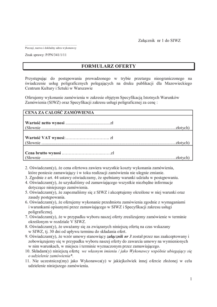 Załącznik nr 1 do SIWZ ......................................................................... Pieczęć, nazwa i dokładny adres wykonawcy Znak sprawy: P/PN/341/1/11 FORMULARZ OFERTY Przystępując do postępowania prowadzonego w trybie przetargu nieograniczonego na świadczenie usług poligraficznych polegających na druku publikacji dla Mazowieckiego Centrum Kultury i Sztuki w Warszawie Oferujemy wykonanie zamówienia w zakresie objętym Specyfikacją Istotnych Warunków Zamówienia (SIWZ) oraz Specyfikacji zakresu usługi poligraficznej za cenę : CENA ZA CAŁOŚĆ ZAMÓWIENIA Wartość netto wynosi ..........................................zł (Słownie ..............................................................................................................................złotych) Wartość VAT wynosi:…………………………. zł (Słownie ..............................................................................................................................złotych) Cena brutto wynosi .……………………….……zł (Słownie ..............................................................................................................................złotych) 2. Oświadczam(y), Ŝe cena ofertowa zawiera wszystkie koszty wykonania zamówienia, które poniesie zamawiający i w toku realizacji zamówienia nie ulegnie zmianie. 3. Zgodnie z art. 44 ustawy oświadczamy, Ŝe spełniamy warunki udziału w postępowaniu. 4. Oświadczam(y), Ŝe uzyskaliśmy od zamawiającego wszystkie niezbędne informacje dotyczące niniejszego zamówienia. 5. Oświadczam(y), Ŝe zapoznaliśmy się z SIWZ i akceptujemy określone w niej warunki oraz zasady postępowania. 6. Oświadczam(y), Ŝe oferujemy wykonanie przedmiotu zamówienia zgodnie z wymaganiami i warunkami opisanymi przez zamawiającego w SIWZ i Specyfikacji zakresu usługi poligraficznej. 7. Oświadczam(y), Ŝe w przypadku wyboru naszej oferty zrealizujemy zamówienie w terminie określonym w rozdziale V SIWZ. 8. Oświadczam(y), Ŝe uwaŜamy się za związanych niniejszą ofertą na czas wskazany w SIWZ, tj. 30 dni od upływu terminu do składania ofert. 9. Oświadczam(y), Ŝe wzór umowy stanowiący załącznik nr 3 został przez nas zaakceptowany i zobowiązujemy się w przypadku wyboru naszej oferty do zawarcia umowy na wymienionych w nim warunkach, w miejscu i terminie wyznaczonym przez zamawiającego. 10. Składam(y) niniejszą ofertę we własnym imieniu / jako Wykonawcy wspólnie ubiegający się o udzielenie zamówienia*. 11. Nie uczestniczę(my) jako Wykonawca(y) w jakiejkolwiek innej ofercie złoŜonej w celu udzielenie niniejszego zamówienia. 1 12. Oświadczam(y), Ŝe przedmiot zamówienia wykonamy : a) samodzielnie * b) z udziałem podwykonawców w zakresie …………………………………………………………….… ……………………………………………………………………………………………………………………….. ( wskazać zakres(pozycję) zamówienia, którego wykonanie powierzy się podwykonawcy) Niepotrzebne skreślić * 13. ZastrzeŜenie Wykonawcy: Zgodnie z art. 8 ust. 3 Ustawy Prawo zamówień publicznych Wykonawca zastrzega, iŜ wymienione niŜej dokumenty składające się na ofertę nie mogą być udostępnione innym uczestnikom postępowania: ……………………………….................................................................................. …………………………………………………………………………………………... 14. Inne informacje Wykonawcy: ………………………………………………………………………………………… ………………………………………………………………………………………… 15. Na …… kolejno ponumerowanych stronach składamy całość oferty. 16. Pod groźbą odpowiedzialności karnej oświadczam(y), Ŝe załączone do oferty dokumenty opisują stan faktyczny i prawny na dzień sporządzania oferty (art. 297 Kodeksu Karnego). ..................................................... …………………………………….. Miejscowość, data Podpis/y osoby/osób upowaŜnionej/ych do reprezentowania wykonawcy 2 Załącznik nr 1a do oferty ......................................................................... Pieczęć, nazwa i dokładny adres wykonawcy Znak sprawy: P/PN/341/1/11 FORMULARZ CENOWY Numer odpowiadający opisowi pozycji w Specyfikacji zakresu usługi poligraficznej 1 01 Nazwa pozycji Nakład Cena netto za druk całego nakładu Stawka VAT (%) Wartość podatku VAT Cena brutto za druk całego nakładu 2 pocztówka 3 600 egz. 4 5 5 6 02 pocztówka 03 pocztówka 12000 szt. (12 nakładów po 1000 szt.) 2000 egz. 04 pocztówka 05 pocztówka 06 pocztówka 15000 egz. (5 nakładów po 3000 egz.) 15000 egz. (3 nakłady po 5000 egz.) 7000 egz. 07 pocztówka 2000 egz. 08 zaproszenie 09 zaproszenie 4000 egz. (4 nakłady po 1000 egz.) 1000 egz. 10 folder 36000 egz. (12 nakładów po 3000 egz.) 3 11 folder 5000 egz. 12 folder 1000 egz. 13 folder 400 egz. 14 broszura 15 broszura 1200 szt. (3 nakłady po 400 szt.) 400 egz. 16 broszura 17 broszura 18 broszura 19 broszura 20 broszura 21 broszura 3000 szt. (3 nakłady po 1000 szt.) 1000 egz. 22 broszura 3000 egz. 23 broszura 3000 egz. 24 ksiąŜka 1000 egz. 25 ksiąŜka 500 egz. 26 plakat 27 plakat 28 plakat 400 szt. (2 nakłady po 200 szt.) 1500 szt. (5 nakładów po 300 szt.) 400 egz. 29 plakat 500 egz. 800 szt. (2 nakłady po 400 szt.) 500 egz. 1000 szt. (2 nakłady po 500 szt.) 500 szt. 4 30 plakat 31 plakat 4000 szt. (4 nakładów po 1000 szt.) 100 szt. 32 plakat 300 egz. 33 plakat 400 egz. 34 plakat 600 egz. 35 kalendarz ścienny 800 egz. 36 wizytówki 8000 egz. (2 nakłady x 40 kompletów x 100 szt.) RAZEM (cena brutto): w tym wartość VAT: wartość netto: Prawidłowo złoŜona oferta powinna uwzględniać koszty związane z odbieraniem materiałów do druku,