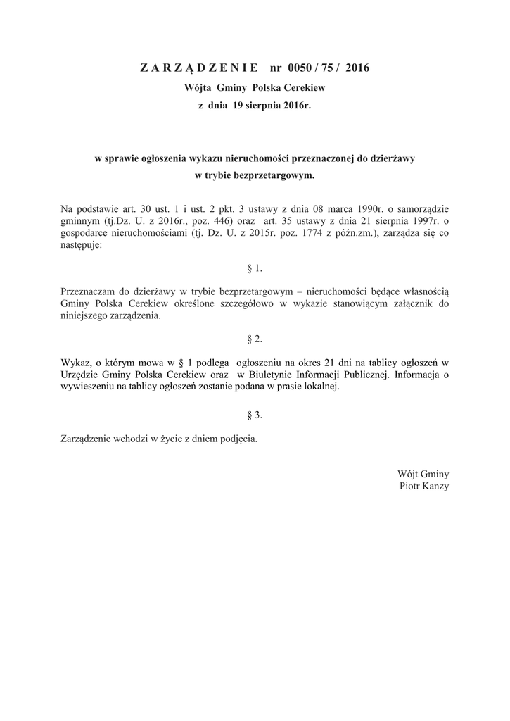 Z A R Z Ą D Z E N I E nr 0050 / 75 / 2016 Wójta Gminy Polska Cerekiew z dnia 19 sierpnia 2016r. w sprawie ogłoszenia wykazu nieruchomości przeznaczonej do dzierżawy w trybie bezprzetargowym. Na podstawie art. 30 ust. 1 i ust. 2 pkt. 3 ustawy z dnia 08 marca 1990r. o samorządzie gminnym (tj.Dz. U. z 2016r., poz. 446) oraz art. 35 ustawy z dnia 21 sierpnia 1997r. o gospodarce nieruchomościami (tj. Dz. U. z 2015r. poz. 1774 z późn.zm.), zarządza się co następuje: § 1. Przeznaczam do dzierżawy w trybie bezprzetargowym – nieruchomości będące własnością Gminy Polska Cerekiew określone szczegółowo w wykazie stanowiącym załącznik do niniejszego zarządzenia. § 2. Wykaz, o którym mowa w § 1 podlega ogłoszeniu na okres 21 dni na tablicy ogłoszeń w Urzędzie Gminy Polska Cerekiew oraz w Biuletynie Informacji Publicznej. Informacja o wywieszeniu na tablicy ogłoszeń zostanie podana w prasie lokalnej. § 3. Zarządzenie wchodzi w życie z dniem podjęcia. Wójt Gminy Piotr Kanzy Załącznik do Zarządzenia Nr 0050 / 75 / 2016 Wójta Gminy Polska Cerekiew z dnia 19 sierpnia 2016r. Wykaz nieruchomości stanowiących mienie Gminy Polska Cerekiew przeznaczonych do dzierżawy w trybie bezprzetargowym Na podstawie art. 35 ust. 1 i 2 ustawy z dnia 21 sierpnia 1997r. o gospodarce nieruchomościami (tj. Dz. U. z 2015r. poz. 1774 z późn.zm.) Wójt Gminy Polska Cerekiew podaje do publicznej wiadomości wykaz nieruchomości przeznaczonych do dzierżawy Lp. Położenie nieruchomości Oznaczenie nieruchomości wg ewidencji gruntów Działka nr 373/1 o pow. 0,0500 ha –RIVa, dla której prowadzona jest księga wieczysta nr OP1K/00044878/6 Opis nieruchomości 1. Obręb Grzędzin Gmina Polska Cerekiew Nieruchomość niezabudowana stanowiąca grunty orne 2. Obręb Jaborowice Gmina Polska Cerekiew Działka nr 114 o pow. 0,0265 ha –Bp, dla której prowadzona jest księga wieczysta nr OP1K/00009945/0 Nieruchomość stanowiąca zurbanizowane tereny niezabudowane 3. Obręb Polska Cerekiew Gmina Polska Cerekiew Działka nr 354 o pow. 0,5100 ha – RII – 0,3000 ha i RIIIa – 0,2100 ha, dla której prowadzona jest księga wieczysta nr 42985 Nieruchomość niezabudowana stanowiąca grunty orne Przeznaczenie nieruchomości i sposób jej zagospodarowania Wysokość opłat z tytułu dzierżawy Plan zagospodarowania przestrzennego Gminy Polska Cerekiew utracił ważność z dniem 01.01.2004r Na podstawie studium uwarunkowań i kierunków działka leży w terenie przeznaczonym na cele rolnicze, wyłączony z zabudowy, szczególnie chroniony, obejmujący grunty narażone na erozję. przeznaczona do wydzierżawienia dotychczasowemu dzierżawcy Plan zagospodarowania przestrzennego Gminy Polska Cerekiew utracił ważność z dniem 01.01.2004r. Na podstawie studium uwarunkowań i kierunków działka leży w obszarze zabudowy mieszkaniowej Stawka czynszu za 1ha gruntu RIVa – 180 zł /rok, raz do roku waloryzowana o wskaźnik wzrostu cen towarów i usług konsumpcyjnych ogłoszony przez Prezesa GUS Plan zagospodarowania przestrzennego Gminy Polska Cerekiew utracił ważność z dniem 01.01.2004r Na podstawie studium uwarunkowań i kierunków działka leży w terenie przeznaczonym na cele rolnicze, chroniony przed zainwestowaniem, obejmujący grunty o bardzo korzystnych warunkach przyrodniczych dla potrzeb rolnictwa przeznaczona do wydzierżawienia dotychczasowemu dzierżawcy Stawka czynszu za 1ha gruntu Bp– 266 zł /rok, raz do roku waloryzowana o wskaźnik wzrostu cen towarów i usług konsumpcyjnych ogłoszony przez Prezesa GUS Stawka czynszu za 1ha gruntu RII – 297zł /rok, gruntu RIIIa – 266 zł /rok raz do roku waloryzowana o wskaźnik wzrostu cen towarów i usług konsumpcyjnych ogłoszony przez Prezesa GUS Termin wnoszenia opłat raz do roku do 30.09. Termin zagospodarowania nieruchomości Umowa na czas oznaczony dłuższy niż 3 lata – do 31.12.2026 roku raz do roku do 30.09. Umowa na czas oznaczony dłuższy niż 3 lata – do 31.12.2026 roku raz do roku do 30.09. Umowa na czas oznaczony dłuższy niż 3 lata – do 31.12.2026 roku Wykaz wywieszono na tablicy ogłoszeń w siedzibie Urzędu Gminy w Polskiej Cerekwi przy ul. Raciborskiej 4 na okres 21 dni tj. od dnia 19.08.2016r. do dnia 09.09.2016r. oraz zamieszczono na stronie internetowej BIP Gminy Polska Cerekiew. Informacja o wywieszeniu wykazu zostanie podana do publicznej wiadomości poprzez ogłoszenie w prasie lokalnej.