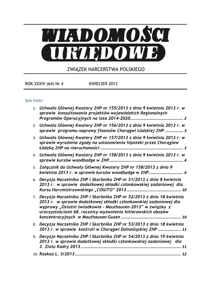 ZWIĄZEK HARCERSTWA POLSKIEGO ROK XXXIV (64) Nr 4 KWIECIEŃ 2013 Spis treści 1. Uchwała Głównej Kwatery ZHP nr 155/2013 z dnia 9 kwietnia 2013 r. w sprawie konsultowania projektów wojewódzkich Regionalnych Programów Operacyjnych na lata 2014-2020 .............................................. 2 2. Uchwała Głównej Kwatery ZHP nr 156/2013 z dnia 9 kwietnia 2013 r. w sprawie programu naprawy finansów Chorągwi Łódzkiej ZHP ................ 3 3. Uchwała Głównej Kwatery ZHP nr 157/2013 z dnia 9 kwietnia 2013 r. w sprawie wyrażenia zgody na ustanowienia hipoteki przez Chorągiew Łódzką ZHP na nieruchomości ........................................................................ 3 4. Uchwała Głównej Kwatery ZHP nr 158/2013 z dnia 9 kwietnia 2013 r. w sprawie kursów woodbadge w ZHP ................................................................ 4 5. Załącznik do Uchwały Głównej Kwatery ZHP nr 158/2013 z dnia 9 kwietnia 2013 r. w sprawie kursów woodbadge w ZHP .............................. 4 6. Decyzja Naczelnika ZHP i Skarbnika ZHP nr 51/2013 z dnia 8 kwietnia 2013 r. w sprawie dodatkowej składki członkowskiej zadaniowej dla Kursu Harcmistrzowskiego „COGITO” 2013 ............................................... 10 7. Decyzja Naczelnika ZHP i Skarbnika ZHP nr 52/2013 z dnia 18 kwietnia 2013 r. w sprawie dodatkowej składki członkowskiej zadaniowej dla wyprawy „Ostatni świadkowie – Mauthausen 2013” w związku z uroczystościami 68. rocznicy wyzwolenia hitlerowskich obozów koncentracyjnych w Mauthausen-Gusen .................................................... 10 8. Decyzja Naczelnika ZHP i Skarbnika ZHP nr 53/2013 z dnia 18 kwietnia 2013 r. w sprawie kontroli w Chorągwi Dolnośląskiej ZHP .................... 11 9. Decyzja Naczelnika ZHP i Skarbnika ZHP nr 54/2013 z dnia 19 kwietnia 2013 r. w sprawie dodatkowej składki członkowskiej zadaniowej dla 3. Zlotu Kadry 2013 ....................................................................................... 11 10. Rozkaz L. 3/2013 ............................................................................................ 12 ROK XXXV (64) nr 4 Wiadomości Urzędowe 2 Uchwała Głównej Kwatery ZHP nr 155/2013 z dnia 9 kwietnia 2013 r. w sprawie konsultowania projektów wojewódzkich Regionalnych Programów Operacyjnych na lata 2014-2020 1. Główna Kwatera ZHP, na podstawie § 70 ust. 3 pkt 13) i pkt 14) Statutu ZHP: 1) poleca wszystkim chorągwiom obowiązkowe wzięcie udziału w konsultacjach projektów wojewódzkich Regionalnych Programów Operacyjnych, zwanych dalej RPO, na lata 2014-2020, 2) zobowiązuje Skarbnika ZHP do przygotowania i przesłania komendantom chorągwi projektu opisu statutowych działań ZHP leżących w obszarze właściwości RPO, zgodnie ze stosowaną metodyką opisu priorytetów i działań RPO w terminie do 12 kwietnia 2013 r., 3) zobowiązuje komendantów chorągwi ZHP do: a) przekazania koordynatorowi szczegółowej informacji o stanie prac nad projektem RPO na lata 2014-2020 we właściwym dla danej chorągwi samorządzie wojewódzkim w terminie do 24 kwietnia 2013 r., b) dostosowania projektu, o którym mowa w ust. 2 do metodyki RPO właściwego województwa i przedstawienia władzom województwa zmodyfikowanego projektu w terminie do 20 maja 2013 r., c) sprawozdawania z wykonania wyżej wymienionych działań w terminach i trybie uzgodnionych z koordynatorem, nie rzadziej niż jeden raz w miesiącu, w okresie od 1 maja 2013 r. do 31 grudnia 2013 r., 4) ustanawia skarbnika ZHP hm. Lucjana Brudzyńskiego koordynatorem procesu będącego przedmiotem niniejszej uchwały. Celem udziału w konsultacjach jest wypracowanie możliwie najlepszych projektów priorytetów i działań wojewódzkich RPO uwzględniających statutową działalność Związku Harcerstwa Polskiego. 2. Uchwała wchodzi w życie z dniem podjęcia. Naczelnik Związku Harcerstwa Polskiego hm. Małgorzata Sinica ROK XXXV (64) nr 4 Wiadomości Urzędowe 3 Uchwała Głównej Kwatery ZHP nr 156/2013 z dnia 9 kwietnia 2013 r. w sprawie programu naprawy finansów Chorągwi Łódzkiej ZHP 1. Główna Kwatera ZHP, na podstawie § 70 ust. 3 pkt 14) Statutu ZHP zobowiązuje Komendę Chorągwi Łódzkiej ZHP do: 1) opracowania, przy współudziale pozostałych władz chorągwi, programu naprawy finansów chorągwi, 2) przekazania wyżej wymienionego programu wraz z opiniami władz chorągwi do akceptacji Głównej Kwatery ZHP w terminie do 30 maja 2013 r. 2. Uchwała wchodzi w życie z dniem podjęcia. Naczelnik Związku Harcerstwa Polskiego hm. Małgorzata Sinica Uchwała Głównej Kwatery ZHP nr 157/2013 z dnia 9 kwietnia 2013 r. w sprawie wyrażenia zgody na ustanowienia hipoteki przez Chorągiew Łódzką ZHP na nieruchomości Główna Kwatera Związku Harcerstwa Polskiego, działając na podstawie § 70 ust. 3 pkt 7) oraz § 77 ust. 1 Statutu ZHP, wyraża zgodę na ustanowienie hipoteki, w wysokości 225 000,00 zł (słownie zł: dwieście dwadzieścia pięć tysięcy 0/100 złotych), na nieruchomości stanowiącej własność Chorągwi Łódzkiej ZHP, położnej w miejscowości Jarosławiec, gmina Postomino, obejmującej zabudowane działki nr: 2/3, 13/1, 13/11, 13/12 o łącznej powierzchni 2,0562 ha, dla których Sąd Rejonowy w Sławnie IV Wydział Ksiąg Wieczystych prowadzi księgę wieczystą o numerze Kw KO1E/00012180/0, w celu zabezpieczenia kredytu udzielonego Chorągwi Łódzkiej ZHP przez Bank Zachodni WBK S.A w rachunku bieżącym chorągwi do wysokości 225 000,00 zł (słownie zł: dwieście dwadzieścia pięć tysięcy 0/100 złotych). Kredyt ma być spłacony zgodnie z harmonogramem do 1 marca 2016 r. Naczelnik Związku Harcerstwa Polskiego hm. Małgorzata Sinica ROK XXXV (64) nr 4 Wiadomości Urzędowe 4 Uchwała Głównej Kwatery ZHP nr 158/2013 z dnia 9 kwietnia 2013 r. w sprawie kursów woodbadge w ZHP 1. Główna Kwatera ZHP, na podstawie § 70 ust. 3 pkt 12) Statutu ZHP zatwierdza Opis kur