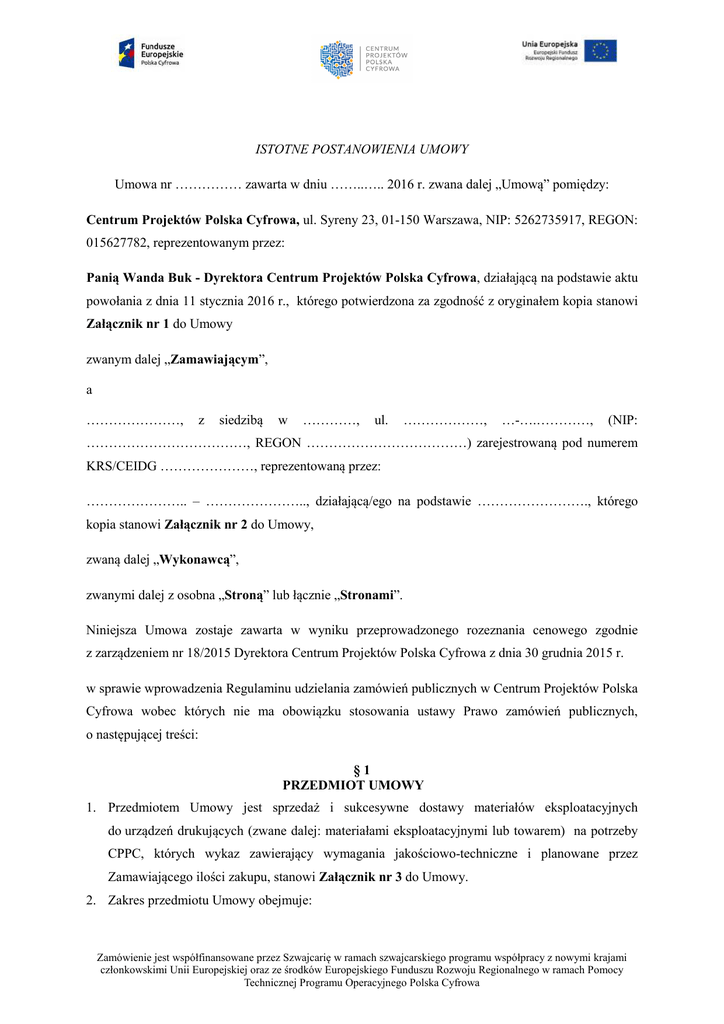 ISTOTNE POSTANOWIENIA UMOWY Umowa nr …………… zawarta w dniu ……..….. 2016 r. zwana dalej „Umową” pomiędzy: Centrum Projektów Polska Cyfrowa, ul. Syreny 23, 01-150 Warszawa, NIP: 5262735917, REGON: 015627782, reprezentowanym przez: Panią Wanda Buk - Dyrektora Centrum Projektów Polska Cyfrowa, działającą na podstawie aktu powołania z dnia 11 stycznia 2016 r., którego potwierdzona za zgodność z oryginałem kopia stanowi Załącznik nr 1 do Umowy zwanym dalej „Zamawiającym”, a …………………, z siedzibą w …………, ul. ………………, …-….…………, (NIP: ………………………………, REGON ………………………………) zarejestrowaną pod numerem KRS/CEIDG …………………, reprezentowaną przez: ………………….. – ………………….., działającą/ego na podstawie ……………………., którego kopia stanowi Załącznik nr 2 do Umowy, zwaną dalej „Wykonawcą”, zwanymi dalej z osobna „Stroną” lub łącznie „Stronami”. Niniejsza Umowa zostaje zawarta w wyniku przeprowadzonego rozeznania cenowego zgodnie z zarządzeniem nr 18/2015 Dyrektora Centrum Projektów Polska Cyfrowa z dnia 30 grudnia 2015 r. w sprawie wprowadzenia Regulaminu udzielania zamówień publicznych w Centrum Projektów Polska Cyfrowa wobec których nie ma obowiązku stosowania ustawy Prawo zamówień publicznych, o następującej treści: §1 PRZEDMIOT UMOWY 1. Przedmiotem Umowy jest sprzedaż i sukcesywne dostawy materiałów eksploatacyjnych do urządzeń drukujących (zwane dalej: materiałami eksploatacyjnymi lub towarem) na potrzeby CPPC, których wykaz zawierający wymagania jakościowo-techniczne i planowane przez Zamawiającego ilości zakupu, stanowi Załącznik nr 3 do Umowy. 2. Zakres przedmiotu Umowy obejmuje: Zamówienie jest współfinansowane przez Szwajcarię w ramach szwajcarskiego programu współpracy z nowymi krajami członkowskimi Unii Europejskiej oraz ze środków Europejskiego Funduszu Rozwoju Regionalnego w ramach Pomocy Technicznej Programu Operacyjnego Polska Cyfrowa a) dostawę do siedziby Zamawiającego przy ul. Syreny 23 w Warszawie (siedziba Zamawiającego mieści się na 4 kondygnacjach budynku, tj. 3, 4, 5 i 6 piętrze; w budynku dostępna jest winda) wraz z załadunkiem i rozładunkiem materiałów eksploatacyjnych wyszczególnionych w Wykazie materiałów eksploatacyjnych, stanowiącym Załącznik nr 3 do Umowy; b) odbiór pustych opakowań po zużytych materiałach eksploatacyjnych; c) udzielenie co najmniej 24 miesięcznej gwarancji jakości na dostarczone materiały eksploatacyjne. 3. Wykonawca oświadcza, że dostarczone materiały eksploatacyjne: a) są oryginalne i fabrycznie nowe (nie są to materiały równoważne, eksploatacyjne regenerowane, prefabrykowane oraz nie wchodziły wcześniej, w całości lub w części, w skład innych materiałów) oraz odpowiadają normom wydajnościowym dla wkładów drukujących z tonerem kolorowym – ISO/IEC 19798 oraz dla wkładów drukujących z tonerem monochromatycznym – ISO/IEC 19752, a także spełniają wymagania jakościowo-techniczne określone w Wykazie materiałów eksploatacyjnych stanowiącym Załącznik nr 3 do Umowy; b) mają maksymalną wydajność i maksymalną pojemność przewidzianą do stosowania przez producenta urządzenia; c) posiadają co najmniej 24 miesięczny okres gwarancji; d) posiadają co najmniej 24 miesięczny termin przydatności do użycia, gdzie termin liczony będzie każdorazowo od daty podpisania protokołu odbioru. §2 ZASADY WYKONANIA UMOWY 1. Strony zobowiązują się do wzajemnej współpracy niezbędnej do prawidłowego wykonania Umowy. Wykonawca zobowiązuje się do wykonania Umowy z należytą starannością wynikającą z profesjonalnego charakteru prowadzonej przez niego działalności. 2. Wykonawca oświadcza, że dysponuje wszelkimi niezbędnymi informacjami i pozwoleniami wymaganymi przez przepisy prawa w dziedzinach związanych z wykonaniem przedmiotu Umowy, a także dysponuje odpowiednim personelem i odpowiednimi środkami gwarantującymi profesjonalną realizację Umowy. 3. Strony zobowiązują się do zachowania poufności w trakcie obowiązywania Umowy, jak i po jej wygaśnięciu albo rozwiązaniu. Strony zobowiązują się nie ujawniać osobom trzecim jakichkolwiek informacji (bez względu na ich formę), jakie uzyskały w związku z zawarciem, wykonaniem i rozwiązaniem niniejszej Umowy, co do których mogą powziąć podejrzenie, iż są informacjami poufnymi lub, że jako takie są traktowane przez drugą Stronę („Informacje chronione”). Każda Zamówienie jest współfinansowane przez Szwajcarię w ramach szwajcarskiego programu współpracy z nowymi krajami członkowskimi Unii Europejskiej oraz ze środków Europejskiego Funduszu Rozwoju Regionalnego w ramach Pomocy Technicznej Programu Operacyjnego Polska Cyfrowa ze Stron może ujawnić informacje chronione jedynie w przypadku, gdy wymagają tego przepisy prawa powszechnie obowiązującego. §3 TERMIN REALIZACJI UMOWY 1. Umowa zostaje zawarta na czas określony, tj. od 1 kwietnia 2016 r. do dnia 31 stycznia 2017 r. lub do wyczerpania kwoty, określonej w § 5 ust. 1 Umowy, w zależności, która z wymienionych okoliczności nastąpi wcześniej. 2. O wyczerpaniu kwoty wskazanej w § 5 ust. 1 Umowy, Zamawiający poinformuje Wykonawcę w terminie 10 dni od dnia zaistnienia ww. zdarzenia. §4 REALIZACJA I ODBIÓR PRZEDMIOTU UMOWY 1. Przedmiot zamówienia realizowany będzie sukcesywnie, w zależności od bieżących potrzeb Zamawiającego, na podstawie zamówień każdorazowo składanych drogą elektroniczną za pośrednictwem osób wskazanych w ust. 9, o minimalnej wartości brutto ............. 2. Wykonawca zobowiązany będzie do realizacji poszczególnych zamówień w terminie 5 dni roboczych od dnia otrzymania zamówienia, o którym mowa w ust. 1, w godzinach 08:30-15:00 w cenach jednostkowych zgodnych z cenami podan