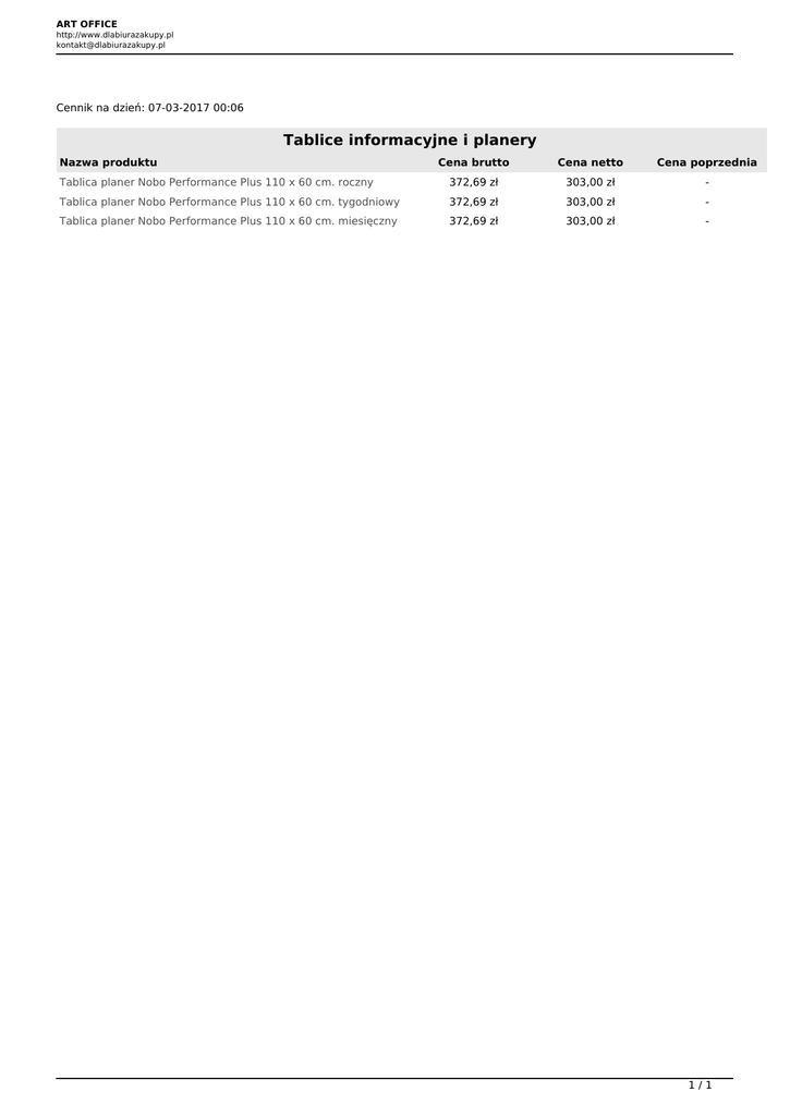 ART OFFICE http://www.dlabiurazakupy.pl [email protected] Cennik na dzień: 07-03-2017 00:06 Tablice informacyjne i planery Nazwa produktu Cena brutto Cena netto Cena poprzednia Tablica planer Nobo Performance Plus 110 x 60 cm. roczny 372,69 zł 303,00 zł - Tablica planer Nobo Performance Plus 110 x 60 cm. tygodniowy 372,69 zł 303,00 zł - Tablica planer Nobo Performance Plus 110 x 60 cm. miesięczny 372,69 zł 303,00 zł - 1/1 Powered by TCPDF (www.tcpdf.org)