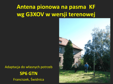 Antena pionowa na pasma KF wg G3XOV w wersji terenowej Adaptacja do własnych potrzeb SP6 GTN Franciszek, Świdnica Zalety anteny: • • • • • praca na wielu pasmach, łatwość montażu w terenie, niski koszt wykonania, ustawienie na ziemi, niska rezystancja wejściowa (35÷70 Ω). Wymiary anteny: Indukcyjność cewki wynosi ok. 10 μH. Tak wykonana antena pozwala na pracę na wszystkich pasmach KF. Jednak ze względu na zmieniającą się, w zależności od pasma, rezystancję wejściową (35÷70 Ω) i SWR (1,4÷1,8), zachodzi potrzeba użycia ATU. Rozłożenie na ziemi czterech przeciwwag o długości 10,20 m na pewno poprawi kąt promieniowania.