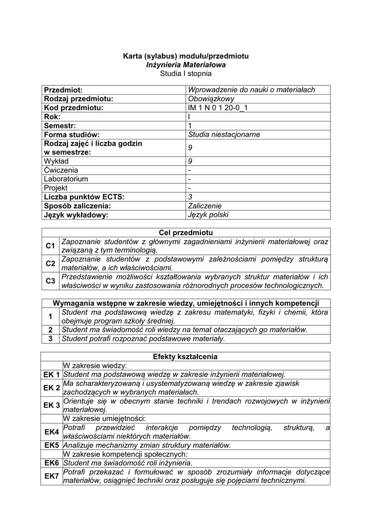 Karta (sylabus) modułu/przedmiotu Inżynieria Materiałowa Studia I stopnia Przedmiot: Rodzaj przedmiotu: Kod przedmiotu: Rok: Semestr: Forma studiów: Rodzaj zajęć i liczba godzin w semestrze: Wykład Ćwiczenia Laboratorium Projekt Liczba punktów ECTS: Sposób zaliczenia: Język wykładowy: Wprowadzenie do nauki o materiałach Obowiązkowy IM 1 N 0 1 20-0_1 I 1 Studia niestacjonarne 9 9 3 Zaliczenie Język polski Cel przedmiotu Zapoznanie studentów z głównymi zagadnieniami inżynierii materiałowej oraz C1 związaną z tym terminologią. Zapoznanie studentów z podstawowymi zależnościami pomiędzy strukturą C2 materiałów, a ich właściwościami. Przedstawienie możliwości kształtowania wybranych struktur materiałów i ich C3 właściwości w wyniku zastosowania różnorodnych procesów technologicznych. Wymagania wstępne w zakresie wiedzy, umiejętności i innych kompetencji Student ma podstawową wiedzę z zakresu matematyki, fizyki i chemii, która 1 obejmuje program szkoły średniej. 2 Student ma świadomość roli wiedzy na temat otaczających go materiałów. 3 Student potrafi rozpoznać podstawowe materiały. Efekty kształcenia W zakresie wiedzy: EK 1 Student ma podstawową wiedzę w zakresie inżynierii materiałowej. Ma scharakteryzowaną i usystematyzowaną wiedzę w zakresie zjawisk EK 2 zachodzących w wybranych materiałach. Orientuje się w obecnym stanie techniki i trendach rozwojowych w inżynierii EK 3 materiałowej. W zakresie umiejętności: Potrafi przewidzieć interakcje pomiędzy technologią, strukturą, a EK4 właściwościami niektórych materiałów. EK5 Analizuje mechanizmy zmian struktury materiałów. W zakresie kompetencji społecznych: EK6 Student ma świadomość roli inżynieria. Potrafi przekazać i formułować w sposób zrozumiały informacje dotyczące EK7 materiałów, osiągnięć techniki oraz posługuje się pojęciami technicznymi. W1 W2 W3 W4 W5 W6 1 2 Treści programowe przedmiotu Forma zajęć – wykłady Treści programowe Rola i znaczenie nauki o materiałach w rozwoju współczesnej wiedzy inżynierskiej. Współczesne kierunki rozwoju materiałów stymulowane osiągnięciami nauki. Materia i jej składowe. Podstawowe pojęcia stosowane w inżynierii materiałowej związane z materiałami. Wiązania międzyatomowe i ich związek z właściwościami materiałów. Charakterystyka i techniki wytwarzania głównych grup materiałów: metale, materiały ceramiczne, szkła, polimery, materiały kompozytowe, stopy z pamięcią kształtu, nanomateriały i biomateriały. Budowa krystaliczna ciał stałych. Elementy krystalografii geometrycznej. Wpływ rodzaju wiązań w kryształach na właściwości fizyczne. Monoryształy, polikryształy, materiały wielofazowe i granice rozdziału. Układy równowagi z eutektyką, perytektyką, eutektoidem. Polimorfizm. Budowa wykresów równowagi na podstawie danych doświadczalnych. Wykres Fe-Fe3C oraz Fe-C (grafit). Rodzaje stopów żelaza z węglem. Domieszki i zanieczyszczenia w stopach metali. Podstawy obróbki cieplnej stopów żelaza. Przemiany fazowe w stanie stałym przy nagrzewaniu i chłodzeniu. Wprowadzenie do wykresów CTPi i CTPc. Metody dydaktyczne Wykład z prezentacją multimedialną/wykład problemowy. Zadania problemowe. Obciążenie pracą studenta Średnia liczba godzin na zrealizowanie Forma aktywności aktywności Godziny kontaktowe z wykładowcą, 11 w tym: Godziny kontaktowe z wykładowcą realizowane w formie zajęć 9 dydaktycznych. Godziny kontaktowe z wykładowcą, 2 rezlizowane w formie konsultacji. Praca własna studenta, w tym: 64 Przygotowanie do zaliczenia 64 Łączny czas pracy studenta 75 Sumaryczna liczba punktów ECTS dla 3 przedmiotu: Liczba punktów ECTS w ramach zajęć o charakterze praktycznym (ćwiczenia, laboratoria, projekty) 1 2 3 1 2 Literatura podstawowa Praca zbior. pod red. A. Werońskiego: Ćwiczenia laboratoryjne z inżynierii materiałowej. Wyd. Politechniki Lubelskiej, Lublin 2002. Blicharski M.; Wstęp do inżynierii materiałowej. WNT, Warszawa 2001. Dobrzański L. A.: Podstawy nauki o materiałach i metaloznawstwo. Materiały inżynierskie z podstawami projektowania materiałowego. WNT, GliwiceWarszawa 2002. Literatura uzupełniająca Ashby M. F., Jones D. R. H.: Materiały inżynierskie. Tom 1. Właściwości i zastosowania. WNT, Warszawa 1995. Błaszczyński J., Stupnicka H., Weroński A.: Procesy technologiczne podwyższające trwałość elementów maszyn, urządzeń i pojazdów. Wyd. Uczelniane Politechniki Lubelskiej, Lublin 2000. Macierz efektów kształcenia Odniesienie danego efektu kształcenia do efektów Efekt kształcenia zdefiniowanych dla całego programu (PEK) IMIA_W05 EK 1 (+++) IMIA_W06 EK 2 (++) IMIA_W11 EK 3 (+) IMIA_W05 (+++) IMIA_W07 (++) EK4 IMIA_W08 (++) IMIA_U12 (++) IMIA_W07 EK 5 (++) IMIA_U12 EK 6 (++) IMIA_U12 EK 7 (++) Cele przedmiotu Treści programowe Metody dydaktyczne Metody oceny C1, C2, C3 W1, W2 1 O1 C2, C3 W3, W6 1 O1 C1 W1, W2 1 O1 C2, C3 W2, W5, W6 1 O1 C2, C3 W4 1 O1 C1 W1 1 O1 C1, C2, C3 W2 1 O1 Metody i kryteria oceny Symbol metody oceny O1 Opis metody oceny Zaliczenie Autor Mgr inż. Monika Ostapiuk programu: Adres e-mail: [email protected] Jednostka Katedra Inżynierii Materiałowej organizacyjna: Próg zaliczeniowy 50%