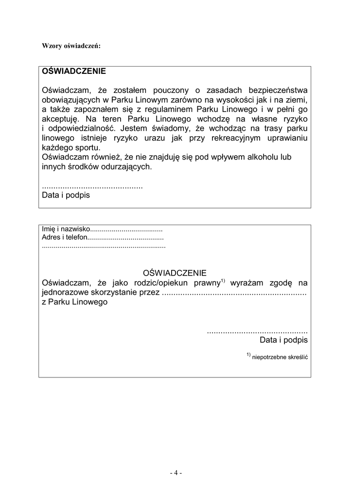 Wzory oświadczeń: OŚWIADCZENIE Oświadczam, że zostałem pouczony o zasadach bezpieczeństwa obowiązujących w Parku Linowym zarówno na wysokości jak i na ziemi, a także zapoznałem się z regulaminem Parku Linowego i w pełni go akceptuję. Na teren Parku Linowego wchodzę na własne ryzyko i odpowiedzialność. Jestem świadomy, że wchodząc na trasy parku linowego istnieje ryzyko urazu jak przy rekreacyjnym uprawianiu każdego sportu. Oświadczam również, że nie znajduję się pod wpływem alkoholu lub innych środków odurzających. ............................................ Data i podpis Imię i nazwisko..................................... Adres i telefon....................................... ............................................................... OŚWIADCZENIE Oświadczam, że jako rodzic/opiekun prawny1) wyrażam zgodę na jednorazowe skorzystanie przez ............................................................... z Parku Linowego ............................................ Data i podpis 1) -4- niepotrzebne skreślić