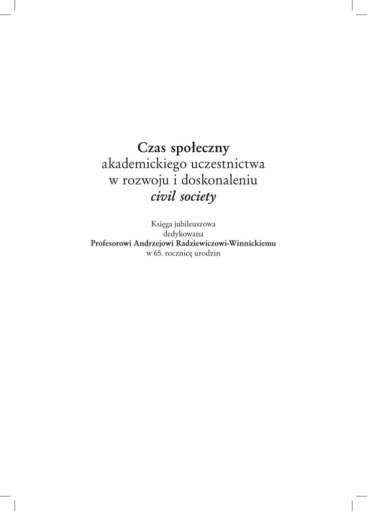 Czas społeczny akademickiego uczestnictwa w rozwoju i doskonaleniu civil society Księga jubileuszowa dedykowana Profesorowi Andrzejowi Radziewiczowi-Winnickiemu w 65. rocznicę urodzin NR 2805 Czas społeczny akademickiego uczestnictwa w rozwoju i doskonaleniu civil society Księga jubileuszowa dedykowana Profesorowi Andrzejowi Radziewiczowi-Winnickiemu w 65. rocznicę urodzin pod redakcją Ewy Syrek Wydawnictwo Uniwersytetu Śląskiego Katowice 2010 Redaktor serii: Pedagogika Anna Nowak Recenzent Janusz Kirenko Wprowadzenie Przypadł mi w udziale zaszczyt przygotowania księgi jubileuszowej dedykowanej Profesorowi Andrzejowi Radziewiczowi-Winnickiemu, od 1980 roku kierownikowi Katedry Pedagogiki Społecznej Uniwersytetu Śląskiego, z okazji 65. rocznicy Jego urodzin oraz 40-lecia pracy zawodowej. Od 1977 roku współpracuję z Profesorem, będąc świadkiem wielu znaczących, nie tylko naukowych, wydarzeń związanych z Jego Osobą w zmieniającym się czasie społecznym. O niektórych z nich pozwolę sobie tu wspomnieć. Rozpoczynając od zainteresowań naukowych Profesora Andrzeja Radziewicza-Winnickiego, pragnę podkreślić, że były i pozostają ściśle związane z pedagogiką społeczną i wybranymi elementami socjologii wychowania (edukacji)1, o czym przekonuje zamieszczona w niniejszym zbiorze bibliografia prac Jubilata. Do czasu uzyskania tytułu profesora nadzwyczajnego Jego zainteresowania naukowo-badawcze dotyczyły różnych aspektów przystosowania absolwentów zasadniczych szkół zawodowych do pracy zawodowej w uspołecznionym przemyśle ze szczególnym uwzględnieniem procesów adaptacji oraz identyfikacji w grupie pracowniczej. Przemysłowy zakład pracy analizowany był jako specyficzne środowisko wychowawcze. Kontynuując liczne badania empiryczne w pozaszkolnych środowiskach wychowawczych, wyrażał swoje przekonanie o znaczeniu prowadzenia środowiskowych badań pedagogicznych dla rozwoju teorii i praktyki wychowania. Innym nurtem zainteresowań Profesora była analiza funkcji pedagoga zatrudnionego w przemysłowym zakładzie pracy i w spółdzielczości, związana z usytuowaniem 1 Zob. Andrzej Radziewicz-Winnicki. Twórczość naukowa, bibliografia prac, działalność badawcza, praca dydaktyczna w latach 1970—2005. Oprac. E. Sy rek, A. Roter. Katowice, Wydawnictwo „Śląsk”, 2005. 6 Wprowadzenie pedagoga w formalnej strukturze zakładu pracy. W latach 80. XX wieku Jego aktywność badawcza skierowana była na wybrane lokalne środowiska wychowawcze ówczesnego województwa katowickiego: na Górnym Śląsku i w Zagłębiu Dąbrowskim, oraz na wybrane problemy planowania oświaty w warunkach scentralizowanej wówczas gospodarki. Nakreślając wizję planowania społecznego w aspekcie zmian strukturalnych i innowacji społecznej w społeczności lokalnej, Profesor wzbudził znaczące zainteresowanie problematyką przede wszystkim poza granicami kraju. W tym okresie blisko 20 artykułów Profesora ukazało się w zagranicznych periodykach naukowych w języku angielskim. Warto dodać, że w Bibliotece Kongresu Stanów Zjednoczonych znajduje się 12 pozycji autorskich i zbiorowych prac Profesora. Począwszy od lat 90. ubiegłego stulecia Profesor Andrzej Radziewicz-Winnicki skierował swoje zainteresowania naukowe na wybrane społeczno-edukacyjne problemy w okresie intensywnie przebiegającej zmiany społecznej, opisując ów obszar badawczy określeniami: „niepokojąca rodzima współczesność” lub „edukacja a życie codzienne”. Dostrzegając w środowiskach lokalnych współczesnej Polski osoby doświadczające poczucia zagubienia w świecie nowych reguł, wartości i wzorów postępowania, Badacz oczekiwał, że kompensacyjne, nowatorsko organizowane formy pomocy i samopomocy pozwolą tworzyć takie typy idealne społeczeństwa obywatelskiego (civil society), które stanowić będą dla jednostki społeczeństwo w pełni przyjazne2. Imponujący dorobek naukowy przekonuje, że w okresie swojej wieloletniej działalności naukowo-badawczej Profesor wypracował ważne syntezy teoretyczne o interdyscyplinarnym wymiarze, zawierające istotne implikacje teoretyczno-poznawcze i praktyczno-społeczne dalszego rozwoju nauk o wychowaniu. Analizując dorobek naukowy Profesora Andrzeja Radziewicza-Winnickiego w zmieniającym się czasie społecznym, pozostajemy w przekonaniu o otwartości i wnikliwości poznawczo-badawczej Profesora oraz niezwykłej umiejętności dostrzegania najważniejszych problemów społeczno-wychowawczych właściwych dla zmienności czasu społecznego, w którym Profesor wypełniał swoją rolę uczonego. Problem czasu jest zagadnieniem podejmowanym od zarania dziejów zwłaszcza przez filozofów, stopniowo wprowadzanym także w innych dyscyplinach naukowych, by stać się współcześnie ważnym przedmiotem badań nauk humanistycznych i przyrodniczych z tendencją do podejmowania prób utworzenia interdyscyplinarnej płaszczyzny badania czasu. Tenden2 Kwestie te kontynuuje i rozwija Profesor Andrzej R ad z iew ic z-W i n n ick i w książce: Pedagogika społeczna. W obliczu realiów codzienności. Warszawa, WAiP, 2008 (zob. rozdz. 13: Przewodnie idee postępu społecznego w społeczeństwie obywatelskim, partycypacja społeczna a rola i znaczenie kapitału społecznego). Wprowadzenie cje te znajdują wyraz w działalności i publikacjach International Society for the Study of Time oraz w próbach stworzenia chronozofii — nowej integralnej nauki o czasie. Socjologiczna refleksja nad czasem zapoczątkowana została w latach 70. XX wieku, aktualnie można mówić o kształtowaniu się socjologii czasu jako wyodrębnionej dziedziny badań z instytucjonalnym zapleczem utworzonego w 1984 roku Association for the Social Studies of Time. Do kształtowania się współcześnie wyspecjalizowanej dziedziny badań — socjologii czasu — przyczynili się m.in. Eviatar Zerubavel, Helga Nowotny, Barbara Adam, Michael Young, Norbert Elias, Pi