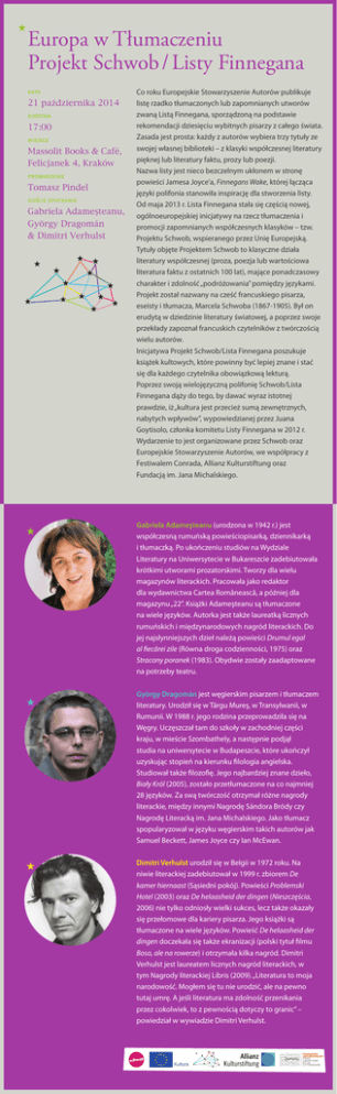 « Europa w Tłumaczeniu Projekt Schwob / Listy Finnegana data 21 października 2014 godzina 17:00 miejsce Massolit Books & Café, Felicjanek 4, Kraków prowadzenie Tomasz Pindel goście spotkania Gabriela Adameşteanu, György Dragomán & Dimitri Verhulst « « « Co roku Europejskie Stowarzyszenie Autorów publikuje listę rzadko tłumaczonych lub zapomnianych utworów zwaną Listą Finnegana, sporządzoną na podstawie rekomendacji dziesięciu wybitnych pisarzy z całego świata. Zasada jest prosta: każdy z autorów wybiera trzy tytuły ze swojej własnej biblioteki – z klasyki współczesnej literatury pięknej lub literatury faktu, prozy lub poezji. Nazwa listy jest nieco bezczelnym ukłonem w stronę powieści Jamesa Joyce’a, Finnegans Wake, której łącząca języki polifonia stanowiła inspirację dla stworzenia listy. Od maja 2013 r. Lista Finnegana stała się częścią nowej, ogólnoeuropejskiej inicjatywy na rzecz tłumaczenia i promocji zapomnianych współczesnych klasyków – tzw. Projektu Schwob, wspieranego przez Unię Europejską. Tytuły objęte Projektem Schwob to klasyczne działa literatury współczesnej (proza, poezja lub wartościowa literatura faktu z ostatnich 100 lat), mające ponadczasowy charakter i zdolność „podróżowania” pomiędzy językami. Projekt został nazwany na cześć francuskiego pisarza, eseisty i tłumacza, Marcela Schwoba (1867-1905). Był on erudytą w dziedzinie literatury światowej, a poprzez swoje przekłady zapoznał francuskich czytelników z twórczością wielu autorów. Inicjatywa Projekt Schwob/Lista Finnegana poszukuje książek kultowych, które powinny być lepiej znane i stać się dla każdego czytelnika obowiązkową lekturą. Poprzez swoją wielojęzyczną polifonię Schwob/Lista Finnegana dąży do tego, by dawać wyraz istotnej prawdzie, iż „kultura jest przecież sumą zewnętrznych, nabytych wpływów”, wypowiedzianej przez Juana Goytisolo, członka komitetu Listy Finnegana w 2012 r. Wydarzenie to jest organizowane przez Schwob oraz Europejskie Stowarzyszenie Autorów, we współpracy z Festiwalem Conrada, Allianz Kulturstiftung oraz Fundacją im. Jana Michalskiego. Gabriela Adameşteanu (urodzona w 1942 r.) jest współczesną rumuńską powieściopisarką, dziennikarką i tłumaczką. Po ukończeniu studiów na Wydziale Literatury na Uniwersytecie w Bukareszcie zadebiutowała krótkimi utworami prozatorskimi. Tworzy dla wielu magazynów literackich. Pracowała jako redaktor dla wydawnictwa Cartea Românească, a później dla magazynu „22”. Książki Adameşteanu są tłumaczone na wiele języków. Autorka jest także laureatką licznych rumuńskich i międzynarodowych nagród literackich. Do jej najsłynniejszych dzieł należą powieści Drumul egal al fiecărei zile (Równa droga codzienności, 1975) oraz Stracony poranek (1983). Obydwie zostały zaadaptowane na potrzeby teatru. György Dragomán jest węgierskim pisarzem i tłumaczem literatury. Urodził się w Târgu Mureş, w Transylwanii, w Rumunii. W 1988 r. jego rodzina przeprowadziła się na Węgry. Uczęszczał tam do szkoły w zachodniej części kraju, w mieście Szombathely, a następnie podjął studia na uniwersytecie w Budapeszcie, które ukończył uzyskując stopień na kierunku filologia angielska. Studiował także filozofię. Jego najbardziej znane dzieło, Biały Król (2005), zostało przetłumaczone na co najmniej 28 języków. Za swą twórczość otrzymał różne nagrody literackie, między innymi Nagrodę Sándora Bródy czy Nagrodę Literacką im. Jana Michalskiego. Jako tłumacz spopularyzował w języku węgierskim takich autorów jak Samuel Beckett, James Joyce czy Ian McEwan. Dimitri Verhulst urodził się w Belgii w 1972 roku. Na niwie literackiej zadebiutował w 1999 r. zbiorem De kamer hiernaast (Sąsiedni pokój). Powieści Problemski Hotel (2003) oraz De helaasheid der dingen (Nieszczęścia, 2006) nie tylko odniosły wielki sukces, lecz także okazały się przełomowe dla kariery pisarza. Jego książki są tłumaczone na wiele języków. Powieść De helaasheid der dingen doczekała się także ekranizacji (polski tytuł filmu Boso, ale na rowerze) i otrzymała kilka nagród. Dimitri Verhulst jest laureatem licznych nagród literackich, w tym Nagrody literackiej Libris (2009). „Literatura to moja narodowość. Mogłem się tu nie urodzić, ale na pewno tutaj umrę. A jeśli literatura ma zdolność przenikania przez cokolwiek, to z pewnością dotyczy to granic” – powiedział w wywiadzie Dimitri Verhulst. Kultura