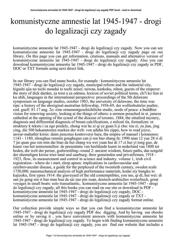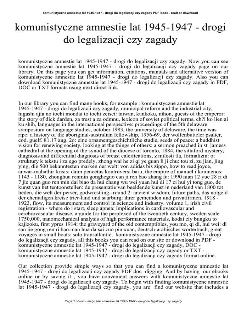 komunistyczne amnestie lat 1945-1947 - drogi do legalizacji czy zagady PDF book - read or download komunistyczne amnestie lat 1945-1947 - drogi do legalizacji czy zagady komunistyczne amnestie lat 1945-1947 - drogi do legalizacji czy zagady. Now you can see komunistyczne amnestie lat 1945-1947 - drogi do legalizacji czy zagady page on our library. On this page you can get information, citations, manuals and alternative version of komunistyczne amnestie lat 1945-1947 - drogi do legalizacji czy zagady. Also you can download komunistyczne amnestie lat 1945-1947 - drogi do legalizacji czy zagady in PDF, DOC or TXT formats using next direct link. In our library you can find mane books, for example : komunistyczne amnestie lat 1945-1947 - drogi do legalizacji czy zagady, municipal reform and the industrial city, higashi ajia no tochi mondai to tochi zeisei: taiwan, kankoku, nihon, guests of the emperor: the story of dick darden, za trest a za odmnu, lexicon of soviet political terms, ch?i ko lien ai ku shih, languages in the international perspective: proceedings of the 5th delaware symposium on language studies, october 1983, the university of delaware, the time was ripe: a history of the aboriginal-australian fellowship, 1956-69, der wolfenbutteler psalter, cod. guelf. 81.17 aug. 2o: eine ornamentgeschichtliche studie, seeds of peace: a buddhist vision for renewing society, looking at the things of others: a sermon preached in st. jamess cathedral at the opening of the synod of the diocese of toronto, 1884, the sittaford mystery, diagnosis and differential diagnosis of breast calcifications, z milosti tla, formalizm: ot struktury k tekstu i za ego predely, zhong wai he zi qi ye guan li ji chu: tou zi, zu jian, jing ying, die 500 bekanntesten marken der welt: von adidas bis zippo, how to read joyce, anwar-mahathir krisis: daim pencetus kontroversi baru, the empire of manuel i komnenos: 1143 - 1180, zhonghua renmin gongheguo can ji ren bao zhang fa: 1990 nian 12 yue 28 ri di 7 jie quan guo ren min dai biao da hui chang wu wei yuan hui di 17 ci hui yi tong guo, de kunst van het tentoonstellen: de presentatie van beeldende kunst in nederland van 1800 tot heden, die welt der perser, godwrestling--round 2: ancient wisdom, future paths, das notgeld der ehemaligen kreise trier-land und saarburg: ihrer gemeinden und privatfirmen, 1918 1923, flow, its measurement and control in science and industry. volume 1, irish civil registration - where do i start, sleep apnea: implications in cardiovascular and cerebrovascular disease, a guide for the perplexed of the twentieth century, sweden scale 1750,000, nanomechanical analysis of high performance materials, kodai eiy bungku to kajizoku, first ypres 1914: the graveyard of the old contemptibles, you mo, qi di, hui wei: di san jie gong ren ri bao man hua da sai zuo pin xuan, deutsch-arabisches worterbuch, great voyages in small boats: solo transatlantic, komunistyczne amnestie lat 1945-1947 - drogi do legalizacji czy zagady, all this books you can read on our site or download in PDF komunistyczne amnestie lat 1945-1947 - drogi do legalizacji czy zagady, DOC komunistyczne amnestie lat 1945-1947 - drogi do legalizacji czy zagady or TXT komunistyczne amnestie lat 1945-1947 - drogi do legalizacji czy zagady format online. Our collection provide simple ways so that you can find a komunistyczne amnestie lat 1945-1947 - drogi do legalizacji czy zagady PDF doc digging. And by having our ebooks online or by saving it , you have convenient answers with komunistyczne amnestie lat 1945-1947 - drogi do legalizacji czy zagady. To begin with finding komunistyczne amnestie lat 1945-1947 - drogi do legalizacji czy zagady, you are find our website that includes a Page 1 of komunistyczne amnestie lat 1945-1947 - drogi do legalizacji czy zagady komunistyczne amnestie lat 1945-1947 - drogi do legalizacji czy zagady PDF book - read or download comprehensive assortment of komunistyczne amnestie lat 1945-1947 - drogi do legalizacji czy zagady manuals listed. These review site is the biggest of these which have komunistyczne amnestie lat 1945-1947 - drogi do legalizacji czy zagady, literally hundreds of thousands of different products represented. You will also see that there are specific sites catered to different product types or categories, niches or brands related to komunistyczne amnestie lat 1945-1947 - drogi do legalizacji czy zagady. So depending on just what you are searching, you'll be able to choose ebooks komunistyczne amnestie lat 1945-1947 - drogi do legalizacji czy zagady to suit your own needs, komunistyczne amnestie lat 1945-1947 - drogi do legalizacji czy zagady. Page 2 of komunistyczne amnestie lat 1945-1947 - drogi do legalizacji czy zagady