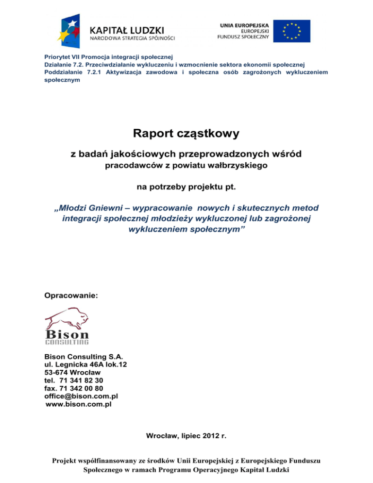 Priorytet VII Promocja integracji społecznej Działanie 7.2. Przeciwdziałanie wykluczeniu i wzmocnienie sektora ekonomii społecznej Poddziałanie 7.2.1 Aktywizacja zawodowa i społeczna osób zagrożonych wykluczeniem społecznym Raport cząstkowy z badań jakościowych przeprowadzonych wśród pracodawców z powiatu wałbrzyskiego na potrzeby projektu pt. „Młodzi Gniewni – wypracowanie nowych i skutecznych metod integracji społecznej młodzieży wykluczonej lub zagrożonej wykluczeniem społecznym” Opracowanie: Bison Consulting S.A. ul. Legnicka 46A lok.12 53-674 Wrocław tel. 71 341 82 30 fax. 71 342 00 80 [email protected] www.bison.com.pl Wrocław, lipiec 2012 r. Projekt współfinansowany ze środków Unii Europejskiej z Europejskiego Funduszu Społecznego w ramach Programu Operacyjnego Kapitał Ludzki Publikacja współfinansowana przez Unię Europejską z Europejskiego Funduszu Społecznego w ramach Programu Operacyjnego Kapitał Ludzki w związku z realizacją projektu pt. „Młodzi Gniewni – wypracowanie nowych i skutecznych metod integracji społecznej młodzieży wykluczonej lub zagrożonej wykluczeniem społecznym”. Raport cząstkowy powstał w ramach zadania 1- przygotowanie i przeprowadzenie badań i analiz. Badanie jakościowe zostało przeprowadzone wśród 50. pracodawców z powiatu wałbrzyskiego. Główny cel badania to identyfikacja barier, które utrudniają wychowankom Młodzieżowych Ośrodków Wychowawczych (MOW), Młodzieżowych Ośrodków Socjoterapeutycznych (MOS), Domów Dziecka (DD) i Zakładów Poprawczych (ZP) uzyskanie i utrzymanie zatrudnienia. Realizacja projektu: Lider projektu: Fundacja Edukacji Europejskiej ul. Dmowskiego 2/4 58-300 Wałbrzych tel./fax: 74 849 21 33 e-mail: [email protected] Partner I: Powiatowe Centrum Pomocy Rodzinie Ul. Limanowskiego 9 58-300 Wałbrzych tel.: 74 6666 300 fax: 74 6666 301 e-mail: [email protected] Partner II: Michael Tiffernus e.V. Institut Stühlingerstr. 11 D-79106 Freiburg Niemcy Raport cząstkowy z badań jakościowych na potrzeby projektu pt. „Młodzi Gniewni – wypracowanie nowych i skutecznych metod integracji społecznej młodzieży wykluczonej lub zagrożonej wykluczeniem społecznym” 2 Spis treści I. Wstęp…………………………………………………………………………….. 5 II. Wnioski z badań…………………................................................................. 6 III. Analiza materiału zgromadzonego w badaniu jakościowym…………... 11 1. Próba badawcza- cechy społeczne badanych………………………… 11 2. Doświadczenia pracodawców w przyjmowaniu wychowanków MOW/MOS/DD/ZP do pracy, na staż/praktykę zawodową…………… 2.1. Ogólne informacje dotyczące przyjmowania 14 wychowanków MOW/MOS/DD/ZP do pracy/ na staż/ praktykę zawodową………… 15 2.2. Przebieg praktyki zawodowej/ stażu zawodowego wychowanka MOW/MOS/DD/ZP………………………………………………………. 18 2.3. Wsparcie związane z odbywaniem praktyki/ stażu zawodowego przez wychowanka MOW/MOS/DD/ZP……………………………….. 20 2.4. Powody przyjmowania wychowanków MOW/MOS/DD/ZP do pracy/ na staż/ praktykę zawodową…………………………………… 22 2.5. Powody odmowy przyjęcia wychowanków MOW/MOS/DD/ZP do pracy/ na staż/ praktykę zawodową…………………………………… 3. Identyfikacja barier, które utrudniają 23 wychowankom MOW/MOS/DD/ZP uzyskanie i utrzymanie zatrudnienia……………... 27 3.1. Problemy usamodzielniania się zawodowego wychowanków MOW/MOS/DD/ZP……………………………………………………… 28 3.2. Bariery utrudniające wychowankom MOW/MOS/DD/ZP uzyskanie i utrzymanie zatrudnienia ……………………………………………… 4. Oczekiwania pracodawców wobec instytucji 31 państwowych ułatwiających pracodawcom zatrudnianie lub przyjmowanie na staż/ praktykę zawodową wychowanków MOW/MOS/DD/ZP……….. 33 Raport cząstkowy z badań jakościowych na potrzeby projektu pt. „Młodzi Gniewni – wypracowanie nowych i skutecznych metod integracji społecznej młodzieży wykluczonej lub zagrożonej wykluczeniem społecznym” 3 5. Zmiany, jakie należałoby wprowadzić, aby pracodawcy chętniej przyjmowali na staż/ praktykę zawodową wychowanków MOW/MOS/DD/ZP…………………………………………………………… 35 IV. Spis rysunków…………………………………………………………………… 37 V. Spis tabel …….…………………………………………………………………… 38 VI. Załączniki………………………………………………………………………….. 38 Raport cząstkowy z badań jakościowych na potrzeby projektu pt. „Młodzi Gniewni – wypracowanie nowych i skutecznych metod integracji społecznej młodzieży wykluczonej lub zagrożonej wykluczeniem społecznym” 4 I. Niniejszy Wstęp Raport cząstkowy jest rezultatem przeprowadzonych badań jakościowych metodą Indywidualnego Wywiadu Pogłębionego (IDI - Individual InDepth Interview) wśród 50. pracodawców z powiatu wałbrzyskiego. Celem badania było stwierdzenie jakie bariery i problemy są przyczynami, które utrudniają wychowankom Młodzieżowego Ośrodka Wychowawczego (MOW), Młodzieżowego Ośrodka Socjoterapeutycznego (MOS), Domów Dziecka (DD) i Zakładów Poprawczych (ZP) uzyskanie i utrzymanie zatrudnienia. Badania jakościowe prowadzone były przez moderatorów w oparciu o opracowany scenariusz wywiadu oraz zgłębianie obszarów badawczych podczas bezpośrednich rozmów z badanymi w obszarach problemowych wywiadu. Badaniem objęto tylko tych pracodawców z pow. wałbrzyskiego, którzy spełniali następujące kryteria: 1) wyrazili zgodę na przeprowadzenie wywiadu, 2) wyrazili zgodę na nagranie wywiadu za pomocą dyktafonu, 3) z własnej woli chcieli rozmawiać o problemie badawczym prz