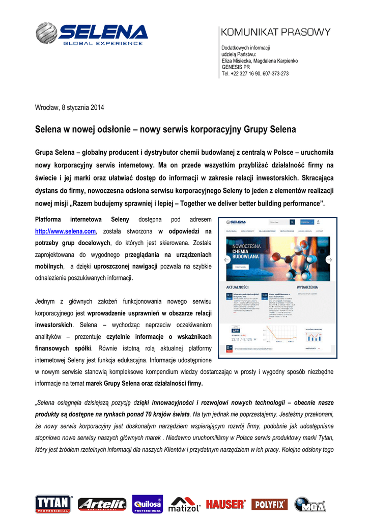 Dodatkowych informacji udzielą Państwu: Eliza Misiecka, Magdalena Karpienko GENESIS PR Tel. +22 327 16 90, 607-373-273 Wrocław, 8 stycznia 2014 Selena w nowej odsłonie – nowy serwis korporacyjny Grupy Selena Grupa Selena – globalny producent i dystrybutor chemii budowlanej z centralą w Polsce – uruchomiła nowy korporacyjny serwis internetowy. Ma on przede wszystkim przybliżać działalność firmy na świecie i jej marki oraz ułatwiać dostęp do informacji w zakresie relacji inwestorskich. Skracająca dystans do firmy, nowoczesna odsłona serwisu korporacyjnego Seleny to jeden z elementów realizacji nowej misji „Razem budujemy sprawniej i lepiej – Together we deliver better building performance”. Platforma internetowa Seleny dostępna pod adresem http://www.selena.com, została stworzona w odpowiedzi na potrzeby grup docelowych, do których jest skierowana. Została zaprojektowana do wygodnego przeglądania na urządzeniach mobilnych, a dzięki uproszczonej nawigacji pozwala na szybkie odnalezienie poszukiwanych informacji. Jednym z głównych założeń funkcjonowania nowego serwisu korporacyjnego jest wprowadzenie usprawnień w obszarze relacji inwestorskich. Selena – wychodząc naprzeciw oczekiwaniom analityków – prezentuje czytelnie informacje o wskaźnikach finansowych spółki. Równie istotną rolą aktualnej platformy internetowej Seleny jest funkcja edukacyjna. Informacje udostępnione w nowym serwisie stanowią kompleksowe kompendium wiedzy dostarczając w prosty i wygodny sposób niezbędne informacje na temat marek Grupy Selena oraz działalności firmy. „Selena osiągnęła dzisiejszą pozycję dzięki innowacyjności i rozwojowi nowych technologii – obecnie nasze produkty są dostępne na rynkach ponad 70 krajów świata. Na tym jednak nie poprzestajemy. Jesteśmy przekonani, że nowy serwis korporacyjny jest doskonałym narzędziem wspierającym rozwój firmy, podobnie jak udostępniane stopniowo nowe serwisy naszych głównych marek . Niedawno uruchomiliśmy w Polsce serwis produktowy marki Tytan, który jest źródłem rzetelnych informacji dla naszych Klientów i przydatnym narzędziem w ich pracy. Kolejne odsłony tego Dodatkowych informacji udzielą Państwu: Eliza Misiecka, Magdalena Karpienko GENESIS PR Tel. +22 327 16 90, 607-373-273 serwisu w innych krajach oraz stron naszych innych kluczowych marek będą dostępne już niedługo w Rosji, Rumunii, Brazylii, Kazachstanie czy USA” – mówi Jarosław Michniuk, prezes zarządu Selena FM SA, jednostki nadrzędnej w Grupie Selena. Ciągły rozwój Seleny potwierdzają wyniki finansowe spółki. Po trzech kwartałach 2013 roku Grupa Selena osiągnęła narastająco przychody ze sprzedaży w wysokości 832 mln zł, co oznacza wzrost o 26,8 mln zł w stosunku do analogicznego okresu 2012 roku. Selena w swojej działalności skupia się na ciągłym rozwoju w obszarze międzynarodowej aktywności spółki, m.in. przez wprowadzanie innowacyjnych produktów. Dlatego też – wychodząc na przeciw oczekiwaniom rynku – Selena wprowadziła na rynek amerykański nową linię uszczelniaczy i pian poliuretanowych TYTAN Professional. Ponadto międzynarodowa działalność Grupy została w ubiegłym roku doceniona przez Fundację Przedsiębiorczości, która to nagrodziła Selenę tytułem rosyjskiej Firmy Roku 2013. Informacje dodatkowe: Grupa Selena to globalny producent i dystrybutor chemii budowlanej. Selena oferuje szeroką gamę produktów przeznaczonych zarówno dla profesjonalnych wykonawców, jak i użytkowników indywidualnych – główne marki to TYTAN, ARTELIT oraz hiszpańska QUILOSA. Selena jest jednym z trzech największych światowych producentów piany poliuretanowej używanej do montażu okien i drzwi. Grupa w swojej ofercie posiada piany, uszczelniacze, kleje, produkty do hydroizolacji, systemy ociepleń, zamocowania oraz produkty komplementarne. W skład Grupy wchodzi 30 spółek w 18 krajach na całym świecie. Zakłady produkcyjne Seleny są zlokalizowane w Polsce, Brazylii, Korei, Chinach, Rumunii, Turcji oraz w Hiszpanii. Globalne doświadczenia zdobywane na wielu różnych rynkach pozwalają Grupie Selena szybko się rozwijać. Dzięki nim Selena staje się firmą innowacyjną i kreuje nowe rozwiązania dostosowane do potrzeb użytkowników. Grupa Selena była wielokrotnie nagradzana w najbardziej prestiżowych rankingach. Otrzymała m.in. tytuły: Diamentu Forbesa oraz Perły Polskiej Gospodarki. Najwyższa jakość produktów Grupy Selena oraz ich nowoczesność cieszą się uznaniem partnerów i klientów firmy, o czym mogą świadczyć liczne nagrody, jakimi spółka jest honorowana. Od kwietnia 2008 akcje spółki holdingowej Grupy – Selena FM SA – notowane są na Giełdzie Papierów Wartościowych w Warszawie. Więcej informacji o spółce na www.selena.com