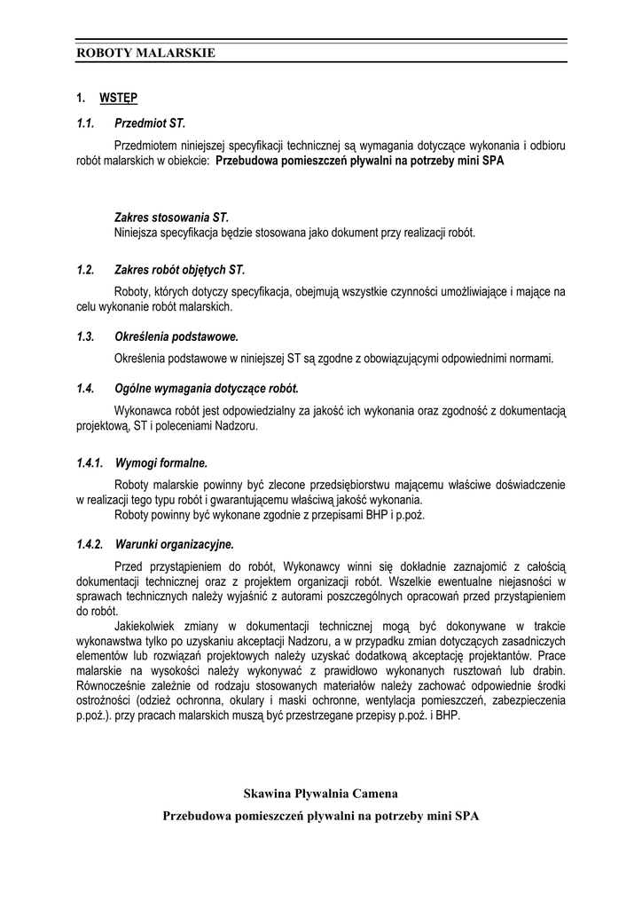 ROBOTY MALARSKIE 1. 1.1. WSTĘP Przedmiot ST. Przedmiotem niniejszej specyfikacji technicznej są wymagania dotyczące wykonania i odbioru robót malarskich w obiekcie: Przebudowa pomieszczeń pływalni na potrzeby mini SPA Zakres stosowania ST. Niniejsza specyfikacja będzie stosowana jako dokument przy realizacji robót. 1.2. Zakres robót objętych ST. Roboty, których dotyczy specyfikacja, obejmują wszystkie czynności umoŜliwiające i mające na celu wykonanie robót malarskich. 1.3. Określenia podstawowe. Określenia podstawowe w niniejszej ST są zgodne z obowiązującymi odpowiednimi normami. 1.4. Ogólne wymagania dotyczące robót. Wykonawca robót jest odpowiedzialny za jakość ich wykonania oraz zgodność z dokumentacją projektową, ST i poleceniami Nadzoru. 1.4.1. Wymogi formalne. Roboty malarskie powinny być zlecone przedsiębiorstwu mającemu właściwe doświadczenie w realizacji tego typu robót i gwarantującemu właściwą jakość wykonania. Roboty powinny być wykonane zgodnie z przepisami BHP i p.poŜ. 1.4.2. Warunki organizacyjne. Przed przystąpieniem do robót, Wykonawcy winni się dokładnie zaznajomić z całością dokumentacji technicznej oraz z projektem organizacji robót. Wszelkie ewentualne niejasności w sprawach technicznych naleŜy wyjaśnić z autorami poszczególnych opracowań przed przystąpieniem do robót. Jakiekolwiek zmiany w dokumentacji technicznej mogą być dokonywane w trakcie wykonawstwa tylko po uzyskaniu akceptacji Nadzoru, a w przypadku zmian dotyczących zasadniczych elementów lub rozwiązań projektowych naleŜy uzyskać dodatkową akceptację projektantów. Prace malarskie na wysokości naleŜy wykonywać z prawidłowo wykonanych rusztowań lub drabin. Równocześnie zaleŜnie od rodzaju stosowanych materiałów naleŜy zachować odpowiednie środki ostroŜności (odzieŜ ochronna, okulary i maski ochronne, wentylacja pomieszczeń, zabezpieczenia p.poŜ.). przy pracach malarskich muszą być przestrzegane przepisy p.poŜ. i BHP. Skawina Pływalnia Camena Przebudowa pomieszczeń pływalni na potrzeby mini SPA ROBOTY MALARSKIE 2. MATERIAŁY 2.1 Zastosowane materiały. Zastosowanym materiałem do malowania ścian wewnętrznych są farby akrylowe do malowań wewnętrznych, przeznaczone do stosowania na tynki cementowe, cementowo-wapienne, podłoŜa gipsowe, betonowe, itp. Farby powinny odpowiadać obowiązującej normie PN-93/C-89440 i posiadać ocenę higieniczną PZH. Farby akrylowe charakteryzują się dobrą przyczepnością do podłoŜa, odpornością na uszkodzenia mechaniczne, ścieranie i detergenty. Tworzą gładkie powłoki o jedwabistym wyglądzie, pozwalają na dyfuzję pary wodnej. Do malowania powieszonych sufitów naleŜy uŜyć farby zalecanej przez producenta sufitów, podnoszącej właściwości akustyczne sufitów. Zastosowanymi materiałami do malowania elementów metalowych są zestawy farb przeznaczonych do zabezpieczenia powierzchni stalowych i innych metalowych, na który składają się: farba gruntująca przeciwrdzewna i emalia nawierzchniowa ogólnego stosowania np.: - farba poliuretanowa do gruntowania i emalia poliuretanowa POLREN POLIFARB Dębica S.A. - podkład alkidowy UNIKOR C i emalia EMAFTALUX POLIFARB Cieszyn-Wrocław S.A. - farba poliwinylowa GRUNTOWIL i emalia EMAWIL POLIFARB Wrocław S.A. MoŜliwe jest równieŜ stosowanie pojedynczej powłoki, spełniającej rolę podkładu i warstwy nawierzchniowej jednocześnie np. lakier do metali GLASURIT ZINKHAFTFARBE. 3. SPRZĘT Roboty moŜna wykonać przy uŜyciu pędzli, wałków, pistoletów natryskowych lub innego sprzętu zaakceptowanego przez Nadzór.. 4. TRANSPORT I SKŁADOWANIE Farby akrylowe dostarczane są w szczelnie zamkniętych pojemnikach o poj. 3-10l lub innych uzgodnionych z odbiorcą. Powinny być przechowywane w suchym miejscu, w temperaturze 5-30oC. Farby i emalie do malowanie powierzchni metalowych pakowane są w puszki o poj. 1-20l. NaleŜy przechowywać je w suchych, wentylowanych pomieszczeniach, w szczelnie zamkniętych opakowaniach. Elementy konstrukcji przeznaczonych do malowania naleŜy składować w pomieszczeniach zamkniętych lub pod wiatami, zabezpieczając je przed wpływami atmosferycznymi. 5. WYKONANIE ROBÓT 5.1. Wykonawca przestawi Nadzorowi do akceptacji harmonogram robót uwzględniający wszystkie warunki, w jakich roboty będą wykonywane. 5.2. Opis ogólny. Malowanie farbami akrylowymi na podłoŜach z tynków cienkowarstwowych, tynków cementowo-wapiennych lub płyt gipsowo-kartonowych. Wewnątrz budynków pierwsze malowanie ścian i sufitów moŜna wykonywać po zakończeniu: Skawina Pływalnia Camena Przebudowa pomieszczeń pływalni na potrzeby mini SPA ROBOTY MALARSKIE • robót budowlanych i instalacyjnych (z wyjątkiem załoŜenia opraw, przykryw kontaktów, włączników elektrycznych, przyklejania okładzin, białego montaŜu • wykonania podkładów pod wykładziny podłogowe • montaŜu stolarki i ślusarki Drugie malowanie moŜna wykonać po zakończeniu: • białego montaŜu • ułoŜeniu posadzek (z wyjątkiem posadzek z tworzyw sztucznych) PodłoŜe przeznaczone pod pokrycie farbami powinno być odtłuszczone i odpylone. Ściany powinny być równe i bez spękań. Ewentualne uszkodzenia naleŜy wyrównać, zaszpachlować i zeszlifować jeśli wymagana jest duŜa gładkość powierzchni. Nowe tynki moŜna malować po 1-4 tyg., wilgotność tynków nie powinna przekraczać 4% (wg zaleceń producenta farby). Prace malarskie naleŜy prowadzić w temp. 5-30oC. Farbę moŜna nanosić wałkiem, pędzlem lub metodą natrysku. Przed malowaniem farby naleŜy dokładnie wymieszać. Do pierwszego malowania farbę naleŜy rozcieńczyć wodą w ilości 20-30%. Kolejne warstwy moŜna nakładać po wyschnięciu poprzednich tj. po 2-3 godz., uŜywając farby o lepkości handlowej. Do pełnego pokrycia podłoŜa wymagane jest 2 lub 3-krotne nałoŜenie farby. Do farb nie moŜna dodawać farb klejowych, wapna