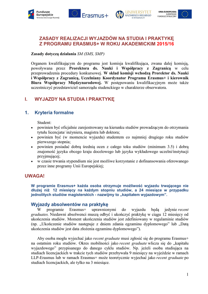 ZASADY REALIZACJI WYJAZDÓW NA STUDIA I PRAKTYKĘ Z PROGRAMU ERASMUS+ W ROKU AKADEMICKIM 2015/16 Zasady dotyczą działania SM (SMS, SMP) Organem kwalifikującym do programu jest komisja kwalifikująca, zwana dalej komisją, powoływana przez Prorektora ds. Nauki i Współpracy z Zagranicą w celu przeprowadzenia procedury konkursowej. W skład komisji wchodzą Prorektor ds. Nauki i Współpracy z Zagranicą, Uczelniany Koordynator Programu Erasmus+ i kierownik Biura Współpracy Międzynarodowej. W postępowaniu kwalifikacyjnym może także uczestniczyć przedstawiciel samorządu studenckiego w charakterze obserwatora. I. WYJAZDY NA STUDIA I PRAKTYKĘ 1. Kryteria formalne Student: powinien być oficjalnie zarejestrowany na kierunku studiów prowadzącym do otrzymania tytułu licencjata/ inżyniera, magistra lub doktora; powinien być (w momencie wyjazdu) studentem co najmniej drugiego roku studiów pierwszego stopnia; powinien posiadać dobrą średnią ocen z całego toku studiów (minimum 3.5) i dobrą znajomość języka obcego kraju docelowego lub języka wykładowego uczelni/instytucji przyjmującej; w czasie trwania stypendium nie jest możliwe korzystanie z dofinansowania oferowanego przez inne programy Unii Europejskiej; UWAGA! W programie Erasmus+ każda osoba otrzymuje możliwość wyjazdu trwającego nie dłużej niż 12 miesięcy na każdym stopniu studiów, a 24 miesiące w przypadku jednolitych studiów magisterskich - nazwijmy to „kapitałem wyjazdowym”. Wyjazdy absolwentów na praktykę W programie Erasmus+ uprawnionymi do wyjazdu będą jedynie recent graduates. Niedawni absolwenci muszą odbyć i ukończyć praktykę w ciągu 12 miesięcy od ukończenia studiów. Moment ukończenia studiów jest zdefiniowany w regulaminie studiów (np. „Ukończenie studiów następuje z dniem zdania egzaminu dyplomowego” lub „Datą ukończenia studiów jest data złożenia egzaminu dyplomowego”). Aby osoba mogła wyjechać jako recent graduate musi zgłosić się do programu Erasmus+ na ostatnim roku studiów. Okres mobilności jako recent graduate wlicza się do „kapitału wyjazdowego” przypisanego do danego cyklu studiów. Np. jeżeli osoba studiująca na studiach licencjackich w trakcie tych studiów przebywała 9 miesięcy na wyjeździe w ramach LLP-Erasmus lub w ramach Erasmus+ może teoretycznie wyjechać jako recent graduate po studiach licencjackich, ale tylko na 3 miesiące. 1 II. WYJAZDY NA STUDIA 1. Kryteria uczelniane Podstawowe kryteria selekcji kandydatów: - średnia ocen z toku studiów (37,5%), - znajomość wykładowego języka obcego (37,5%). Kryteria pomocnicze przy ocenie studenta: - znajomość innego języka obcego (6,25%), - udział w projektach międzynarodowych, w tym pomoc przy organizacji pobytu zagranicznych studentów programu Erasmus+ (6,25%), - działalność na rzecz uczelni (6,25%), - inne osiągnięcia (6,25%). 2. Formularz oceny Średnia ocen Punktacja 0 1 2 4 6 poniżej 2,99 od 3 do 3,49 od 3,5do 3,99 od 4,0 od 4,5 Znajomość wykładowego języka obcego (o kwalifikacji do danego poziomu skali decyduje test językowy, nie dotyczy studentów kierunków językowych oraz studentów posiadających certyfikaty językowe) 0 1 3 6 brak znajomości podstawowa średniozaawansowana zaawansowana Znajomość innego języka obcego 0 brak znajomości 1 co najmniej podstawowa znajomość języka obcego Udział w programach/projektach międzynarodowych 0 brak uczestnictwa 1 uczestnictwo Działalność na rzecz uczelni brak działalności 0 1 działalność Inne osiągnięcia 0 brak osiągnięć 1 osiągnięcia 2 Parametr Średnia ocen Opis Wartości przyjmowane przez parametr średnia arytmetyczna ocen z toku studiów potwierdzona zaświadczeniem z dziekanatu 0-6 Znajomość wykładowego języka obcego Znajomość innego języka obcego Udział w programach/ projektach międzynarodowych znajomość języka, w którym prowadzona jest większość zajęć w uczelni przyjmującej (w przypadku równej liczby zajęć w danych językach, decyduje znajomość języka wykładowego będącego jednocześnie językiem urzędowym danego kraju), potwierdzona poprzez stosowne certyfikaty lub test językowy 0-6 znajomość języka obcego, innego niż język wiodący wykładowy uczelni przyjmującej potwierdzona przez stosowne certyfikaty 0-1 uczestnictwo w przedsięwzięciach o charakterze naukowym, edukacyjnym lub artystycznym w środowisku międzynarodowym (w tym pomoc przy organizacji pobytu zagranicznych studentów programu Erasmus+) 0-1 inicjowanie lub uczestnictwo w działaniach prowadzących do Działalność na rzecz rozwoju lub promocji Uniwersytetu Kazimierza Wielkiego uczelni (w tym pomoc przy organizacji pobytu zagranicznych studentów programu Erasmus+) 0-1 Inne osiągnięcia osiągnięcia w dziedzinie nauki, kultury, sportu lub działalności społecznej (z wyłączeniem powyższych parametrów) MAKSYMALNA ŁĄCZNA PUNKTACJA 1. 0-1 16 (studia) Wymagane dokumenty Student zainteresowany otrzymaniem stypendium składa do Biura Współpracy Międzynarodowej następujące dokumenty: formularz zgłoszeniowy dostępny na stronie erasmus.ukw.edu.pl podpisany przez właściwego Koordynatora Instytutowego, zaświadczenie z dziekanatu o średniej ocen z całego toku studiów, zaświadczenie o uprawnieniach do otrzymywania stypendium socjalnego w semestrze, w którym trwa rekrutacja (jeśli dotyczy), dokument potwierdzający znajomość języka obcego (np.: certyfikat, zaświadczenie ze szkoły językowej, itp.), opcjonalnie - informacje dodatkowe (np.: opinia opiekuna roku, zaświadczenia z odbytych praktyk zawodowych, wolontariatu lub udziału w konferencjach, inne dokumenty świadczące na korzyść studenta). 3 2. Terminy Dokumenty na wyjazdy na studia w roku akademickim 2015/16 przyjmowane są do 31 marca 2015 r. Rekrutacja na wyjazdy w kolejnym roku akademickim jest ogłaszana po złożeniu do Narodowej Agencji wniosku na realizację programu w kolejnym rok