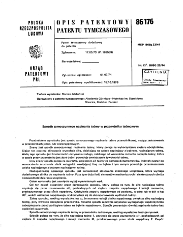 POLSKA RZECZPOSPOLITA LUDOWA OPIS PATENTOWY 86176 PATENTU TYMCZASOWEGO Patent tymczasowy dodatkowy do patentu Zgłoszono: MKP B65g 23/44 17.05.73 (P. 162599) Pierwszeństwo: Int. Cl2. B65G 23/44 URZĄD PATENTOWY PRL Zgłoszenie ogłoszono: 01.07.74 Opis patentowy opublikowano: 15J0.1976 czytelniaT Urzęck, PaienW^o Twórca wynalazku: Roman Jabłoński Uprawniony z patentu tymczasowego: Akademia Górniczo-Hutnicza im. Stanisława Staszica, Kraków (Polska) Sposób samoczynnego napinania taśmy w przenośniku taśmowym Przedmiotem wynalazku jest sposób samoczynnego napinania taśmy przenośnikowej, mający zastosowanie w przenośnikach jedno- lub wielonapędowych. Znany jest sposób samoczynnego napinania taśmy, który polega na wykorzystaniu ciężaru obciążników. Ciężar ten poprzez zlinowanie wywołuje siłę, działającą na wózek napinający z bębnem, napinającym taśmę. Wadą tego sposobu, jest konieczność utrzymania stałego, zależnego od warunków rozruchu napięcia taśmy, które w czasie pracy przenośnika jest zbyt duże i powoduje zmniejszenie żywotności taśmy. Inny znany sposób polega na mierzeniu pośrednim sił taśmy za pomocą dynamometrów, których sygnał po wzmocnieniu Uruchamia silnik wciągarki, nawijającej linę na bęben i tym samym powoduje przemieszczenie wózka napinającego z bębnem napinającym taśmę. Niedogodnością opisanego sposobu jest konieczność stosowania złożonego urządzenia, które wymaga dodatkowego silnika do napinania taśmy. Poza tym duża ilość elementów mechanicznych i elektrycznych obniża niezawodność działania urządzenia. Celem wynalazku jest usunięcie wyżej wymienionych wad. Cel ten został osiągnięty przez opracowanie sposobu, który polega na tym, że siłę napinającą taśmę uzyskuje się przez zsumowanie sił, pochodzących od ciężaru zespołu napędowego i reakcji momentu, przekazywanego przez silnik napędowy. Odchylenia zespołu napędowego od poziomu, w górę lub w dół o kąt 30°, wokół osi bębna napędowego, wykorzystuje się do skompensowania wydłużeń taśmy. Zaletą sposobu, według wynalazku jest to, że moment reakcji silnika napędowego zwiększa siłę napinającą taśmę, przy wzroście obciążenia przenośnika. Ponadto sposób zapewnia uzyskanie wymaganego współczynnika zabezpieczenia przed poślizgiem taśmy na bębnie napędowym. Sposób gwarantuje również napinanie taśmy bez opóźnień czasowych. Sposób samoczynnego napinania taśmy w przenośniku taśmowym, według wynalazku ilustruje rysunek. Sposób polega na tym, że siłę napinającą taśmę 1, uzyskuje się przez zsumowanie sił, pochodzących od ciężaru G zespołu napędowego i reakcji momentu M, przekazywanego przez silnik napędowy 2. Zespół 2 86176 napędowy, składający się z silnika napędowego 2, sprzęgła 3 i reduktora 4, odchyla się od poziomu w górę lub w dół o kąt 0 = 30° wokół osi bębna napędowego 5, w celu skompensowania wydłużeń taśmy 1. Z odchyleniem zespołu napędowego jest związane przemieszczenie bębna napinającego 6 i na odwrót każde przemieszczenie bębna 6 spowoduje odchylenie od położenia poziomego zespołu napędowego. Zastrzeżenia patentowe 1. Sposób samoczynnego napinania taśmy w przenośniku taśmowym, znamienny tym, że siłę napinającą taśmę uzyskuje się przez zsumowanie sił, pochodzących od ciężaru zespołu napędowego i reakcji momentu, przekazywanego przez silnik napędowy. 2. Sposób według zastrz. 1,znamienny tym, że zespół napędowy odchyla się od poziomu w górę lub w dół o kąt 30°, wokół osi bębna napędowego, w celu skompensowania wydłużeń taśmy. Prac. Poligraf. UP PRL Nakład 120 + 18 egz. Cena 10 zł