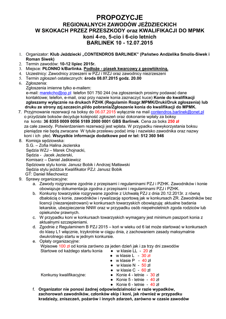 PROPOZYCJE REGIONALNYCH ZAWODÓW JEŹDZIECKICH W SKOKACH PRZEZ PRZESZKODY oraz KWALIFIKACJI DO MPMK koni 4-ro, 5-cio i 6-cio letnich BARLINEK 10 - 12.07.2015 1. Organizator: Klub Jeździecki „CONTENDROS BARLINEK” (Państwo Andżelika Smolis-Siwek i Roman Siwek) 2. Termin zawodów: 10-12 lipiec 2015r. 3. Miejsce: PŁONNO k/Barlinka. Podłoże - piasek kwarcowy z geowłókniną. 4. Uczestnicy: Zawodnicy zrzeszeni w PZJ i WZJ oraz zawodnicy niezrzeszeni 5. Termin zgłoszeń ostatecznych: środa 08.07.2015 godz. 20.00 6. Zgłoszenia: Zgłoszenia imienne tylko e-mailem: e-mail: [email protected] telefon 501 750 244 (na zgłoszeniach prosimy podawać dane kontaktowe; telefon, e-mail, oraz przy nazwie konia zaznaczyć kuce) Konie do kwalifikacji zgłaszamy wyłącznie na drukach PZHK (Regulamin Rozgr.MPMK/Druki/Druk zgłoszenia) lub druku ze strony zzj.szczecin.pl/do pobrania/Zgłoszenie konia do kwalifikacji do MPMK. 7. Przyjmowanie rezerwacji na boksy do 06.07.2015 wyłącznie na mail [email protected] o przydziale boksów decyduje kolejność zgłoszeń oraz dokonanie wpłaty za boksy na konto: 36 8355 0009 0056 5189 2000 0001 GBS Barlinek. Cena za boks 250 zł za całe zawody. Potwierdzeniem rezerwacji jest wpłata. W przypadku niewykorzystania boksu pieniądze nie będą zwracane W tytule przelewu podać imię i nazwisko zawodnika oraz nazwy koni i ich płeć. Wszystkie informacje dodatkowe pod nr tel: 512 360 946 8. Komisja sędziowska: S.G. – Zofia Halina Jezierska Sędzia WZJ – Marek Chojnacki, Sędzia - Jacek Jezierski, Komisarz – Daniel Jaśkiewicz Sędziowie stylu konia: Janusz Bobik i Andrzej Matławski Sędzia stylu jeźdźca Kwalifikator PZJ: Janusz Bobik GT: Daniel Miechowicz 9. Sprawy organizacyjne: a. Zawody rozgrywane zgodnie z przepisami i regulaminami PZJ i PZHK. Zawodników i konie obowiązuje dokumentacja zgodna z przepisami i regulaminami PZJ i PZHK. b. Konkursy towarzyskie rozgrywane zgodnie z Uchwałą PZJ z dnia 20.12.2013r. z równą dbałością o konie, zawodników i rywalizację sportową jak w konkursach ZR. Zawodników bez licencji (niezarejestrowani) w konkursach towarzyskich obowiązują: aktualne badania lekarskie, ubezpieczenie NNW oraz w przypadku osób niepełnoletnich zgoda rodziców lub opiekunów prawnych. c. W przypadku koni w konkursach towarzyskich wymagany jest minimum paszport konia z aktualnymi szczepieniami. d. Zgodnie z Regulaminem B PZJ 2015 – koń w wieku od 6 lat może startować w konkursach do klasy L1 włącznie, trzykrotnie w ciągu dnia, z zachowaniem zasady maksymalnie dwukrotnego startu w jednym konkursie. e. Opłaty organizacyjne: Wpisowe 100 zł od konia zarówno za jeden dzień jak i za trzy dni zawodów Startowe od każdego startu konia ● w klasie LL - 20 zł ● w klasie L - 30 zł ● w klasie P - 40 zł ● w klasie N - 50 zł ● w klasie C - 60 zł Konkursy kwalifikacyjne: ● Konie 4 - letnie - 30 zł ● Konie 5 - letnie - 40 zł ● Konie 6 - letnie - 40 zł f. Organizator nie ponosi żadnej odpowiedzialności w razie wypadków, zachorowań zawodników, członków ekip i koni, jak również w przypadku kradzieży, zniszczeń, pożarów i innych zdarzeń, zarówno w czasie zawodów jak i w trakcie transportu na i z zawodów. g. Każda zmiana na listach startowych po wydrukowaniu 30 zł h. Podłączenie przyczepy do prądu – 150zł za zawody. Na zgłoszeniu proszę zaznaczyć, że będą Państwo korzystać z przyłącza prądu. i. Zakwaterowanie zawodników we własnym zakresie: Hotel Barlinek - ul. Jeziorna14, tel.665 144 700 Hotel Alma - ul. Strzelecka 6, tel.(95)746 35 53 Pensjonat Pod Łabędziem - ul. Jeziorna 13, tel.607 200 465 Hotelik Limba - ul. Gorzowska 53, tel. 601-829-762 (95)746-44-98 Pensjonat Pod Sosnami - ul.Sportowa 2, tel.508-857-768 Ośrodek Wypoczynkowy Janowo - ul.Polna Lecha 1, tel.(95)746-24-13 Barlinecki Ośrodek Kultury - ul.Podwale 9, tel.(95)746-21-35 P.Sędłak Domki ul.Sportowa tel.795558653 10 Odprawa techniczna: Piątek 10.07.2015 godz. 08.00 Program zawodów: Piątek 10.07.2015. godz. 09:00 Konkurs nr 1 KL LL z trafieniem w normę czasu (Art. dod. S1 Reg. RZK w skokach, konkurs towarzyski) Konkurs nr 2 KL L z trafieniem w normę czasu (Art. dod. S1 Reg. RZK w skokach, konkurs towarzyski) Konkurs nr 3 KL L egzaminacyjny z oceną stylu jeźdźca (Art.6 REG. RZK w skokach) Konkurs nr 4 KL L z oceną stylu konia dla koni 4-letnich (kwalifikacje do MPMK, zgodnie z Reg. MPMK 2015) Konkurs nr 5 KL P dwufazowy (Art. 274.5.2) Konkurs nr 6 KL P1 z oceną stylu konia dla koni 5-letnich (kwalifikacje do MPMK, Art.11.1.1.1 Reg. RZK w skokach) Konkurs nr 7 KL N zwykły (Art. 238.2.1) Konkurs nr 8 KL N1 z oceną stylu konia dla koni 6-letnich (kwalifikacje do MPMK Art.11.1.2.1 Reg. RZK w skokach) Konkurs nr 9 KL C dwufazowy (Art. 274.5.3) Sobota 11.07.2015. godz. 09:00 Konkurs nr 10 KL LL z trafieniem w normę czasu (Art. dod. S1 Reg. RZK w skokach, konkurs towarzyski) Konkurs nr 11 KL L z trafieniem w normę czasu (Art. dod. S1 Reg. RZK w skokach, konkurs towarzyski) Konkurs nr 12 KL L egzaminacyjny z oceną stylu jeźdźca (Art.6 Reg. RZK w skokach) Konkurs nr 13 KL L z oceną stylu konia dla koni 4-letnich (kwalifikacje do MPMK, zgodnie z Reg. MPMK 2015) Konkurs nr 14 KL P zwykły (Art. 238.2.1) Konkurs nr 15 KL P1 z oceną stylu konia dla koni 5-letnich (kwalifikacje do MPMK, Art.11.1.1.1 Reg. RZK w skokach) Konkurs nr 16 KL N dwufazowy (Art. 274.5.2) Konkurs nr 17 KL N1 z oceną stylu konia dla koni 6-letnich (kwalifikacje do MPMK, Art.11.1.2.1 Reg. RZK w skokach) Konkurs nr 18 KL C zwykły (Art. 238.2.1) Niedziela 12.07.2015. godz. 09,00 Konkurs nr 19 KL LL z trafieniem w normę czasu (Art. dod. S1 Reg. RZK w skokach, konkurs towarzyski) Konkurs nr 20 KL L zwykły (Art. 238.2.1, towarzyski) Konkurs nr 21 KL L egzaminacyjny z oceną stylu jeźdźca (Art.6 Reg. RZK w skokach) Konkurs nr 22 KL P zwykły o wzrastającym stopniu trudności z jokerem (Art. 269.5) Konkurs nr 23 KL N z oceną s