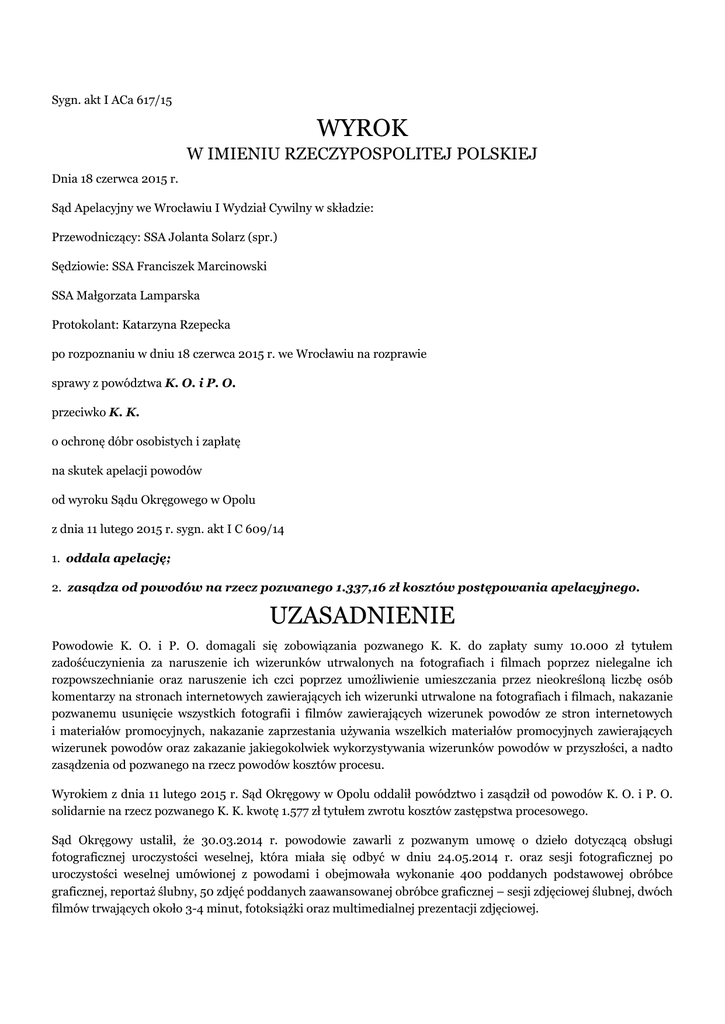 Sygn. akt I ACa 617/15 WYROK W IMIENIU RZECZYPOSPOLITEJ POLSKIEJ Dnia 18 czerwca 2015 r. Sąd Apelacyjny we Wrocławiu I Wydział Cywilny w składzie: Przewodniczący: SSA Jolanta Solarz (spr.) Sędziowie: SSA Franciszek Marcinowski SSA Małgorzata Lamparska Protokolant: Katarzyna Rzepecka po rozpoznaniu w dniu 18 czerwca 2015 r. we Wrocławiu na rozprawie sprawy z powództwa K. O. i P. O. przeciwko K. K. o ochronę dóbr osobistych i zapłatę na skutek apelacji powodów od wyroku Sądu Okręgowego w Opolu z dnia 11 lutego 2015 r. sygn. akt I C 609/14 1. oddala apelację; 2. zasądza od powodów na rzecz pozwanego 1.337,16 zł kosztów postępowania apelacyjnego. UZASADNIENIE Powodowie K. O. i P. O. domagali się zobowiązania pozwanego K. K. do zapłaty sumy 10.000 zł tytułem zadośćuczynienia za naruszenie ich wizerunków utrwalonych na fotografiach i filmach poprzez nielegalne ich rozpowszechnianie oraz naruszenie ich czci poprzez umożliwienie umieszczania przez nieokreśloną liczbę osób komentarzy na stronach internetowych zawierających ich wizerunki utrwalone na fotografiach i filmach, nakazanie pozwanemu usunięcie wszystkich fotografii i filmów zawierających wizerunek powodów ze stron internetowych i materiałów promocyjnych, nakazanie zaprzestania używania wszelkich materiałów promocyjnych zawierających wizerunek powodów oraz zakazanie jakiegokolwiek wykorzystywania wizerunków powodów w przyszłości, a nadto zasądzenia od pozwanego na rzecz powodów kosztów procesu. Wyrokiem z dnia 11 lutego 2015 r. Sąd Okręgowy w Opolu oddalił powództwo i zasądził od powodów K. O. i P. O. solidarnie na rzecz pozwanego K. K. kwotę 1.577 zł tytułem zwrotu kosztów zastępstwa procesowego. Sąd Okręgowy ustalił, że 30.03.2014 r. powodowie zawarli z pozwanym umowę o dzieło dotyczącą obsługi fotograficznej uroczystości weselnej, która miała się odbyć w dniu 24.05.2014 r. oraz sesji fotograficznej po uroczystości weselnej umówionej z powodami i obejmowała wykonanie 400 poddanych podstawowej obróbce graficznej, reportaż ślubny, 50 zdjęć poddanych zaawansowanej obróbce graficznej – sesji zdjęciowej ślubnej, dwóch filmów trwających około 3-4 minut, fotoksiążki oraz multimedialnej prezentacji zdjęciowej. Pozwany był w trakcie pozyskiwania materiału dla celów reklamowych i posiadał dwa warianty projektu zawieranej umowy: jeden obejmujący wykonanie dzieła za kwotę 1.990 zł oraz drugi, który przewidywał możliwość wykorzystania wizerunku zamawiających zawartych w materiałach stanowiących przedmiot dzieła na stronach internetowych i w folderach reklamowych, a wówczas cena działa była obniżana o 1.000 zł. Umowa była pomiędzy stronami negocjowana przed jej podpisaniem. Powodowie nalegali na obniżenie wynagrodzenia w kwocie 1.990 zł i pozwany zaproponował powodom drugi wariant umowy, który zawierał w § 7 zgodę zamawiających na późniejsze wykorzystanie dzieła w materiałach promujących działalność wykonawcy (np. na autorskiej stronie internetowej lub serwisie facebook). Paragraf ten wskazywał, że powodowie z tego tytułu w przyszłości nie będą przedstawiali żadnych roszczeń finansowych i precyzował, iż pozwany zamieści na swojej stronie internetowej około 30 zdjęć z fotoreportażu, 20 zdjęć z sesji fotograficznej oraz filmy ze ślubu oraz z sesji. Nadto zawarto zapis, że „Zleceniodawcy mają prawo wybrać zdjęcia spośród pakietu zaproponowanego przez Zleceniodawcę”, a strony postanowiły, iż powyższy zapis nie będzie obejmował filmów, gdyż stanowią one integralną całość, którą nie może zostać podzielona na części i nie może też podlegać częściowej autoryzacji. Pozwany wysłał powodom materiał, stanowiący część dzieła celem jego autoryzacji, na co powodowie odpowiedzieli e-maliowo: „Wszystkie są ok :) Z naszej strony zielone światło do umieszczenia na stronę.” Pozwany wykorzystał część dzieła, tj. autoryzowane zdjęcia i film z wesela powodów poprzez umieszczenie ich na stronie internetowej, serwisie facebook oraz na ulotkach reklamowych pozwanego. 4.08.2014 r. powód e-mailowo napisał do pozwanego, że żąda aby wszelkie fotografie i filmy zawierające wizerunek jego i K. O. zostały usunięte ze strony internetowej, na jakich zamieścił je pozwany, wyznaczając termin do dnia 5.08.2014r. Pozwany dnia 19.11.2014 r. usunął wizerunek powodów ze swojej autorskiej strony internetowej, serwisu facebook oraz zaprzestał wykorzystywania ulotek i materiałów reklamowych z wizerunkiem powodów. Przy tak ustalonym stanie faktycznym, w ocenie Sądu Okręgowego, brak jest podstaw do twierdzenia, iż doszło do bezprawnego wykorzystania dzieła, nie doszło do naruszenia praw powodów do wykorzystania wizerunku, co uzasadniałoby przyznanie stosownego zadośćuczynienia, zgodnie z art. 78 prawa autorskiego i art. 24 k.c., bowiem pozwany uzyskał wymaganą zgodę na wykorzystanie wizerunków powodów, na podstawie § 7 umowy zawartej między stronami i posiadał prawo umieszczenia autoryzowanych przez powodów zdjęć w materiałach promujących swoją działalność. Strony postanowiły zgodnie, iż powyższy zapis nie będzie obejmował filmów, gdyż stanowią one integralną całość, która nie może zostać podzielona na części i nie może też podlegać częściowej autoryzacji. Pozwany wysłał powodom materiał, stanowiący część dzieła celem jego autoryzacji, a powodowie odpowiedzieli: „Wszystkie są ok :) Z naszej strony zielone światło do umieszczenia na stronę", przy czym wiadomość e-mail podpisana jest (...), przez co przyjąć należało, iż autoryzacji dokonali obydwoje powodowie. W tych okolicznościach Sąd Okręgowy uznał, że powodowie udzielili wyraźnej zgody na wykorzystanie ich wizerunku w materiałach promujących działalność pozwanego, znajdujących się w wykonanym dziele m. in. na stronie internetowej poz