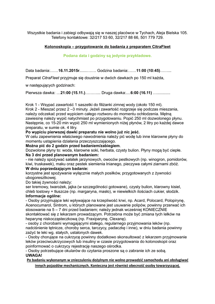 Wszystkie badania i zabiegi odbywają się w naszej placówce w Tychach, Aleja Bielska 105. Telefony kontaktowe: 32/217 53 60, 32/217 88 66, 501 779 729. Kolonoskopia – przygotowanie do badania z preparatem CitraFleet Podana data i godziny są jedynie przykładowe. Data badania:……16.11.2015r.......……. Godzina badania:……11:00 (10:45)……... Preparat CitraFleet przyjmuje się doustnie w dwóch dawkach po 150 ml każda, w następujących godzinach: Pierwsza dawka: …21:00 (15.11.)………... Druga dawka:....6:00 (16.11) …............ Krok 1 - Wsypać zawartość 1 saszetki do filiżanki zimnej wody (około 150 ml). Krok 2 - Mieszać przez 2 –3 minuty. Jeżeli zawartość rozgrzeje się podczas mieszania, należy odczekać przed wypiciem całego roztworu do momentu ochłodzenia. Mętną zawiesinę należy wypić natychmiast po przygotowaniu. Popić 250 ml dozwolonego płynu. Następnie, co 15-20 min wypić 250 ml wymienionych niżej płynów, 2 litry po każdej dawce preparatu, w sumie ok. 4 litry. Po wypiciu pierwszej dawki preparatu nie wolno już nic jeść. W celu zapewnienia właściwego nawodnienia należy pić wodę lub inne klarowne płyny do momentu ustąpienia działania przeczyszczającego. Można pić do 2 godzin przed badaniem/zabiegiem. Dozwolone płyny to: woda, klarowne soki, herbata, czysty bulion. Płyny mogą być ciepłe. Na 3 dni przed planowanym badaniem: - nie należy spożywać sałatek jarzynowych, owoców pestkowych (np. winogron, pomidorów, kiwi, truskawek), maku oraz pestek siemienia lnianego, pieczywa całymi ziarnami zbóż. W dniu poprzedzającym badanie: korzystne jest spożywanie wyłącznie małych posiłków, przygotowanych z żywności ubogoresztkowej. Do takiej żywności należy: ser kremowy, twarożek, jajka (w szczególności gotowane), czysty bulion, klarowny kisiel, chleb tostowy + tłuszcze (np. margaryna, masło), w niewielkich ilościach cukier, słodzik. Informacje ogólne: - Osoby przyjmujące leki wpływające na krzepliwość krwi, np. Acard, Polocard, Polopirynę, Acenocumarol, Sintrom, u których planowane jest usuwanie polipów, powinny przerwać ich stosowanie na 5 – 7 dni przed badaniem; należy jednak wcześniej KONIECZNIE skontaktować się z lekarzem prowadzącym. Potrzebna może być zmiana tych lelków na heparynę niskocząsteczkową (np. Fraxiparynę, Clexanę). - osoby z chorobami wymagającymi stałego, regularnego przyjmowania leków (np. nadciśnienie tętnicze, choroby serca, tarczycy, padaczkę i inne), w dniu badania powinny zażyć te leki wg. stałych, ustalonych dawek. - Osoby chorujące na cukrzycę powinny dodatkowo skonsultować z lekarzem przyjmowanie leków przeciwcukrzycowych lub insuliny w czasie przygotowania do kolonoskopii oraz poinformować o cukrzycy rejestrację naszego ośrodka. - Osoby potrzebujące okularów do czytania proszone są o zabranie ich ze sobą. UWAGA! Po badaniu wykonanym w znieczuleniu dożylnym nie wolno prowadzić samochodu ani obsługiwać innych pojazdów mechanicznych. Konieczna jest również obecność osoby towarzyszącej.