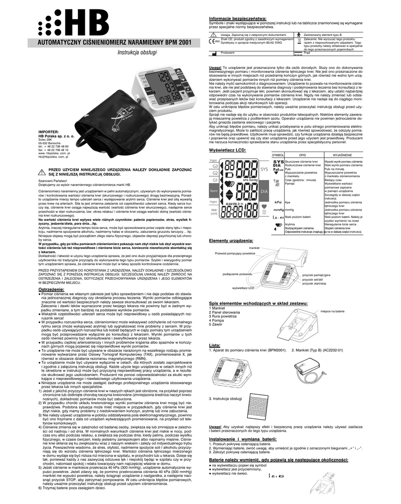 Informacje bezpieczeństwa: Symbole i znaki występujące w poniższej instrukcji lub na tabliczce znamionowej są wymagane przez specjalne normy bezpieczeństwa. ! AUTOMATYCZNY CIŚNIENIOMIERZ NARAMIENNY BPM 2001 Instrukcja obsługi IMPORTER: HB Polska sp. z o. o. Solec 29K 05-532 Baniocha tel.: + 48 22 736 48 00 fax: + 48 22 736 48 10 www. hbpolska. com. pl hb@hbpolska. com. pl ! Uwaga. Zapoznaj się z załączonymi dokumentami Zastosowany element typu B Znak CE: produkt zgodny z zasadniczym wymaganiami Dyrektywy o sprzęcie medycznym 93/42/ EWG Zalecenie: Nie wyrzucać tego produktu razem z nieposortowanymi odpadami. Tego typu produkty należy składować w specjalnie do tego przeznaczonych pojemnikach Prąd Producent Uwaga! To urządzenie jest przeznaczone tylko dla osób dorosłych. Służy ono do dokonywania bezinwazyjnego pomiaru i monitorowania ciśnienia tętniczego krwi. Nie jest ono przeznaczone do stosowania w innych miejscach niż przedramię kończyn górnych, jak również nie wolno tym urządzeniem wykonywać pomiarów innych niż pomiary ciśnienia krwi. Nie należy mylić samokontroli z diagnozowaniem. Urządzenie to pozwala na monitorowanie ciśnienia krwi, ale nie jest podstawą do stawiania diagnozy i podejmowania leczenia bez konsultacji z lekarzem. Jeśli pacjent przyjmuje leki, powinien skonsultować się z lekarzem, aby ustalić najbardziej odpowiedni czas na wykonywanie pomiarów ciśnienia krwi. Nigdy nie należy zmieniać lub odstawiać przepisanych leków bez konsultacji z lekarzem. Urządzenie nie nadaje się do ciągłego monitorowania podczas akcji ratunkowych lub operacji. W celu uniknięcia błędów pomiarowych, należy uważnie przeczytać instrukcję obsługi przed użyciem produktu. Sprzęt nie nadaje się do użytku w obecności produktów łatwopalnych. Niektóre elementy zawierają mieszaninę powietrza z podtlenkiem azotu. Operator urządzenia nie powinien jednocześnie dotykać gniazda zasilania sieciowego i pacjenta. Aby uniknąć błędów pomiaru, należy unikać przebywania w polu silnego promieniowania elektromagnetycznego. Może to zakłócić pracę urządzenia, jak również spowodować, że odczyty pomiarów nie będą prawidłowe. Użytkownik musi sprawdzić, czy funkcje urządzenia działają bezpiecznie i poprawnie oraz upewnić się czy stan urządzenia przed jego użyciem jest prawidłowy. Producent nie narzuca konieczności sprawdzania stanu urządzenia przez specjalistyczny personel. Wyświetlacz LCD: SYMBOL Szanowni Państwo! Dziękujemy za wybór naramiennego ciśnieniomierza marki HB. Elementy urządzenia: mankiet Przewód pompujący powietrze PRZED PRZYSTĄPIENIEM DO KORZYSTANIA Z URZĄDZENIA, NALEŻY DOKŁADNIE I SZCZEGÓŁOWO ZAPOZNAĆ SIĘ Z PONIŻSZĄ INSTRUKCJĄ OBSŁUGI. SZCZEGÓLNĄ UWAGĘ NALEŻY ZWRÓCIĆ NA OSTRZEŻENIA I ZALECENIA, DOTYCZĄCE PRZECHOWYWANIA URZĄDZENIA I JEGO ELEMENTÓW W BEZPIECZNYM MIEJSCU. podłączenie przewodu przycisk pamięć/góra przycisk set/dół przycisk start/stop wyświetlacz LCD Ostrzeżenie: Pomiar ciśnienia we własnym zakresie jest tylko sprawdzeniem i nie daje podstaw do stawiania jednoznacznej diagnozy czy określania procesu leczenia. Wyniki pomiarów odbiegające znacznie od wartości bezpiecznych należy zawsze skonsultować ze swoim lekarzem. Zalecenia i dawki leków wyznaczone przez twojego lekarza nie powinny być w żadnym wypadku zmieniane, a tym bardziej na podstawie wyników pomiarów. z Wskaźnik częstotliwości uderzeń serca może być nieprawidłowy u osób posiadających rozrusznik serca! z W przypadku rozrusznika serca, ciśnieniomierz może wskazywać odchylenie od normalnego rytmu serca (może wykazywać arytmię) lub sygnalizować inne problemy z sercem. W przypadku osób używających rozrusznika lub kobiet będących w ciąży pomiary tym urządzeniem mogą być przeprowadzane wyłącznie po konsultacji z lekarzem. Wyniki pomiarów u tych osób również powinny być skonsultowane i zweryfikowane przez lekarza. z W przypadku ciężkiej arteriosklerozy i innych problemów krążenia albo spazmów w kończynach górnych mogą pojawiać się nieprawidłowe wyniki pomiarów. z To urządzenie nie może być używane w obszarze narażonym na wszelkiego rodzaju promieniowanie wytwarzane przez Osiowy Tomograf Komputerowy (TAX), promieniowanie X, jak również w obszarze działania rezonansu magnetycznego (RMN). z To urządzenie może być używane wyłącznie w celach, dla których zostało zaprojektowane i zgodnie z załączoną instrukcją obsługi. Każde użycie tego urządzenia w celach innych niż te określone w instrukcji może być przyczyną nieprawidłowej pracy urządzenia, a w rezultacie skutkować jego uszkodzeniem. Producent nie ponosi odpowiedzialności za skutki wynikające z nieprawidłowego i niewłaściwego użytkowania urządzenia. z Niniejsze urządzenie nie może zastąpić żadnego profesjonalnego urządzenia stosowanego przez lekarza lub innych specjalistów. 1) Jeżeli z jakichś przyczyn ciśnienie krwi w naszych rękach jest obniżone, na przykład poprzez chroniczne lub dotknięte chorobą naczynia krwionośne (zmniejszona średnica naczyń krwionośnych), dokładność pomiarów może być zaburzona. 2) W przypadku chorób układu krwionośnego wyniki pomiarów ciśnienia krwi mogą być nieprawdziwe. Podobna sytuacja może mieć miejsce w przypadkach, gdy ciśnienie krwi jest zbyt niskie, gdy mamy problemy z niedokrwieniem kończyn, arytmię lub inne zaburzenia. 3) Nie należy używać urządzenia w pobliżu oddziaływania pola elektromagnetycznego, powinno być ono trzymane z dala od urządzeń wytwarzających promieniowanie, na przykład od telefonów komórkowych. 4) Ciśnienie zmienia się w zależności od badanej osoby, zwiększa się lub zmniejsza w zależności od nastroju i od dnia. W normalnych warunkach ciśnienie krwi jest niskie w nocy, podczas snu albo podczas relaksu, a zwiększa się podczas dnia, kiedy palimy, podcza