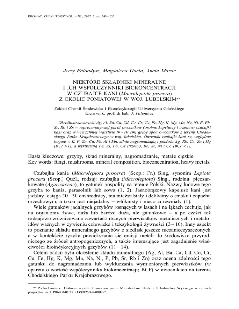 BROMAT. CHEM. TOKSYKOL. – XL, 2007, 3, str. 249 – 255 Jerzy Falandysz, Magdalena Gucia, Aneta Mazur NIEKTÓRE SKŁADNIKI MINERALNE I ICH WSPÓŁCZYNNIKI BIOKONCENTRACJI W CZUBAJCE KANI (Macrolepiota procera) Z OKOLIC PONIATOWEJ W WOJ. LUBELSKIM*) Zakład Chemii Środowiska i Ekotoksykologii Uniwersytetu Gdańskiego Kierownik: prof. dr hab. J. Falandysz Określono zawartość Ag, Al, Ba, Ca, Cd, Co, Cr, Cu, Fe, Hg, K, Mg, Mn, Na, Ni, P, Pb, Sr, Rb i Zn w reprezentatywnej partii owocników (osobno kapeluszy i trzonów) czubajki kani oraz w wierzchniej warstwie (0 – 10 cm) gleby spod owocników z terenu Chodelskiego Parku Krajobrazowego w woj. lubelskim. Owocniki czubajki kani sa˛ wzgle˛dnie bogate w K, P, Zn, Cu, Fe, Al i Mn, silnie nagromadzaja˛ z podłoża Ag, Rb, Cu, Zn i Hg (BCF > 1), a wykluczaja˛ Fe, Al, Pb, Cd (trzony), Ba, Sr, Ni i Co (BCF < 1). Hasła kluczowe: grzyby, skład mineralny, nagromadzanie, metale cie˛żkie. Key words: fungi, mushrooms, mineral composition, bioconcentration, heavy metals. Czubajka kania (Macrolepiota procera) (Scop.: Fr.) Sing, synonim Lepiota procera (Scop.) Quél., rodzaj: czubajka (Macrolepiota) Sing., rodzina: pieczarkowate (Agaricaceae), to gatunek pospolity na terenie Polski. Nazwy ludowe tego grzyba to kania, parasolnik lub sowa (1, 2). Jasnobra˛zowy kapelusz kani jest jadalny, osia˛ga 20 – 30 cm średnicy, ma mia˛ższ biały i delikatny o smaku i zapachu orzechowym, a trzon jest niejadalny – włóknisty i nieco zdrewniały (1). Wiele gatunków jadalnych grzybów rosna˛cych w lasach i na ła˛kach cechuje, jak na organizmy żywe, duża lub bardzo duża, ale gatunkowo – a po cze˛ści też rodzajowo-zróżnicowana zawartość różnych pierwiastków metalicznych i metaloidów ważnych w żywieniu człowieka i toksykologii żywności (3 – 10). Inny aspekt to poznanie składu mineralnego grzybów z siedlisk jeszcze niezanieczyszczonych a w kontekście ryzyka powie˛kszania sie˛ emisji metali do środowiska przyrodniczego ze źródeł antropogenicznych, a także interesuja˛ce jest zagadnienie właściwości bioindykacyjnych grzybów (11 – 14). Celem badań było określenie składu mineralnego (Ag, Al, Ba, Ca, Cd, Co, Cr, Cu, Fe, Hg, K, Mg, Mn, Na, Ni, P, Pb, Sr, Rb i Zn) oraz ocena zdolności tego gatunku do nagromadzania lub wykluczania wymienionych pierwiastków (w oparciu o wartość współczynnika biokoncentracji; BCF) w owocnikach na terenie Chodelskiego Parku Krajobrazowego. *) Podzie˛kowanie: Badania wsparte finansowo przez Ministerstwo Nauki i Szkolnictwa Wyższego w ramach projektów nr 3 P06S 040 22 i DS/8250-4-0092-7. 250 J. Falandysz i inni Nr 3 MATERIAŁ I METODYKA Owocniki czubajki kani oraz glebe˛ (15 owocników i 15 próbek podłoża glebowego – warstwa 0 – 10 cm; masa próbek gleby ok. 100 g) z lasów na terenie gminy Poniatowa (nadleśnictwo Kraśnik) na zachodnim skraju Kotliny Chodelskiej pozyskano do badań w roku 2002. Miasteczko Poniatowa leży 40 km na południowy zachód od Lublina i wraz z gmina˛ Poniatowa w cze˛ści wchodzi w skład Chodelskiego Parku Krajobrazowego. W przypadku grzyba próbke˛ jednostkowa˛ stanowił pojedynczy owocnik (okaz zdrowy w pełni wyrośnie˛ty i w dobrej kondycji o średniej wielkości typowej dla gatunku). W celu uniknie˛cia zbioru owocników pochodza˛cych z tej samej grzybni oraz zapewnienia reprezentatywność próbek dla badanego terenu poszczególne okazy zbierano z miejsc przestrzennie zdecydowanie odległych od siebie. Owocniki starannie oczyszczano od piasku i liści (plastykowy nóż) bezpośrednio po pozyskaniu. Owocniki suszono w temperaturze pokojowej w przewiewnym, suchym i czystym miejscu przez kilka dni. Naste˛pnie, powietrzne suche okazy dosuszano do stałej masy w temp. 30°C w suszarce elektrycznej przez 72 godz. Dalej materiał (osobno kapelusz i trzon) ujednorodniano – ucieraja˛c na proszek w moździerzu agatowym i do czasu analizy przetrzymywano woreczkach strunowych z folii polietylenowej. Próbki gleby pobrane w miejscach gdzie wyrosły grzyby oczyszczano z patyków, liści, korzeni, kamyków oraz bezkre˛gowców i pakowano do czystych woreczków z folii polietylenowej. Woreczki z gleba˛ pozostawiano otwarte przez 2 – 3 tyg. w czystym i suchym pomieszczeniu w temperaturze pokojowej w celu wysuszenia. Tak przygotowana˛ powietrznie sucha˛ glebe˛ przesiewano przez sito o średnicy oczek 1 mm, pakowano do fabrycznie nowych woreczków strunowych z folii polietylenowej i pozostawiano w archiwum próbek do czasu analizy. Podwielokrotność sproszkowanych próbek pojedynczych kapeluszy i trzonów (naważka 0,4 – 0,5 g) mineralizowano z 6 cm3 ste˛ż. HNO3, zgodnie z opracowana˛ metodyka˛ w kuchni mikrofalowej MARS 5 (CEM Corporation). W przypadku gleby analizowano próbki zbiorcze – w tym celu trzy równoważne ilościowo próbki jednostkowe gleby z sa˛siaduja˛cych ze soba˛ stanowisk ła˛czono. Do analizy zawartości rte˛ci ogółem pobierano 3 gramowe próbki gleby, która˛ wste˛pnie mineralizowano w systemie otwartym przez 24 h na zimno z 2 cm3 roztworu ste˛żonego kwasu azotowego (65%, Suprapur, Merck), naste˛pnie dodawano 2 cm3 roztworu ste˛żonego kwasu siarkowego (98 %) i dalej mineralizowano na gora˛co (3). W celu oznaczenia zawartości pozostałych pierwiastków podwielokrotność próbki zbiorczej gleby z trzech stanowisk (5 g) ługowano na zimno w zlewce kwarcowej z 20 cm3 z roztworem (20%) kwasu azotowego (4). Zawartość Al, Ba, Ca, Cd, Cu, Fe, K, Mg, Mn, Na, P, Pb, Rb, Sr, Zn oznaczano metoda˛ atomowej spektrometrii emisyjnej z plazma˛ wzbudzona˛ indukcyjnie (ICP-AES), a rte˛ci ogółem technika˛ zimnych par bezpłomieniowej atomowej spektroskopii absorpcyjnej (CV-AAS) (3, 15). WYNIKI I ICH OMÓWIENIE Wartości średniej arytmetycznej, odchylenia standardowego oraz rozste˛pu ste˛żeń badanych pierwiastków w przeliczeniu na mase˛ wysuszonych owocników (osobno kapeluszy i trzonów) czubajki ka