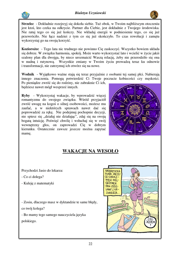 Biuletyn Uczniowski Strzelec - Dokładnie rozejrzyj się dokoła siebie. Tuż obok, w Twoim najbliższym otoczeniu jest ktoś, kto czeka na odkrycie. Partner dla Ciebie, jest dokładnie z Twojego środowiska. Nie ratuj tego co się już kończy. Nie wkładaj energii w podniesienie tego, co się już przewróciło. Nie łącz nadziei z tym co się już skończyło. To czas rewolucji i zamętu wykorzystaj go na swoją korzyść. Koziorożec - Tego lata nic trudnego nie powinno Cię zaskoczyć. Wszystko bowiem układa się dobrze. W związku harmonia, spokój. Może warto wykorzystać lato i wcielić w życie jakiś szalony plan dla dwojga, by nieco urozmaicić Waszą relację, żeby nie przerodziło się ona w nudną i rutynową. Wszystkie zmiany w Twoim życiu prowadzą teraz ku odnowie i transformacji, nie zatrzymuj ich otwórz się na nowe. Wodnik - Wyjątkowo ważne stają się teraz przyjaźnie z osobami tej samej płci. Nabierają innego znaczenia. Pomogą potwierdzić Ci Twoje poczucie kobiecości czy męskości. Po pieniądze zwróć się do rodziny, nie zabraknie Ci ich, będziesz nawet mógł wesprzeć innych. Ryby - Wykorzystaj wakacje, by wprowadzić więcej romantyzmu do swojego związku. Wśród przyjaciół zwróć uwagę na kogoś o silnej osobowości, możesz mu zaufać, a w niektórych sprawach nawet dać się poprowadzić za rękę. Nie podejmuj pochopnie decyzji, nie spiesz się „działaj nie działając”, zdaj się na swoją bogatą intuicję. Poświęć chwilę i wsłuchaj się w swój wewnętrzny głos, on zaprowadzi Cię w dobrym kierunku. Ostatecznie zawsze jeszcze można zapytać mamę. WAKACJE NA WESOŁO Przychodzi Jasio do lekarza: - Co ci dolega? - Kuleję z matematyki - Zosiu, dlaczego masz w dyktandzie te same błędy, co twój kolega? - Bo mamy tego samego nauczyciela języka polskiego. 22