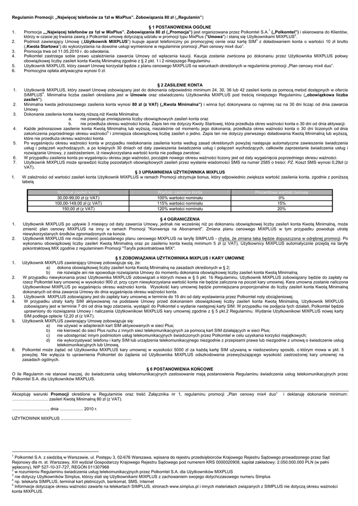 Regulamin Promocji: „Najwięcej telefonów za 1zł w MixPlus”. Zobowiązania 80 zł („Regulamin”)