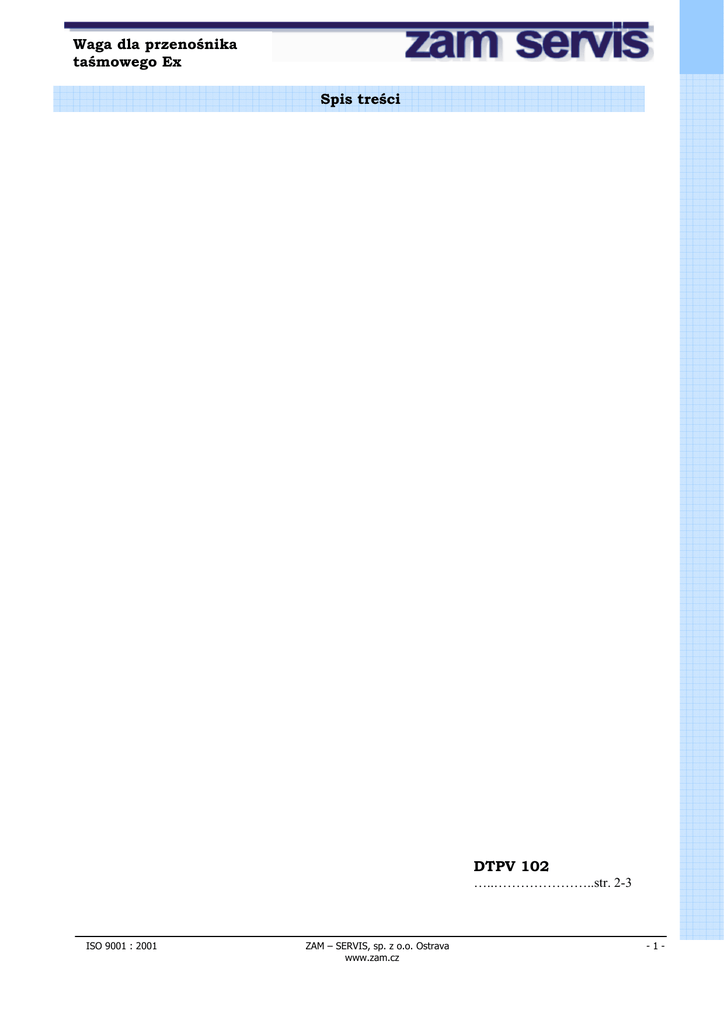 Waga przenośnika Váhadla pro pásový dopravník Ex taśmowego Ex Spis treści DTPV 102 …..…………………..str. 2-3 ISO 9001 : 2001 ZAM – SERVIS, sp. z o.o. Ostrava www.zam.cz -1- Waga przenośnika Váhadla pro pásový dopravník Ex taśmowego Ex DTPV 102 – Waga dla przenośnika taśmowego Ex Zastosowanie: Zestaw składa się z jednostki porównawczej SMA-01 V ze wzmacniaczem T01, z wyjściem prądowym od 4 do 20mA. Funkcje podstawowe umożliwiają kalibrację półautomatyczną, wskazanie momentalnej ilości materiału, trzy liczniki podsumowujące ilości materiału, dwa z możliwością gaszenia licznika. Dokładność wagi taśmowej ±1,5%. Opis: Wzmacniacz T01 jest umieszczony w zamknięciu niewybuchowym JBP BOS obok stolca wagi. Zasilanie wzmacniacza 2x15V w kablu ekranowanym ma minimum 4x1mm2 z JB źródła. JB źródło wspólnie z jednostką porównawczą jest w zamknięciu stałym o oznaczeniu SMA-01V. Wyjściem z jednostki porównawczej jest pętla prądowa 4…20mA JB, z której przenoszone są informacje o substancji. Typ substancji (momentalna lub suma za określoną jednostkę) można zaprogramować w jednostce porównawczej. Pętlę prądową można podłączyć do systemu transmisji np. DPS 2000 (patrz schemat blokowy). jednostka porównawcza z jb źródłem 24V wzmacniacz T01 stolec ważący jeden podkład z tenzometrem ATD 1260 ISO 9001 : 2001 24V jb zasilanie ZAM – SERVIS, sp. z o.o. Ostrava www.zam.cz informacje wejściowe 4...20mA -2- Waga przenośnika Váhadla pro pásový dopravník Ex taśmowego Ex DTPV 102 – Waga dla przenośnika taśmowego Ex Wejścia: • jedno wejście analogowe (12 bitowy A/D przetwornik) • 6 wejść cyfrowych galwanicznie oddzielonych elementami optycznymi. Parametry techniczne: Wydajność za godzinę: Prędkość taśmy: Wyjścia: • jedno wyjście cyfrowe oddzielone galwanicznie – kontakt przekaźnik 2A; 230V tylko dla DVP • na życzenie klienta wyjście analogowe lub pętla prądowa od 4(0) do 20mA. • RS 232 do 20m lub RS 485 do 1200m •liczbę wejść i wyjść można dostosować do wymagań klienta • możliwość podłączenia drukarki • możliwość podłączenia do PC • połączenie z techniką pomiarów i regulacji (zamknięcie magazynka, przetworników częstotliwości) sterowanie Dokładność obliczeń stanowi: • ustalona prędkość taśmy • udary rolek • jednorodność i elastyczność taśmy • typ naprężenia taśmy ISO 9001 : 2001 0,5 ton/h do 10 000 ton/h 0,02 m . s-1 do 5 m . s-1 Szerokość taśmy: od 400mm do 1800mm kąt nachylenia 0° do 20° taśmy: Napięcie w sieci: 230V ± 10%, 50Hz Zakres temperatur: -15°С do +55°С Pobór: Jednostka porównawcza: Wzmacniacz: Stopień ochrony: Dokładność pomiarów: ZAM – SERVIS, sp. z o.o. Ostrava www.zam.cz 10VA 5 VA IP 54 OIML 50 pierwsza klasa dokładności (± 0,5%) -3-