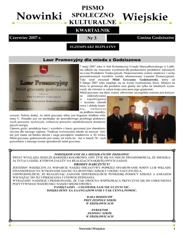 Nowinki PISMO SPOŁECZNO KULTURALNE Wiejskie KWARTALNIK Czerwiec 2007 r. Nr 3 Gmina Godziszów EGZEMPLARZ BEZPŁATNY Laur Promocyjny dla miodu z Godziszowa 7 maja 2007 roku w Sali Kolumnowej Urzędu Marszałkowskiego w Lublinie odbyło się wręczenie wyróŜnień dla producentów produktów wpisanych na Listę Produktów Tradycyjnych. Niepowtarzalne walory smakowe i cechy prezentowanych wyrobów zostały uhonorowane Laurami Promocyjnymi. Taki tytuł otrzymał Miód Gryczany Godziszowski, który od 9 lutego 2007 roku znajduje się na wyŜej wymienionej liście. Miejsce na liście to promocja dla produktu oraz gminy nie tylko na lokalnych wystawach, ale równieŜ w całym kraju oraz poza jego granicami. Miód gryczany ma duŜe walory zdrowotne szczególnie cenione jest korzystne oddziaływanie w zapobieganiu i leczeniu chorób serca i układu krąŜenia, zwłaszcza na podłoŜu miaŜdŜycowym. NaleŜy dodać, Ŝe miód gryczany takŜe jest bogatym źródłem witaminy C. Ponadto jest on niezbędny do prawidłowego przebiegu podstawowych procesów Ŝyciowych, zwłaszcza procesów metabolicznych dostarczających energię. Uprawa gryki, produkcja kasz i wyrobów z kaszy gryczanej jest charakterystyczna dla naszego regionu. Tradycja wytwarzania miodu na naszym terenie jest znana od bardzo dawna i sięga początków osadnictwa w XI wieku. Miód gryczany godziszowski jest znany od wielu lat . JuŜ w latach 70—tych pszczelarze z naszego terenu sprzedawali miód gryczany. PODZIĘKOWANIE DLA MIESZKAŃCÓW ZDZIŁOWIC ŚWIAT WYGLĄDA JESZCZE BARDZIEJ KOLOROWO, GDY śYJE SIĘ NA NIM ZE ŚWIADOMOŚCIĄ, śE MIESZKAJĄ TUTAJ LUDZIE, KTÓRYM ZALEśY NA REALIZACJI NAKREŚLONYCH ZADAŃ. DRODZY DARCZYŃCY! JESTEŚMY WDZIĘCZNI ZA WSPARCIE NASZEJ INICJATYWY POPRZEZ OFIAROWANIE SOSNY LUB WKŁADU FINANSOWEGO NA WYKONANIE DACHU NA BUDYNKU SZKOŁY I DOMU NAUCZYCIELA. UDOWODNILIŚCIE, śE REALIZUJĄC ZADANIE DOSTRZEGLIŚCIE POTRZEBĘ POMOCY SZKOLE A ZARAZEM WSI DĄśĄC DO JEJ UPIĘKSZANIA I UNOWOCZEŚNIANIA. WYRAśAMY NADZIEJĘ I PRZEKONANIE, śE TAK OWOCNA WSPÓŁPRACA PRZYCZYNI SIĘ DO UMOCNIENIA POZYTYWNEGO WIZERUNKU NASZEJ MIEJSCOWOŚCI. PAMIĘTAJMY – CZŁOWIEK SAM NIE UCZYNI NIC. DZIĘKUJEMY ZA ZAANGAśOWANIE I TAK CENNĄ POMOC. RADA RODZICÓW PRZY ZESPOLE SZKÓŁ W ZDZIŁOWICACH DYREKTOR ZESPOŁU SZKÓŁ W ZDZIŁOWICACH Nowinki Wiejskie 1 Praca i odpowiedzialność Z całą pewnością praca w Sejmiku Województwa Lubelskiego jest pracą dającą satysfakcję, ale przede wszystkim jest obowiązkiem, który jeśli chce się dobrze spełnić wymaga czasu i zaangaŜowania. Będąc członkiem Komisji Infrastruktury Gospodarki i Inwestycji oraz przewodniczącym Komisji Rozwoju Regionalnego i Współpracy granicznej mam w jakimś stopniu moŜliwość wpływania na prace bieŜące komisji. Wszystkie projekty uchwał trafiają do komisji zanim o ich losach w głosowaniu zadecyduje Sejmik. Do zadań Komisji Rozwoju Regionalnego i Współpracy Zagranicznej naleŜy między innymi: - praca nad strategią województwa i nad programami dla województwa, - inicjowanie działań zmierzających do rozwoju regionu, - opiniowanie i inicjowanie priorytetów współpracy zagranicznej województwa oraz ocena efektów tej współpracy, - opiniowanie polityki rozwoju turystyki i wspieranie inicjatyw na rzecz rozwoju turystyki, - podejmowanie działań w zakresie współpracy zagranicznej i promocji województwa w świecie, - opiniowanie planu zagospodarowania przestrzennego województwa. Dodam, Ŝe do tej komisji tra- fia znaczna część projektów inwestycyjnych do zaopiniowania i weryfikacji. Mam nadzieję, Ŝe między innymi dla gminy Godziszów uda nam się pozyskać znaczne środki z poszczególnych programów. Jako radny sejmiku nie licząc moŜliwości interwencji zarówno w sprawach osób fizycznych, jak i prawnych uczestniczę w posiedzeniach komisji oraz w jakimś stopniu takŜe w tworzeniu budŜetu województwa. Muszę jednak zaznaczyć, Ŝe moŜliwość wykorzystania wojewódzkich środków budŜetowych przez gminy Powiatu Janowskiego jest minimalna. I pomimo dobrego powiedziałbym „przełoŜenia” z uwagi na brak majątku „marszałkowskiego”, niewiele moŜna tu zrobić. Stąd teŜ inicjatywa zmiany statusu drogi powiatowej Janów – Batorz na drogę o znaczeniu wojewódzkim. Mam nadzieję, Ŝe zakończy się to pomyślnie, a zyska na tym między innymi Gmina Godziszów. Natomiast duŜe moŜliwości pojawią się z chwilą uruchomienia min. Regionalnego Programu Operacyjnego /RPO/. Program ten stanowi najbardziej istotny instrument polityki regionalnej województwa w okresie 20072013. Dla niezorientowanych dodam, Ŝe są to środki pozabudŜetowe województwa. Ujmując to w skrócie, są to środki pochodzące z funduszy unij- nych. Łączy on większość zadań realizowanych przez jednostki samorządu terytorialnego oraz inne jednostki publiczne i prywatne w ramach funduszy strukturalnych Unii Europejskiej. Realizuje on zapisy zawarte w Strategii Rozwoju Województwa Lubelskiego na lata 2006-2020, przyjętej przez Sejmik Województwa Lubelskiego w 2005 roku. Na jego realizację przeznaczono €1 155,9 mln pochodzących z Europejskiego Funduszu Rozwoju Regionalnego. Start tego programu przewidywany jest na czwarty kwartał bieŜącego roku. Jednak i tutaj musi być intensywne współdziałanie gmin i starosty w celu optymalnego pozyskania środków unijnych, które w najbliŜszych latach mam nadzieję staną się teŜ naszym udziałem. Będzie to moŜliwe, gdyŜ współpraca z Radą Gminy Godziszów oraz z Wójtem układa się bardzo dobrze. To z inicjatywy Wójta i Rady zrodzą się i oby jak najszybciej projekty, które po weryfikacji trafią pod obrady komisji merytorycznych w sejmiku i wreszcie do realizacji. Nie jest moim celem przybliŜanie Państwu tematów ani zakresu proponowanych zadań, myślę, Ŝe na pewno zrobi to Wójt w stosownym czasie. Jednak nie ukrywam, Ŝe pomysłów nie brakuje rów