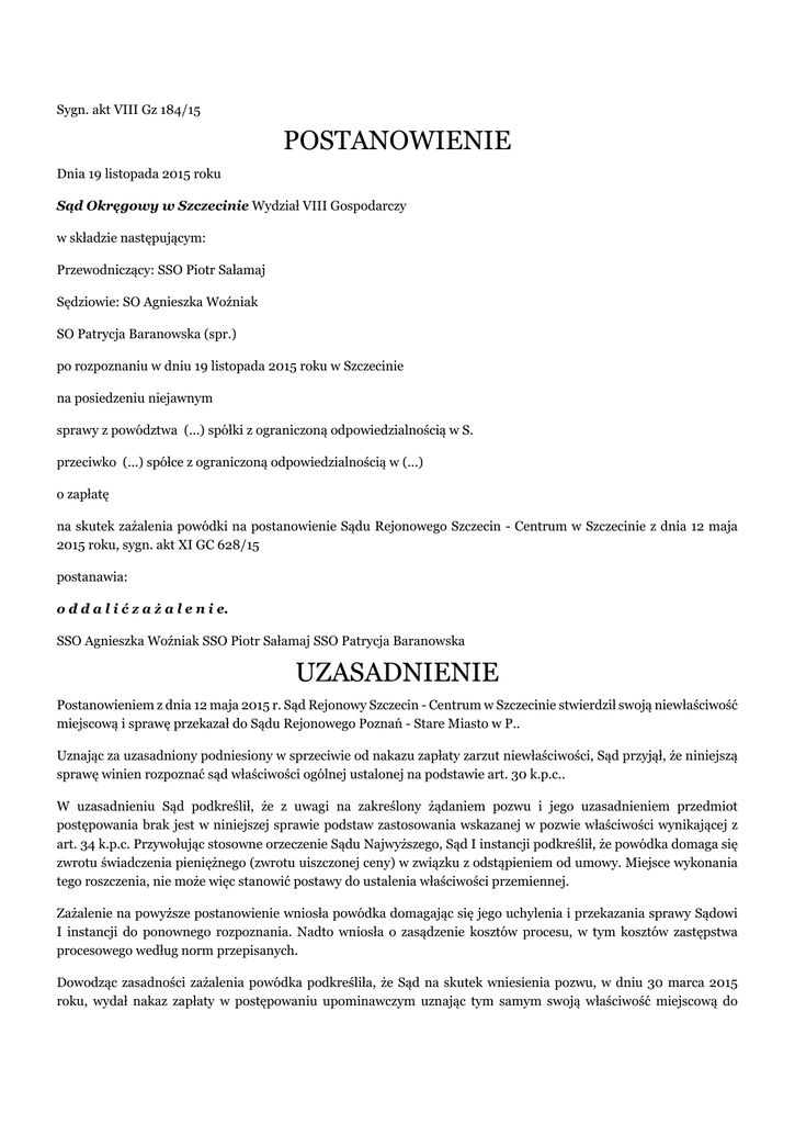 Sygn. akt VIII Gz 184/15 POSTANOWIENIE Dnia 19 listopada 2015 roku Sąd Okręgowy w Szczecinie Wydział VIII Gospodarczy w składzie następującym: Przewodniczący: SSO Piotr Sałamaj Sędziowie: SO Agnieszka Woźniak SO Patrycja Baranowska (spr.) po rozpoznaniu w dniu 19 listopada 2015 roku w Szczecinie na posiedzeniu niejawnym sprawy z powództwa (...) spółki z ograniczoną odpowiedzialnością w S. przeciwko (...) spółce z ograniczoną odpowiedzialnością w (...) o zapłatę na skutek zażalenia powódki na postanowienie Sądu Rejonowego Szczecin - Centrum w Szczecinie z dnia 12 maja 2015 roku, sygn. akt XI GC 628/15 postanawia: o d d a l i ć z a ż a l e n i e. SSO Agnieszka Woźniak SSO Piotr Sałamaj SSO Patrycja Baranowska UZASADNIENIE Postanowieniem z dnia 12 maja 2015 r. Sąd Rejonowy Szczecin - Centrum w Szczecinie stwierdził swoją niewłaściwość miejscową i sprawę przekazał do Sądu Rejonowego Poznań - Stare Miasto w P.. Uznając za uzasadniony podniesiony w sprzeciwie od nakazu zapłaty zarzut niewłaściwości, Sąd przyjął, że niniejszą sprawę winien rozpoznać sąd właściwości ogólnej ustalonej na podstawie art. 30 k.p.c.. W uzasadnieniu Sąd podkreślił, że z uwagi na zakreślony żądaniem pozwu i jego uzasadnieniem przedmiot postępowania brak jest w niniejszej sprawie podstaw zastosowania wskazanej w pozwie właściwości wynikającej z art. 34 k.p.c. Przywołując stosowne orzeczenie Sądu Najwyższego, Sąd I instancji podkreślił, że powódka domaga się zwrotu świadczenia pieniężnego (zwrotu uiszczonej ceny) w związku z odstąpieniem od umowy. Miejsce wykonania tego roszczenia, nie może więc stanowić postawy do ustalenia właściwości przemiennej. Zażalenie na powyższe postanowienie wniosła powódka domagając się jego uchylenia i przekazania sprawy Sądowi I instancji do ponownego rozpoznania. Nadto wniosła o zasądzenie kosztów procesu, w tym kosztów zastępstwa procesowego według norm przepisanych. Dowodząc zasadności zażalenia powódka podkreśliła, że Sąd na skutek wniesienia pozwu, w dniu 30 marca 2015 roku, wydał nakaz zapłaty w postępowaniu upominawczym uznając tym samym swoją właściwość miejscową do rozpoznania niniejszej sprawy. Ze względu na treść art. 15 k.p.c. Sąd wydając nakaz zapłaty, stał się sądem właściwym i powinien nim pozostać aż do ukończenia postępowania. Powódka przyznała nadto, że niniejsza sprawa dotyczy zwrotu świadczeń po odstąpieniu od umowy sprzedaży samochodu, przy czym w samej treści pozwu jako podstawę właściwości miejscowej Sądu faktycznie wskazano jedynie art. 34 k.p.c. Zdaniem powódki z okoliczności sprawy wynika jednak, iż właściwość miejscowa Sądu Rejonowego w Szczecinie uzasadniona była również na podstawie art. 33 k.p.c. i tym również musiał kierować się Sąd wydając wskazany wyżej nakaz zapłaty. Roszczenie powódki jest bowiem w całości, nierozerwalnie związane z działalnością oddziału pozwanej spółki w S.. Zdaniem powódki niniejsza sprawa powinna być rozpatrywana przez Sąd Rejonowy Szczecin-Centrum w Szczecinie także z uwagi na zasadę koncentracji materiału dowodowego w procesie cywilnym, zasadę ekonomiki procesu a także zasady logicznego rozumowania. Wszystkie okoliczności sprawy, takie jak wydanie i zwrócenie przedmiotu umowy, zawarcie umowy, realizacja praw i obowiązków z umowy łączącej strony miały miejsce w S.. W S. znajdują się również siedziby obu stron (powódki i oddziału pozwanej, z którego działalnością związane jest roszczenie), nadto wszelkie osoby mające związek ze sprawą, a więc ewentualni świadkowie i biegli również znajdują się w S.. W odpowiedzi na zażalenie pozwana wniosła o jego oddalenie oraz zasądzenie kosztów zastępstwa procesowego według norm przepisanych. Sąd Okręgowy zważył, co następuje: Zażalenie nie zasługuje na uwzględnienie. Sąd Okręgowy akceptuje ustalenia faktyczne Sądu Rejonowego oraz ich konsekwencje prawne, w zakresie oceny przesłanek dotyczących ustalenia właściwości Sądu Poznań - Stare Miasto w P. i przekazania niniejszej sprawy temu sądowi do rozpoznania. Mając na uwadze przedstawiane w zażaleniu zarzuty przede wszystkim stwierdzić należy, że nie zasługują na uwzględnienie wywody skarżącej, która powołując się na art. 15 § 1 k.p.c. podnosi, że skoro w momencie złożenia pozwu Sąd Rejonowy Szczecin-Centrum w Szczecinie uznał się za właściwy poprzez wydanie nakazu zapłaty, to zgodnie z przywołanym przepisem powinien nim pozostać aż do ukończenia postępowania. W myśl regulacji zawartej w art. 202 k.p.c. sąd na żadnym etapie postępowania - również przed doręczeniem odpisu pozwu - nie bada z urzędu tak zwanej niewłaściwości usuwalnej. Może to uczynić i w efekcie przekazać sprawę sądowi właściwemu jedynie na zarzut pozwanego, zgłoszony i należycie uzasadniony przed wdaniem się w spór co do istoty sprawy. Tym samym kontrola właściwości miejscowej sądu, poza właściwością wyłączną, na odpowiednim etapie postępowania powierzona została całkowicie stronie pozwanej. Powódka korzystając z możliwości wniesienia pozwu według własnego uznania do sądu innego niż właściwości ogólnej, może zatem liczyć na rozstrzygnięcie sprawy przez ten właśnie sąd wybrany, nie wskazując jednak już w pozwie uzasadnionych okoliczności wybór ten uzasadniających naraża się na zarzut strony przeciwnej, który może doprowadzić do przekazania sprawy. W tym miejscu zaznaczenia również wymaga, że określenie żądania pozwu oraz wskazanie uzasadniających powództwo okoliczności faktycznych, ma podstawowe i jednocześnie wiążące znaczenie dla przebiegu procesu. W ten bowiem sposób konkretyzuje się zakres prawa przedmiotowego poddanego przez powoda ochronie, zostają także wyznaczone granice rozpoznania sprawy. Przedstawione przez stronę powodową okolicz