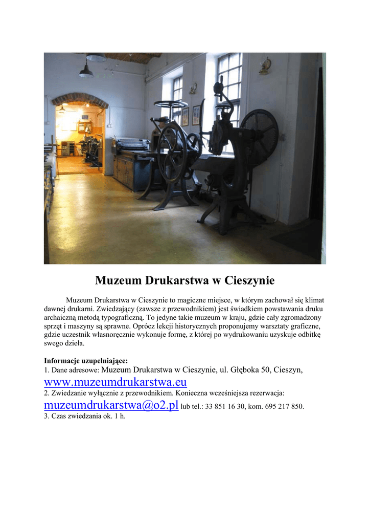 Muzeum Drukarstwa w Cieszynie Muzeum Drukarstwa w Cieszynie to magiczne miejsce, w którym zachował się klimat dawnej drukarni. Zwiedzający (zawsze z przewodnikiem) jest świadkiem powstawania druku archaiczną metodą typograficzną. To jedyne takie muzeum w kraju, gdzie cały zgromadzony sprzęt i maszyny są sprawne. Oprócz lekcji historycznych proponujemy warsztaty graficzne, gdzie uczestnik własnoręcznie wykonuje formę, z której po wydrukowaniu uzyskuje odbitkę swego dzieła. Informacje uzupełniające: 1. Dane adresowe: Muzeum Drukarstwa w Cieszynie, ul. Głęboka 50, Cieszyn, www.muzeumdrukarstwa.eu 2. Zwiedzanie wyłącznie z przewodnikiem. Konieczna wcześniejsza rezerwacja: [email protected] lub tel.: 33 851 16 30, kom. 695 217 850. 3. Czas zwiedzania ok. 1 h.