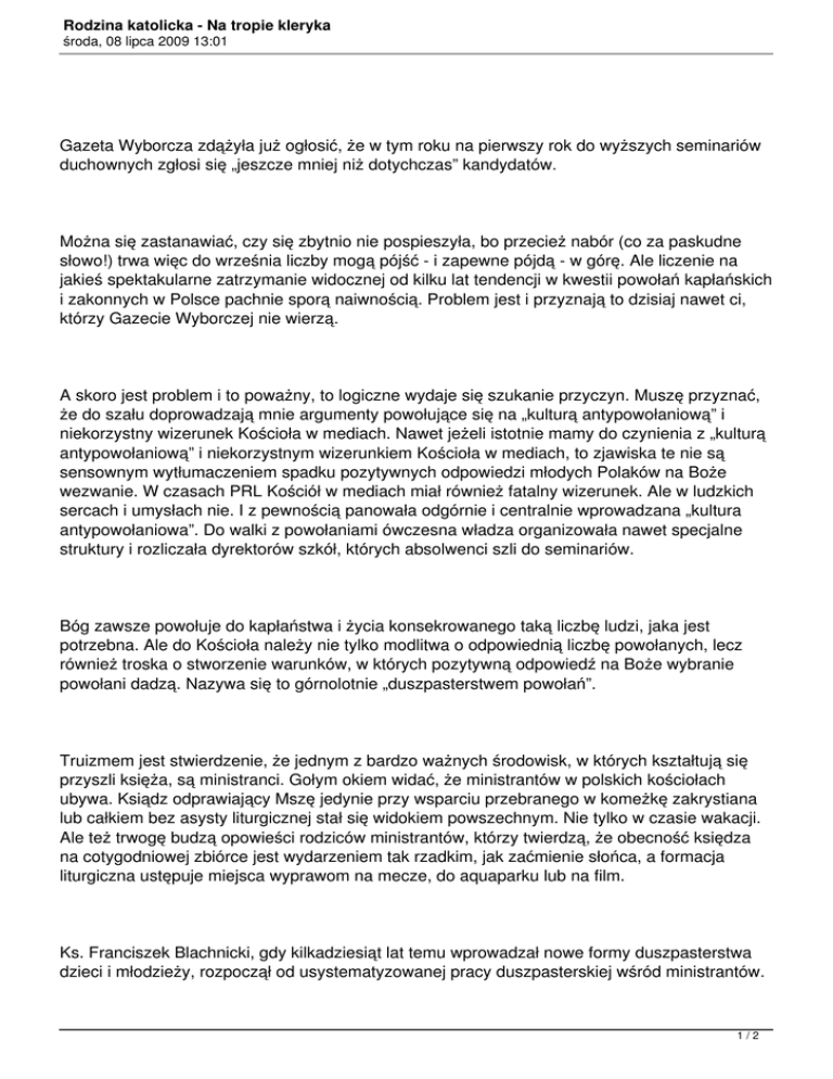Rodzina katolicka - Na tropie kleryka środa, 08 lipca 2009 13:01 Gazeta Wyborcza zdążyła już ogłosić, że w tym roku na pierwszy rok do wyższych seminariów duchownych zgłosi się „jeszcze mniej niż dotychczas” kandydatów. Można się zastanawiać, czy się zbytnio nie pospieszyła, bo przecież nabór (co za paskudne słowo!) trwa więc do września liczby mogą pójść - i zapewne pójdą - w górę. Ale liczenie na jakieś spektakularne zatrzymanie widocznej od kilku lat tendencji w kwestii powołań kapłańskich i zakonnych w Polsce pachnie sporą naiwnością. Problem jest i przyznają to dzisiaj nawet ci, którzy Gazecie Wyborczej nie wierzą. A skoro jest problem i to poważny, to logiczne wydaje się szukanie przyczyn. Muszę przyznać, że do szału doprowadzają mnie argumenty powołujące się na „kulturą antypowołaniową” i niekorzystny wizerunek Kościoła w mediach. Nawet jeżeli istotnie mamy do czynienia z „kulturą antypowołaniową” i niekorzystnym wizerunkiem Kościoła w mediach, to zjawiska te nie są sensownym wytłumaczeniem spadku pozytywnych odpowiedzi młodych Polaków na Boże wezwanie. W czasach PRL Kościół w mediach miał również fatalny wizerunek. Ale w ludzkich sercach i umysłach nie. I z pewnością panowała odgórnie i centralnie wprowadzana „kultura antypowołaniowa”. Do walki z powołaniami ówczesna władza organizowała nawet specjalne struktury i rozliczała dyrektorów szkół, których absolwenci szli do seminariów. Bóg zawsze powołuje do kapłaństwa i życia konsekrowanego taką liczbę ludzi, jaka jest potrzebna. Ale do Kościoła należy nie tylko modlitwa o odpowiednią liczbę powołanych, lecz również troska o stworzenie warunków, w których pozytywną odpowiedź na Boże wybranie powołani dadzą. Nazywa się to górnolotnie „duszpasterstwem powołań”. Truizmem jest stwierdzenie, że jednym z bardzo ważnych środowisk, w których kształtują się przyszli księża, są ministranci. Gołym okiem widać, że ministrantów w polskich kościołach ubywa. Ksiądz odprawiający Mszę jedynie przy wsparciu przebranego w komeżkę zakrystiana lub całkiem bez asysty liturgicznej stał się widokiem powszechnym. Nie tylko w czasie wakacji. Ale też trwogę budzą opowieści rodziców ministrantów, którzy twierdzą, że obecność księdza na cotygodniowej zbiórce jest wydarzeniem tak rzadkim, jak zaćmienie słońca, a formacja liturgiczna ustępuje miejsca wyprawom na mecze, do aquaparku lub na film. Ks. Franciszek Blachnicki, gdy kilkadziesiąt lat temu wprowadzał nowe formy duszpasterstwa dzieci i młodzieży, rozpoczął od usystematyzowanej pracy duszpasterskiej wśród ministrantów. 1/2 Rodzina katolicka - Na tropie kleryka środa, 08 lipca 2009 13:01 Później przyszła pora na Roch Światło Życie. Jest oczywiste, że te wymyślone w innych warunkach, w innej sytuacji Kościoła, formy duszpasterskie, już się zużyły. Nie ma wiece sensu biadanie nad tym, że nie budzą one tak masowego odzewu, jak kiedyś. Trzeba znaleźć i zacząć stosować w praktyce nowe formy duszpasterstwa ludzi młodych. Tymczasem w ciągu ostatniego dwudziestolecia Kościół katolicki w Polsce nie wprowadził na zauważalną skalę żadnej nowej formy duszpasterskiej adresowanej do dzieci lub do młodzieży. Nie znalazł sposobu, aby skutecznie połączyć z duszpasterstwem katechezę szkolną. Nauczenie religii w szkole i życie parafii poza I Komunią św. i bierzmowaniem praktycznie nie maja punktów stycznych. Są osobnymi bytami. Kościół katolicki w Polsce nie wymyślił żadnej formy duszpasterskiej, która angażowałaby media, a zwłaszcza tak zwane nowe media. Piszę to nie jako pretensje. Piszę to jako rachunek sumienia. Mam wrażenie, że chociaż niedługo będziemy obchodzić dwudziestą rocznicę powrotu religii do klas szkolnych, Kościół nadal nie znalazł formuły zintegrowania parafialnego duszpasterstwa z katechizowaniem w szkołach. Pewien wielkiej zacności proboszcz prawie dwie dekady temu wiadomość o powrocie religii do szkół skomentował smutnym okrzykiem: „No to straciłem młodzież z parafii!”. Wygląda na to, że wciąż trwamy wsłuchując się w echo tego okrzyku. A potem czytamy z oburzeniem lub z bólem artykuły o tym, że polskich seminariach duchownych jest coraz mniej kleryków. I wcale nie poczuwamy się do winy. Ks. Artur Stopka Źródło: Wiara.pl 2/2