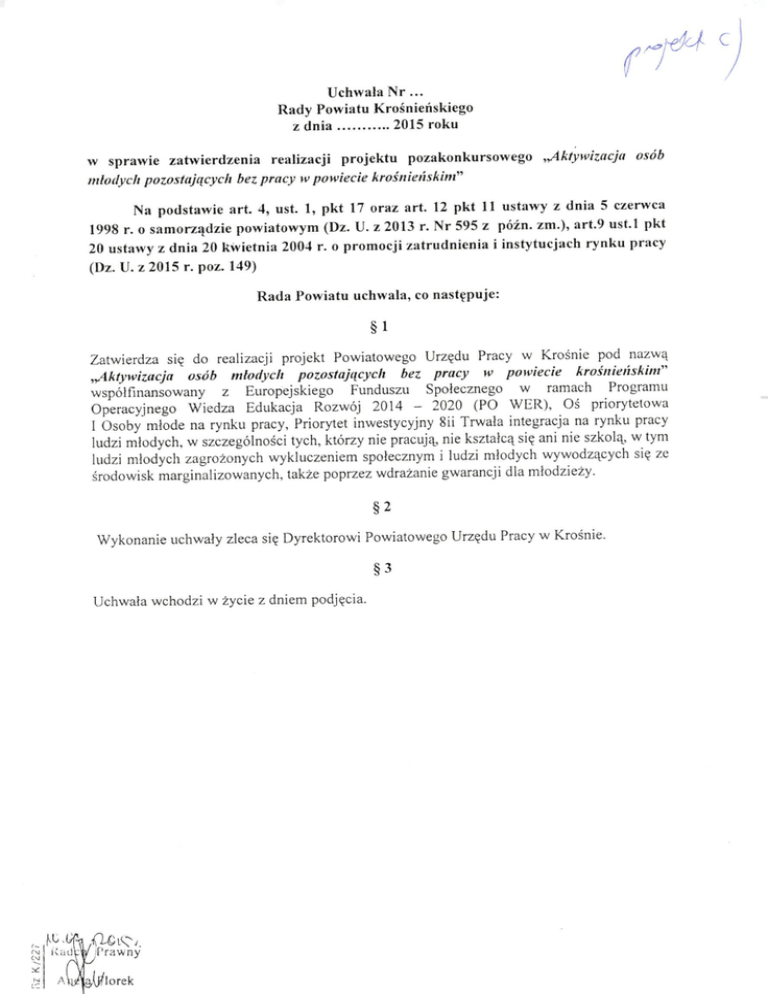 Uchwa la Nr .„ Rad y Powiatu Kroś nieńskiego z dnia .. ... .. . ... 2015 roku w sprawie zatwierdzen ia realiza cji projektu poza konkursowe go ,,A ktywizacja osób 111/odyclt pozostających bez pracy 1v powiecie k rośnie1iski111" Na podstawie art. 4, ust. I , pkt 17 oraz art. 12 pkt 11 ustawy z dnia 5 czerwca 1998 r. o sa m orządzie powiatowym (Dz. U. z 2013 r. Nr 595 z p óźn. zm.), art.9 ust.I pkt 20 ustawy z dnia 20 k\vietnia 2004 r. o promocji zatrudnienia i insty tu cjac h rynku pracy (Dz. U. z 2015 r. poz. 149) Rada Powiatu uchwala, co na s tę puj e: §1 Zatwierdza się do realizacji projekt Powiatowego Urzędu Pracy w Krośn i e pod nazwą ,.,Aktywizacja osób młodych po zostają cych bez pracy w powiecie kroś11ie1isk i111 " z Europejskiego Funduszu Społecznego w ramach Programu współfi nan sowany Operacyjnego Wiedza Edukacja Rozwój 2014 - 2020 (PO WER), Oś priorytetowa I Osoby młode na rynku pracy, Priorytet inwestycyjny 8ii Trwała integracja na rynku pracy ludzi młodych, w szczegó ln ośc i tych , którzy nie pracują, nie kształcą się ani nie szko lą, w tym ludzi młodych zagrożonych wykluczeniem społecznym i ludzi młodych wywodzących się ze . środowisk marginalizow anych, tak że poprzez wdrażanie gwarancji dla młodzieży §2 Wykonanie uchwały zleca się Dyrektorowi Powiatowego §3 Uchwała wchodzi w życie z dniem podjęcia. Urzędu Pracy w Krośnie . Uzasadnienie Powiatowy Urząd Pracy w Krośnie przygotowuje projekt „Aktywizacja osób bez pracy w powiecie kroś nieńs kim". Projekt finansowany będzie ze środków Europejskiego Funduszu Społecznego w ramach Programu Operacyjnego Wiedza Edukacja Rozwój (POWER). a prefinansowany ze środków Fundusz Pracy. młod yc h pozos tających Projekt realizowany będzie w ramach Osi priorytetowej I Osoby młode na rynku pracy Priorytet inwestycyjny Sii Trwała integracja na rynku pracy łudzi młodych , w szczególności tych, którzy nie pracują, nie kształcą się ani nie szkolą, w tym ludzi młodych zagrożonych wykl uczen iem społecznym i ludzi młodych wywodzących się ze środowisk marginalizowanych, tak że poprzez wdrażanie gwarancji dla młodzieży . Celem głównym projektu jest zwiększenie możliwości zatrudnienia osób roku ży cia pozo s tającyc h bez pracy w powiecie kroś nieńskim . Projektem w 2015 r. planujemy objąć 640 osób w następujących zadaniach: - staże - 300 osób - wartość zadania 2 420 900 złotych, - jednorazowe środki na podjecie działalności gospodarczej - 100 osób I 800 OOO złotych, - bon szkoleniowy - 50 osób - wartość zadania 185 OOO złotych, - szkolenia dla bezrobotnych - 150 osób - wartość zadania 450 OOO złotych, - bon na zasied len ie - 40 osób - wartość zadania 280 OOO złotych. Całkowita wartość wniesienia projektu w 2015 r. wyniesie 5 135 900 wkładu własnego. złotych. młod yc h do 29 wartość zadania Projekt nie zakłada