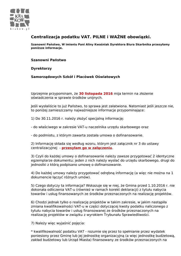 Centralizacja podatku VAT. PILNE i WAŻNE obowiązki. Szanowni Państwo, W imieniu Pani Aliny Kwaśniak Dyrektora Biura Skarbnika przesyłamy poniższe informacje. Szanowni Państwo Dyrektorzy Samorządowych Szkół i Placówek Oświatowych Uprzejmie przypominam, że 30 listopada 2016 mija termin na złożenie oświadczenia w sprawie środków unijnych. Jeśli wysłaliście to już Państwo, to sprawa jest załatwiona. Natomiast jeśli jeszcze nie, to poniżej zamieszczamy najważniejsze informacje przypominające: 1) Do 30.11.2016 r. należy złożyć specjalną informację: - do właściwego w zakresie VAT-u naczelnika urzędu skarbowego oraz - do podmiotu, z którym zawarta została umowa o dofinansowanie. 2) Informację składa się według wzoru, którym jest załącznik nr 3 do ustawy centralizacyjnej - przesyłam go w załączeniu. 3) Czyli do każdej umowy o dofinansowanie należy zawsze przygotować 2 identyczne egzemplarze dokumentu; jeden z nich należy wysłać do urzędu skarbowego, drugi do jednostki z którą podpisano umowę o dofinansowanie. 4) Do każdej umowy należy przygotować odrębną informację (a więc nie można na 1 dokumencie łączyć różnych umów). 5) Czego dotyczy ta informacja? Wskazuje się w niej, że Gmina przed 1.10.2016 r. nie dokonała odliczenia VAT-u (również w ramach korekt deklaracji) z tytułu nabycia towarów i usług finansowanych ze środków przeznaczonych na realizację projektów. 6) Chodzi jednak tylko o realizację projektów w takim zakresie, w jakim nastąpiła zmiana kwalifikowalności VAT-u w części dotyczącej kwoty podatku naliczonego z tytułu nabycia towarów i usług finansowanej ze środków przeznaczonych na realizację projektów w związku z wyrokiem Trybunału Sprawiedliwości. 7) Należy więc wyjaśnić pojęcia: * kwalifikowalność podatku VAT - rozumie się przez to spełnianie przez wydatek poniesiony przez Gminę lub jej jednostkę organizacyjną (a więc jednostkę budżetową, zakład budżetowy lub Urząd Miasta) finansowany ze środków przeznaczonych na realizację projektów, w części dotyczącej podatku VAT, kryteriów określonych w ustawach i aktach wykonawczych wydanych na ich podstawie, rozporządzeniach organów Unii Europejskiej, umowach międzynarodowych, porozumieniach międzyrządowych i umowach o dofinansowanie, stanowiących podstawę do otrzymania środków przeznaczonych na realizację projektów. Mówiąc prościej - kwalifikowalność oznacza, że dostaliśmy dofinansowanie na VAT. Zmiana kwalifikowalności oznacza, że w wyniku wyroku Trybunału nie powinniśmy dostać tego dofinansowania (np. dofinansowanie dostała placówka, która korzystała ze zwolnienia podmiotowego do 150 tys. obrotu, a po wyroku Trybunału okazało się, że to Gmina jest jednym podatnikiem i ta placówka nie powinna była korzystać ze zwolnienia). * środki przeznaczone na realizację projektów - rozumie się przez to środki publiczne: a) pochodzące z budżetu Unii Europejskiej lub od państw członkowskich Europejskiego Porozumienia o Wolnym Handlu (EFTA), b) otrzymane w formie dotacji- przeznaczone na realizację projektów finansowanych z udziałem środków pochodzących z budżetu Unii Europejskiej lub od państw członkowskich EFTA; * umowy o dofinansowanie - rozumie się przez to umowy o dofinansowanie, o których mowa w przepisach ustawy z dnia 20 kwietnia 2004 r. o Narodowym Planie Rozwoju (Dz.U. z 2014 r. poz. 1448 i 1856 oraz z 2015 r. poz. 1240) oraz ustawy z dnia 6 grudnia 2006 r. o zasadach prowadzenia polityki rozwoju (Dz.U. z 2016 r. poz. 383 i 1250), inne umowy przyznające środki przeznaczone na realizację projektów oraz decyzje, o których mowa w art. 5 pkt 9 ustawy z dnia 6 grudnia 2006 r. o zasadach prowadzenia polityki rozwoju. 8) Spełnienie ww. warunków (czyli nieodliczenie VAT który został dofinansowany) powoduje, że nie trzeba oddawać tych środków, które otrzymano na sfinansowanie podatku VAT. Dotyczy to jednak podatku VAT wyłącznie w zakresie, w jakim nastąpiła zmiana kwalifikowalności podatku w części dotyczącej kwoty podatku naliczonego z tytułu nabycia towarów i usług finansowanej ze środków przeznaczonych na realizację projektów, w zakresie wydatków poniesionych przez jednostki samorządu terytorialnego lub ich jednostki organizacyjne, zgodnie z zawartymi na dzień 29 września 2015 r. umowami o dofinansowanie. 9) Zestawienie tych przepisów oznacza, że: - jeśli umowy o dofinansowanie zawarte zostały do dnia 29 września 2015 r. i otrzymano również dofinansowanie do VAT-u i nie dokonywano potem odliczenia tego VAT-u (pomimo wydania wyroku TSUE) - należy złożyć oświadczenie, którego wzór przesyłam, w terminie do 30.11.2016; - jeśli otrzymano dofinansowanie na VAT a potem w związku z wyrokiem TSUE dokonano odliczenia VAT-u (np. w ramach korekty deklaracji) - to nie składa się oświadczenia (nie można nawet, bo z jego treści wynika, że nie odliczało się VAT), tylko należy oddać te środki otrzymane na VAT wraz z odsetkami za zwłokę - jeśli umowy o dofinansowanie zawarte zostały po dniu 29 września 2015 r. i otrzymano również dofinansowanie do VAT-u a z wyroku TSUE wynikało, że było prawo do odliczenia VAT - naszym zdaniem należałoby oddać środki otrzymane na VAT i rozważyć korektę deklaracji - uważamy jednak, że w przypadku tych umów nie należy składać oświadczenia. Do zwrotu lub rozliczeń tych środków przeznaczonych na realizację projektów związanych z podatkiem VAT w zakresie, w jakim nastąpiła zmiana kwalifikowalności podatku w części dotyczącej kwoty podatku naliczonego z tytułu nabycia towarów i usług, stosuje się odpowiednio: 1) przepisy prawa lub postanowienia umów, w tym umów o dofinansowanie, dotyczące przekazywania i zwrotu tych środków; 2) przepisy ustawy z dnia 27 sierpnia 2009 r. o finansach publicznych (Dz.U. z 2013 r. poz. 885, z późn. zm.3)) dotyczące dotacji - w