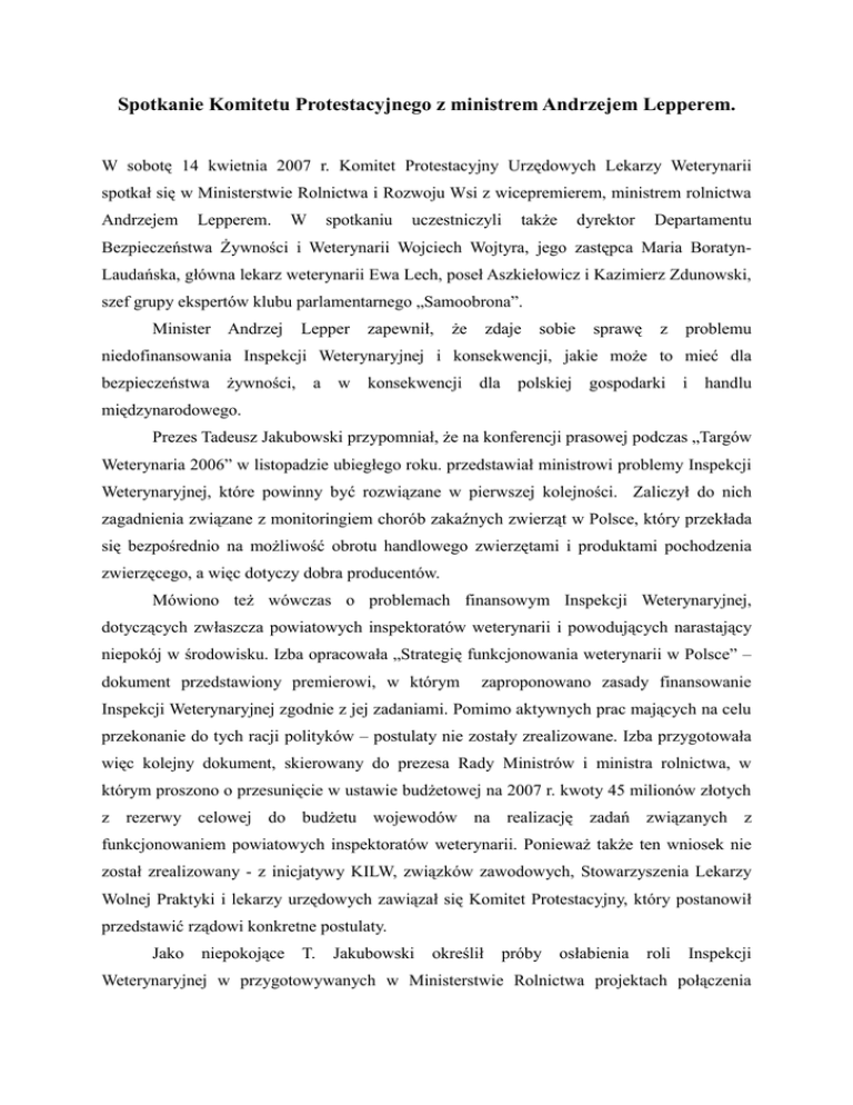 Spotkanie Komitetu Protestacyjnego z ministrem Andrzejem Lepperem. W sobotę 14 kwietnia 2007 r. Komitet Protestacyjny Urzędowych Lekarzy Weterynarii spotkał się w Ministerstwie Rolnictwa i Rozwoju Wsi z wicepremierem, ministrem rolnictwa Andrzejem Lepperem. W spotkaniu uczestniczyli także dyrektor Departamentu Bezpieczeństwa Żywności i Weterynarii Wojciech Wojtyra, jego zastępca Maria BoratynLaudańska, główna lekarz weterynarii Ewa Lech, poseł Aszkiełowicz i Kazimierz Zdunowski, szef grupy ekspertów klubu parlamentarnego „Samoobrona”. Minister Andrzej Lepper zapewnił, że zdaje sobie sprawę z problemu niedofinansowania Inspekcji Weterynaryjnej i konsekwencji, jakie może to mieć dla bezpieczeństwa żywności, a w konsekwencji dla polskiej gospodarki i handlu międzynarodowego. Prezes Tadeusz Jakubowski przypomniał, że na konferencji prasowej podczas „Targów Weterynaria 2006” w listopadzie ubiegłego roku. przedstawiał ministrowi problemy Inspekcji Weterynaryjnej, które powinny być rozwiązane w pierwszej kolejności. Zaliczył do nich zagadnienia związane z monitoringiem chorób zakaźnych zwierząt w Polsce, który przekłada się bezpośrednio na możliwość obrotu handlowego zwierzętami i produktami pochodzenia zwierzęcego, a więc dotyczy dobra producentów. Mówiono też wówczas o problemach finansowym Inspekcji Weterynaryjnej, dotyczących zwłaszcza powiatowych inspektoratów weterynarii i powodujących narastający niepokój w środowisku. Izba opracowała „Strategię funkcjonowania weterynarii w Polsce” – dokument przedstawiony premierowi, w którym zaproponowano zasady finansowanie Inspekcji Weterynaryjnej zgodnie z jej zadaniami. Pomimo aktywnych prac mających na celu przekonanie do tych racji polityków – postulaty nie zostały zrealizowane. Izba przygotowała więc kolejny dokument, skierowany do prezesa Rady Ministrów i ministra rolnictwa, w którym proszono o przesunięcie w ustawie budżetowej na 2007 r. kwoty 45 milionów złotych z rezerwy celowej do budżetu wojewodów na realizację zadań związanych z funkcjonowaniem powiatowych inspektoratów weterynarii. Ponieważ także ten wniosek nie został zrealizowany - z inicjatywy KILW, związków zawodowych, Stowarzyszenia Lekarzy Wolnej Praktyki i lekarzy urzędowych zawiązał się Komitet Protestacyjny, który postanowił przedstawić rządowi konkretne postulaty. Jako niepokojące T. Jakubowski określił próby osłabienia roli Inspekcji Weterynaryjnej w przygotowywanych w Ministerstwie Rolnictwa projektach połączenia podległych temu resortowi inspekcji w jedną inspekcję bezpieczeństwa żywności. Wśród innych problemów, których rozwiązania dokonać można na szczeblu resortu, wymienił rozporządzenia w sprawach opłat i wynagrodzeń prywatnych lekarzy weterynarii za czynności wykonywane w ramach wyznaczeń Inspekcji. Zaproponował ministrowi Lepperowi utworzenie wspólnie z Izbą, związkami zawodowymi i Stowarzyszeniem Lekarzy Wolnej Praktyki komisji uzgodnieniowych, w ramach których omówione zostaną zagadnienia szczegółowe. Zaliczył do nich także postulat powierzenia samorządowi nadzoru nad procesem specjalizacji lekarzy weterynarii oraz przywrócenie świadectw zdrowia dla bydła i trzody w obrocie wewnętrznym, ograniczające możliwość przenoszenia chorób zakaźnych. Minister Andrzej Lepper uznał za wskazane powołanie zespołu uzgodnieniowego, wyrażając zdziwienie, że sprawy te nie zostały dotąd rozwiązane przez Departament Bezpieczeństwa Żywności i Weterynarii. Zwrócił uwagę, że Departament nie może załatwić spraw finansowych. Powinien jednak być prowadzony dialog, służący rozwiązaniu problemów narastających od wielu lat. Zapewnił, że koncepcja inspekcji bezpieczeństwa żywności nie jest jeszcze zamknięta, a jej struktury nie zostały przesądzone. Zapewnił także, iż nie może w wyniku tych działań nastąpić osłabienie roli Inspekcji Weterynaryjnej, która w Unii Europejskiej ma szczególną rangę. Krzysztof Strawa, przewodniczący Komitetu Protestacyjnego zwrócił uwagę na zagrożenia wynikające z niedoszacowania roli Inspekcji Weterynaryjnej. Przypomniał epidemię pryszczycy w Wielkiej Brytanii w 2001 r. Wobec braku odpowiednio wczesnego zdiagnozowania, jej zwalczanie kosztowało kilkadziesiąt miliardów funtów. Polska Inspekcja jak dotąd zdołała zapobiec podobnym problemom. Po 2004 r. polski przemysł przetwórczy uzyskał dzięki lekarzom weterynarii możliwość zwiększenia obrotu międzynarodowego. Właściwa obsługa związanych z tym zwiększonych zadań - wymaga odpowiednich kadr w Inspekcji Weterynaryjnej, która. wykonuje 65 % zadań wynikających z prawa wspólnotowego, dotyczącego bezpieczeństwa żywności zwierzęcego pochodzenia. Krzysztof Matras podkreślił, że w proteście biorą udział nie tylko lekarze Inspekcji, lecz także wyznaczani lekarze prywatni. W inspekcji jest zatrudnionych tylko ok. 2 tys. lekarzy weterynarii i ich dotyczą postulaty płacowe. Również lekarze prywatni w liczbie ok. 5000 sprawują w imieniu państwa nadzór nad bezpieczeństwem żywności w ramach wyznaczeń. Problemy tych lekarzy nie mogą zejść z pola widzenia. Rozwiązane muszą być sprawy organizacyjne związane między innymi ze sposobem zawierania umów z powiatowymi lekarzami weterynarii. Problem ten można rozwiązać od ręki i bez nakładów finansowych. Minister zobowiązał Departament Bezpieczeństwa Żywności i Weterynarii i Główny Inspektorat Weterynarii do współpracy z samorządem w tempie pozwalającym na spotkanie w najbliższym czasie. Wyraził pogląd, że wobec tak ważnej sprawy jak bezpieczeństwo żywności, zwiększenie budżetu Inspekcji o 100 milionów złotych nie powinno stanowić żadnego problemu. Zwrócił uwagę, że wobec światowej konkurencji w produkcji zwierzęcej, zwłaszcza przy potencjalnych możliwościach w tym zakresie Chin i Indii -. wzmo