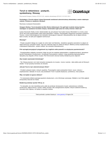 Toruń w reklamówce - poetycki, symboliczny, filmowy 10-09-03 13:13 Toruń w reklamówce - poetycki, symboliczny, filmowy Rozmawiał Grzegorz Giedrys 2010-01-20, ostatnia aktualizacja 2010-01-19 16:51:35.0 Pochodzący z Torunia reżyser Łukasz Karwowski zrealizował czterominutową reklamówkę o swoim rodzinnym mieście. Premiera w weekend w Brukseli Rozmowa z Łukaszem Karwowskim Grzegorz Giedrys: Toruń doczekał się kilku filmów reklamowych. Na ogół były to jednak obrazy banalne, stawiające na wysłużone toruńskie motywy. Zamierzałeś wyjść poza ten nudny schemat. Udało się? Łukasz Karwowski: Myślę, że tak. Zastanawiałem się, jak pokazać Toruń jakoś inaczej. Mieszkałem tu w końcu przez 20 lat i bez trudu przypomniałem sobie swoje dzieciństwo i młodość. Poszukiwałem nietypowych sposobów mówienia o Toruniu, o nieco mniej dostępnych ale niezwykle interesujących miejscach. Zdecydowaliśmy się na zdjęcia lotnicze. Było to trudne, nie tylko pod względem technicznym. Dlaczego? - Przede wszystkim dlatego że w ogóle nie wolno latać nad Starówką - dostaliśmy specjalne zezwolenie na zdjęcia od władz lotniczych i prezydent miasta. Tego typu realizacje nigdy nie należą do łatwych. Mieliśmy szansę współpracować z Bolesławem Radomskim - pilotem młodym, ale niezwykle doświadczonym. Film wymagał precyzyjnych przygotowań czy mogliście sobie pozwolić na artystyczną spontaniczność? - Przygotowaliśmy dokładny scenariusz, długo się nad nim wspólnie zastanawiałem z współpracownikami: operatorem kamery Radosławem Drozdowiczem, montażystą Przemysławem Lisakiem i moją asystentką Agnieszką Bartuzi. Specjalną rolę odegrała w filmie muzyka. Piotr Komorowski stworzył ścieżkę dźwiękową przez zdjęciami. Aby muzyka wyznaczyła dramaturgię? - Tak. Muszę przyznać, że to było korzystne rozwiązanie, bo muzyka - mocna i szeroka - dała wielkie pole do filmowych działań. To był wyrazisty komentarz do obrazów. Jaki jest Toruń w tym czterominutowym filmie? - Chciałem pokazać miasto z różnych aspektów. Poszczególne części poświęciłem historii, nauce, kulturze i współczesności. Zależało mi na tym, aby przedstawić Toruń w sposób artystyczny, symboliczny, nieco poetycki. Więc nie będzie to typowa reklama? - To nowoczesna reklama operująca językiem artystycznym, a nie informacją i perswazją. Oddałem w tym filmie głęboki emocjonalny stosunek do miasta. Budżet tej produkcji wyniósł 100 tys. zł. - To niezwykłe, że w tak niewielkiej sumie udało się zamknąć skompowanie muzyki, wykonanie jej z orkiestrą symfoniczną, zdjęcia lotnicze, montaż i efekty wizualne. Bez zaangażowania artystów, których codzienne stawki są normalnie dużo większe, nie byłoby to wszystko możliwe. Tekst pochodzi z portalu Gazeta.pl - www.gazeta.pl © Agora SA http://torun.gazeta.pl/torun/2029020,93025,7472138.html?sms_code= Strona 1 z 1